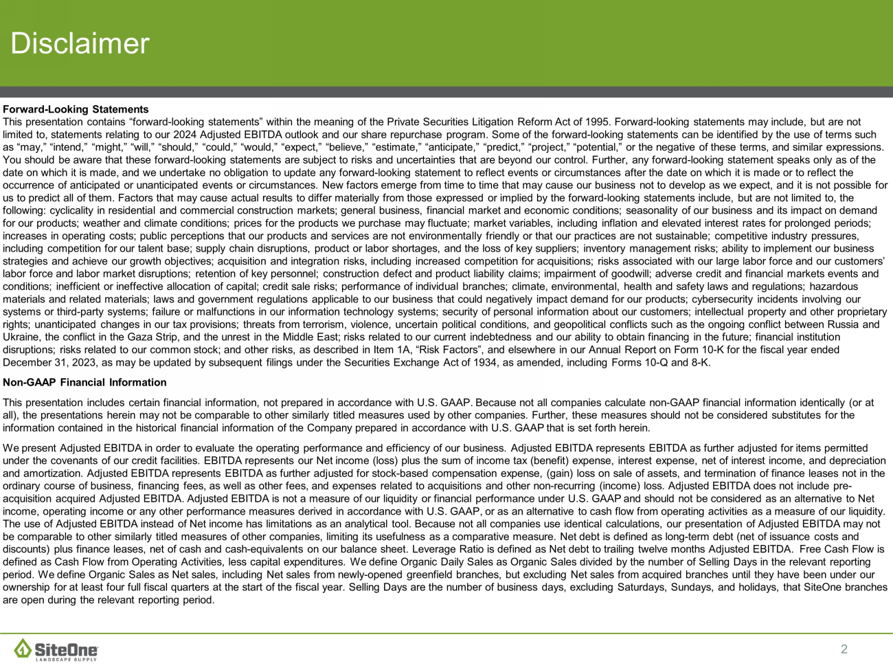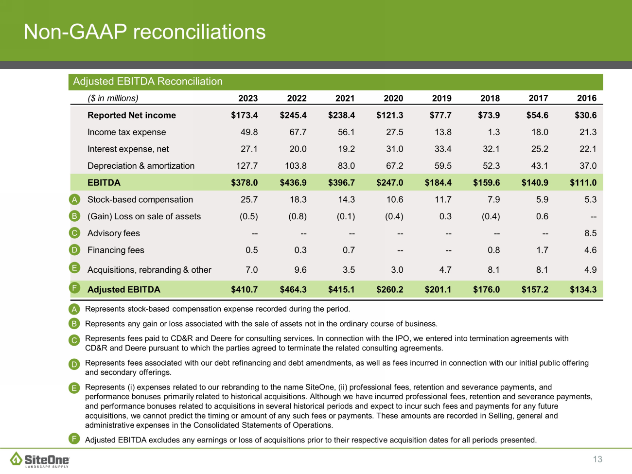 13 ($ in millions) 2023 2022 2021 2020 2019 2018 2017 2016 Reported Net income $173.4 $245.4 $238.4 $121.3 $77.7 $73.9 $54.6 $30.6 Income tax expense 49.8 67.7 56.1 27.5 13.8 1.3 18.0 21.3 Interest expense, net 27.1 20.0 19.2 31.0 33.4 32.1 25.2 22.1 Depreciation & amortization 127.7 103.8 83.0 67.2 59.5 52.3 43.1 37.0 EBITDA $378.0 $436.9 $396.7 $247.0 $184.4 $159.6 $140.9 $111.0 Stock - based compensation 25.7 18.3 14.3 10.6 11.7 7.9 5.9 5.3 (Gain) Loss on sale of assets (0.5) (0.8) (0.1) (0.4) 0.3 (0.4) 0.6 -- Advisory fees -- -- -- -- -- -- -- 8.5 Financing fees 0.5 0.3 0.7 -- -- 0.8 1.7 4.6 Acquisitions, rebranding & other 7.0 9.6 3.5 3.0 4.7 8.1 8.1 4.9 Adjusted EBITDA $410.7 $464.3 $415.1 $260.2 $201.1 $176.0 $157.2 $134.3 Non - GAAP reconciliations Represents stock - based compensation expense recorded during the period. Represents any gain or loss associated with the sale of assets not in the ordinary course of business. Represents fees paid to CD&R and Deere for consulting services. In connection with the IPO, we entered into termination agree men ts with CD&R and Deere pursuant to which the parties agreed to terminate the related consulting agreements. Represents fees associated with our debt refinancing and debt amendments, as well as fees incurred in connection with our ini tia l public offering and secondary offerings. Represents ( i ) expenses related to our rebranding to the name SiteOne, (ii) professional fees, retention and severance payments, and performance bonuses primarily related to historical acquisitions. Although we have incurred professional fees, retention and sev erance payments, and performance bonuses related to acquisitions in several historical periods and expect to incur such fees and payments for any future acquisitions, we cannot predict the timing or amount of any such fees or payments. These amounts are recorded in Selling, gen era l and administrative expenses in the Consolidated Statements of Operations. Adjusted EBITDA excludes any earnings or loss of acquisitions prior to their respective acquisition dates for all periods pre sen ted. A B C D A B C D E E F F Adjusted EBITDA Reconciliation