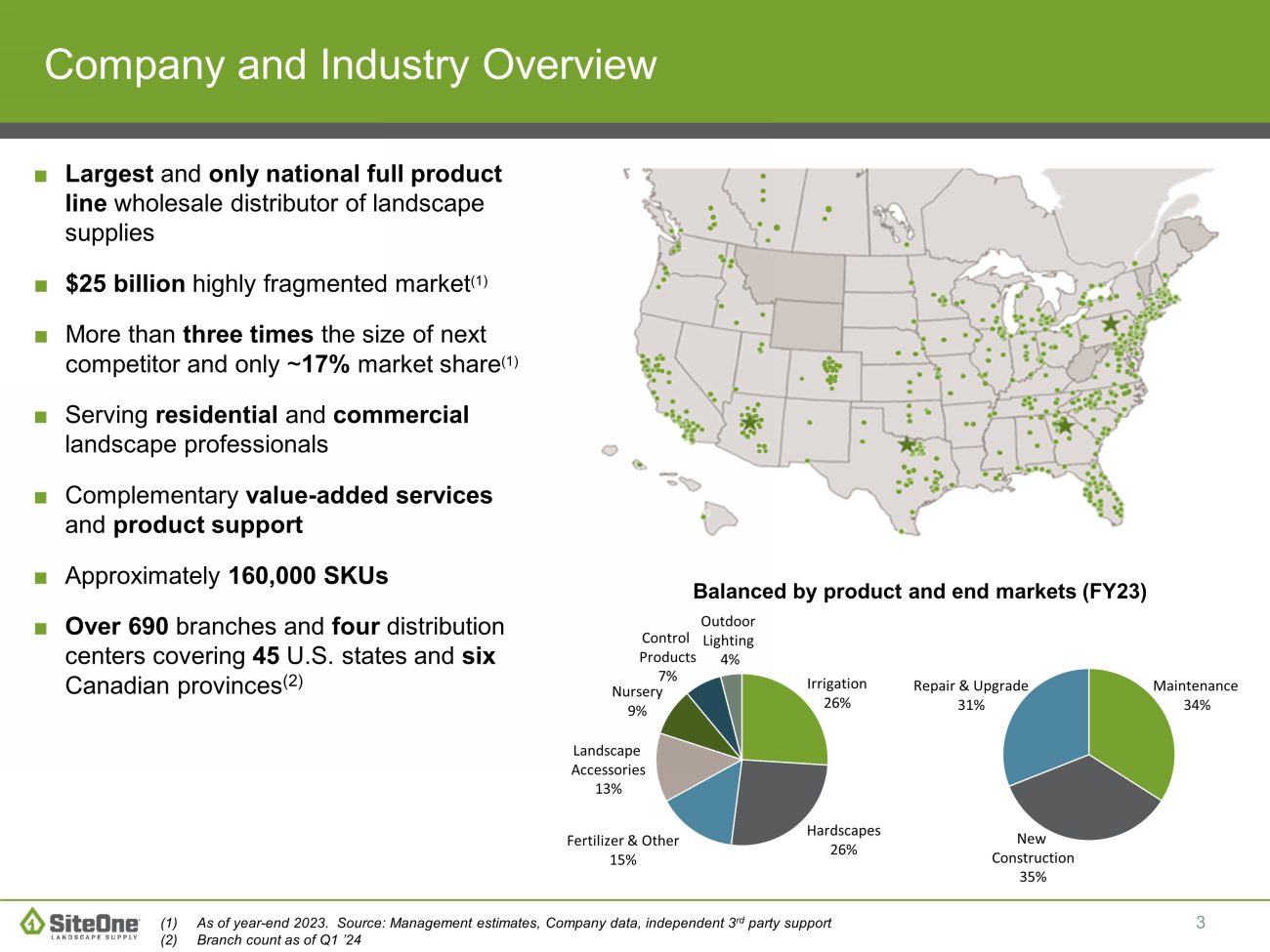 3 Company and Industry Overview ■ Largest and only national full product line wholesale distributor of landscape supplies ■ $25 billion highly fragmented market (1) ■ More than three times the size of next competitor and only ~ 17% market share (1) ■ Serving residential and commercial landscape professionals ■ Complementary value - added services and product support ■ Approximately 160,000 SKUs ■ Over 690 branches and four distribution centers covering 45 U.S. states and six Canadian provinces (2) Balanced by product and end markets (FY23) (1) As of year - end 2023. Source: Management estimates, Company data, independent 3 rd party support (2) Branch count a s of Q1 ’24 Maintenance 34 % New Construction 35% Repair & Upgrade 31% Landscape Accessories 13% Irrigation 26% Fertilizer & Other 15% Hardscapes 26% Nursery 9% Control Products 7% Outdoor Lighting 4%