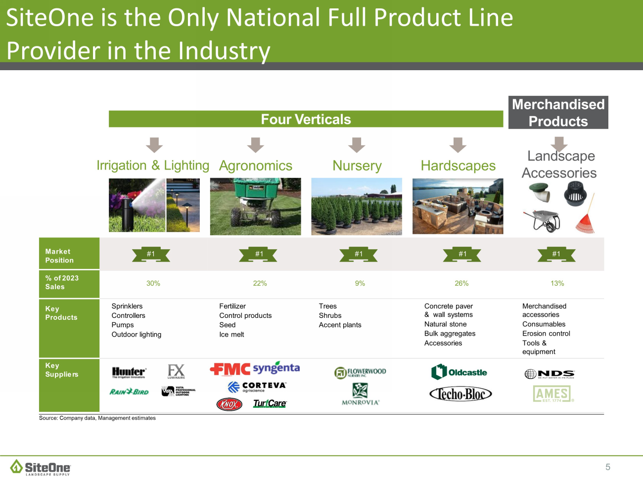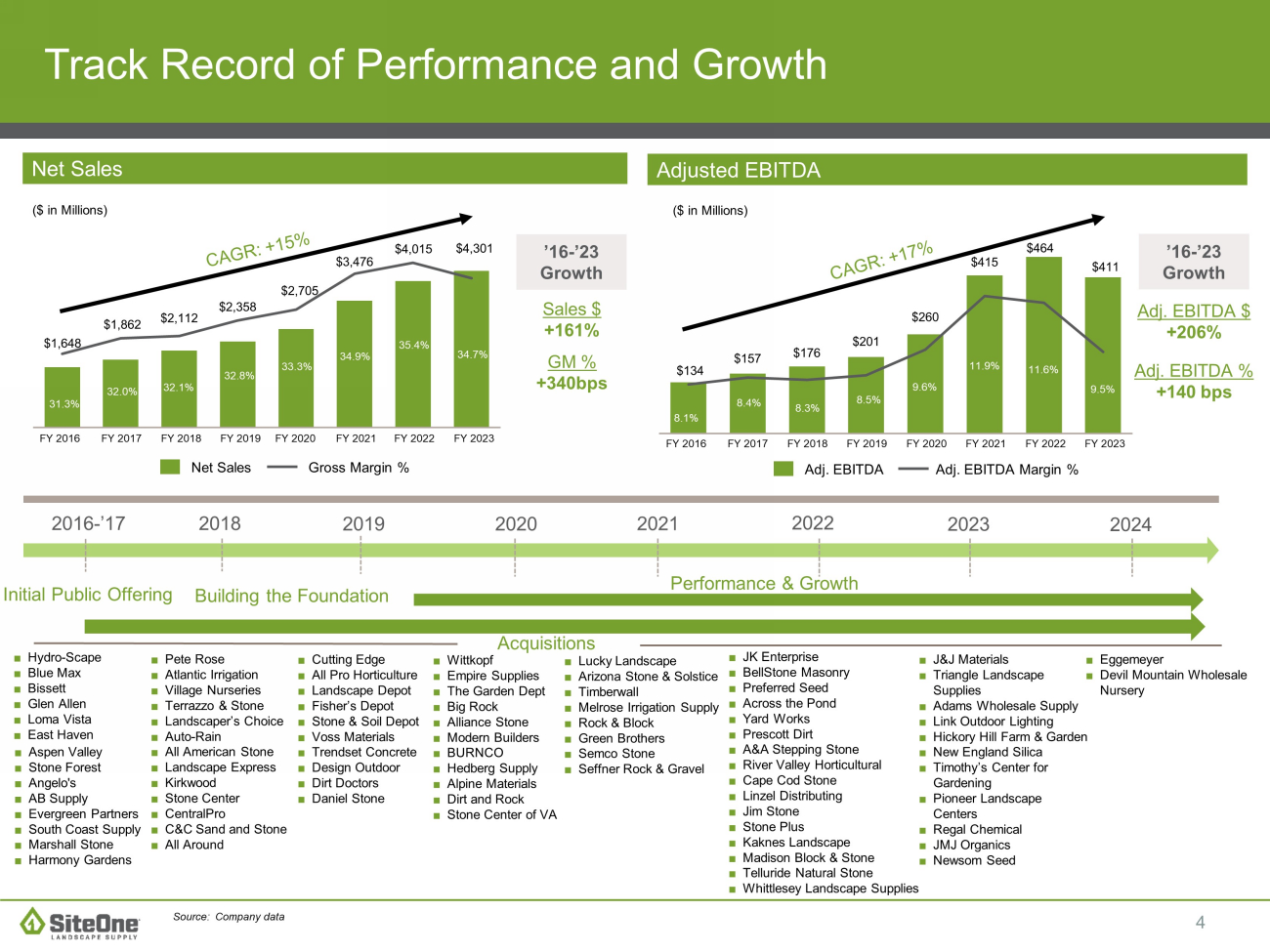 4 $134 $157 $176 $201 $260 $415 $464 $411 ■ Lucky Landscape ■ Arizona Stone & Solstice ■ Timberwall ■ Melrose Irrigation Supply ■ Rock & Block ■ Green Brothers ■ Semco Stone ■ Seffner Rock & Gravel $1,648 $1,862 $2,112 $2,358 $2,705 $3,476 $4,015 $4,301 Track Record of Performance and Growth ■ Hydro - Scape ■ Blue Max ■ Bissett ■ Glen Allen ■ Loma Vista ■ East Haven ■ Aspen Valley ■ Stone Forest ■ Angelo's ■ AB Supply ■ Evergreen Partners ■ South Coast Supply ■ Marshall Stone ■ Harmony Gardens Building the Foundation ■ Pete Rose ■ Atlantic Irrigation ■ Village Nurseries ■ Terrazzo & Stone ■ Landscaper’s Choice ■ Auto - Rain ■ All American Stone ■ Landscape Express ■ Kirkwood ■ Stone Center ■ CentralPro ■ C&C Sand and Stone ■ All Around Source: Company data 2018 2016 - ’17 2019 2020 Initial Public Offering 32.0% 31.3% 32.1% Net Sales Gross Margin % Adj. EBITDA Adj. EBITDA Margin % Sales $ +161% GM % +340bps Performance & Growth ($ in Millions) Net Sales Adjusted EBITDA ’16 - ’23 Growth 32.8% ■ Cutting Edge ■ All Pro Horticulture ■ Landscape Depot ■ Fisher’s Depot ■ Stone & Soil Depot ■ Voss Materials ■ Trendset Concrete ■ Design Outdoor ■ Dirt Doctors ■ Daniel Stone 2021 2022 ■ Wittkopf ■ Empire Supplies ■ The Garden Dept ■ Big Rock ■ Alliance Stone ■ Modern Builders ■ BURNCO ■ Hedberg Supply ■ Alpine Materials ■ Dirt and Rock ■ Stone Center of VA 33.3% 8.4% 8.1% FY 2017 8.3% FY 2018 ($ in Millions) Adj. EBITDA $ +206% Adj. EBITDA % +140 bps ’16 - ’23 Growth 8.5% FY 2019 9.6% Acquisitions 2023 34.9% 11.9% FY 2021 FY 2016 2024 ■ JK Enterprise ■ BellStone Masonry ■ Preferred Seed ■ Across the Pond ■ Yard Works ■ Prescott Dirt ■ A&A Stepping Stone ■ River Valley Horticultural ■ Cape Cod Stone ■ Linzel Distributing ■ Jim Stone ■ Stone Plus ■ Kaknes Landscape ■ Madison Block & Stone ■ Telluride Natural Stone ■ Whittlesey Landscape Supplies 35.4% FY 2023 11.6% FY 2020 ■ J&J Materials ■ Triangle Landscape Supplies ■ Adams Wholesale Supply ■ Link Outdoor Lighting ■ Hickory Hill Farm & Garden ■ New England Silica ■ Timothy’s Center for Gardening ■ Pioneer Landscape Centers ■ Regal Chemical ■ JMJ Organics ■ Newsom Seed 34.7% FY 2022 9.5% FY 2017 FY 2018 FY 2019 FY 2021 FY 2016 FY 2023 FY 2020 FY 2022 34.7% ■ Eggemeyer ■ Devil Mountain Wholesale Nursery