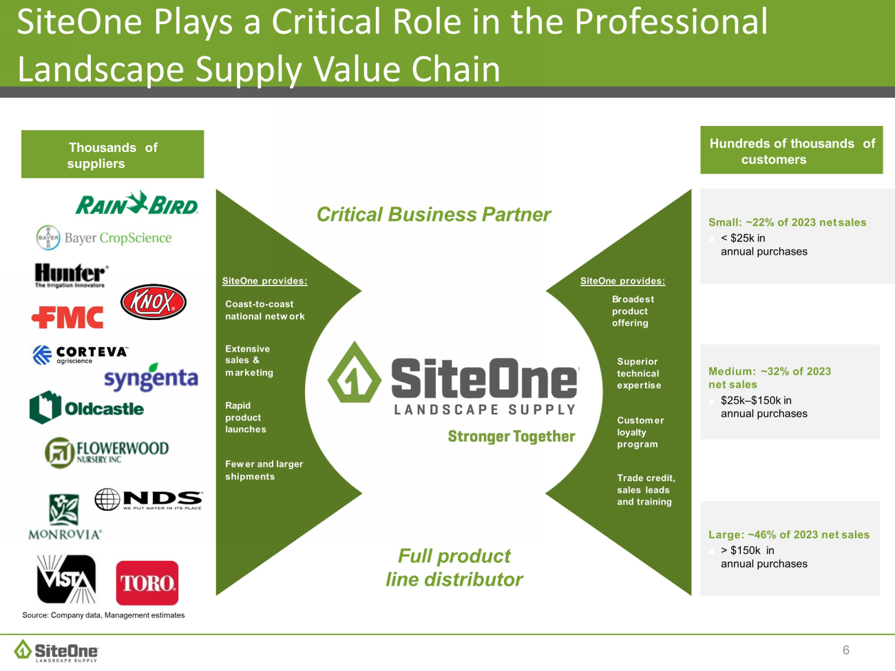 5 SiteOne is the Only National Full Product Line Provider in the Industry Market P o s i t i o n #1 #1 #1 #1 #1 % of 20 23 Sa les 30 % 2 2 % 9 % 26 % 1 3 % Key P roducts ■ Sprinklers ■ Controllers ■ Pumps ■ Outdoor lighting ■ Fertilizer ■ Control products ■ Seed ■ Ice melt ■ Trees ■ Shrubs ■ Accent plants ■ Concrete paver & wall systems ■ Natural stone ■ Bulk aggregates ■ Accessories ■ Merchandised accessories ■ Consumables ■ Erosion control ■ Tools & equipment Key S upp li e r s Source: Company data, Management estimates Irrigation & Lighting A grono m ics Nursery Hardscapes Landscape A cc e ss o r i e s Four Verticals Merchandised Products