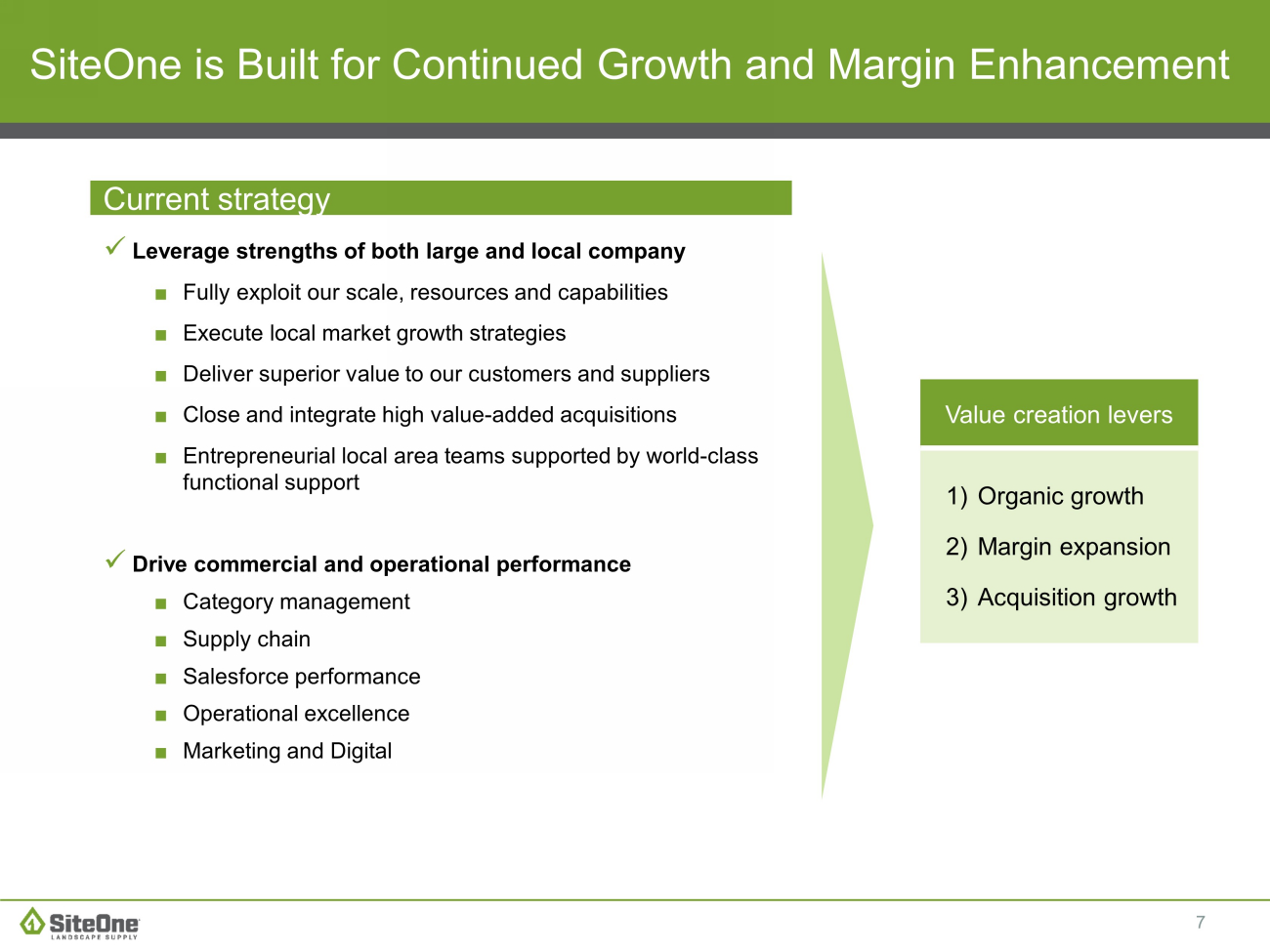 6 SiteOne Plays a Critical Role in the Professional Landscape Supply Value Chain Thousands of suppliers Hundreds of thousands of customers Large: ~ 46% of 20 23 net sales ■ > $150k in annual purchases Medium: ~3 2 % of 2 023 net sales ■ $25k – $150k in annual purchases Coast - to - coast national netw ork Extensive sales & m a r ke t i n g Rapid product l a un c h e s Few er and larger shipments Superior technical e x p e r t i s e C u s to m e r loyalty program Trade credit, sales leads and training SiteOne provides: SiteOne provides: B r o a d es t product offering Critical Business Partner Small: ~2 2 % of 20 23 net sales ■ < $25 k in annual purchases Full product line distributor Source: Company data, Management estimates