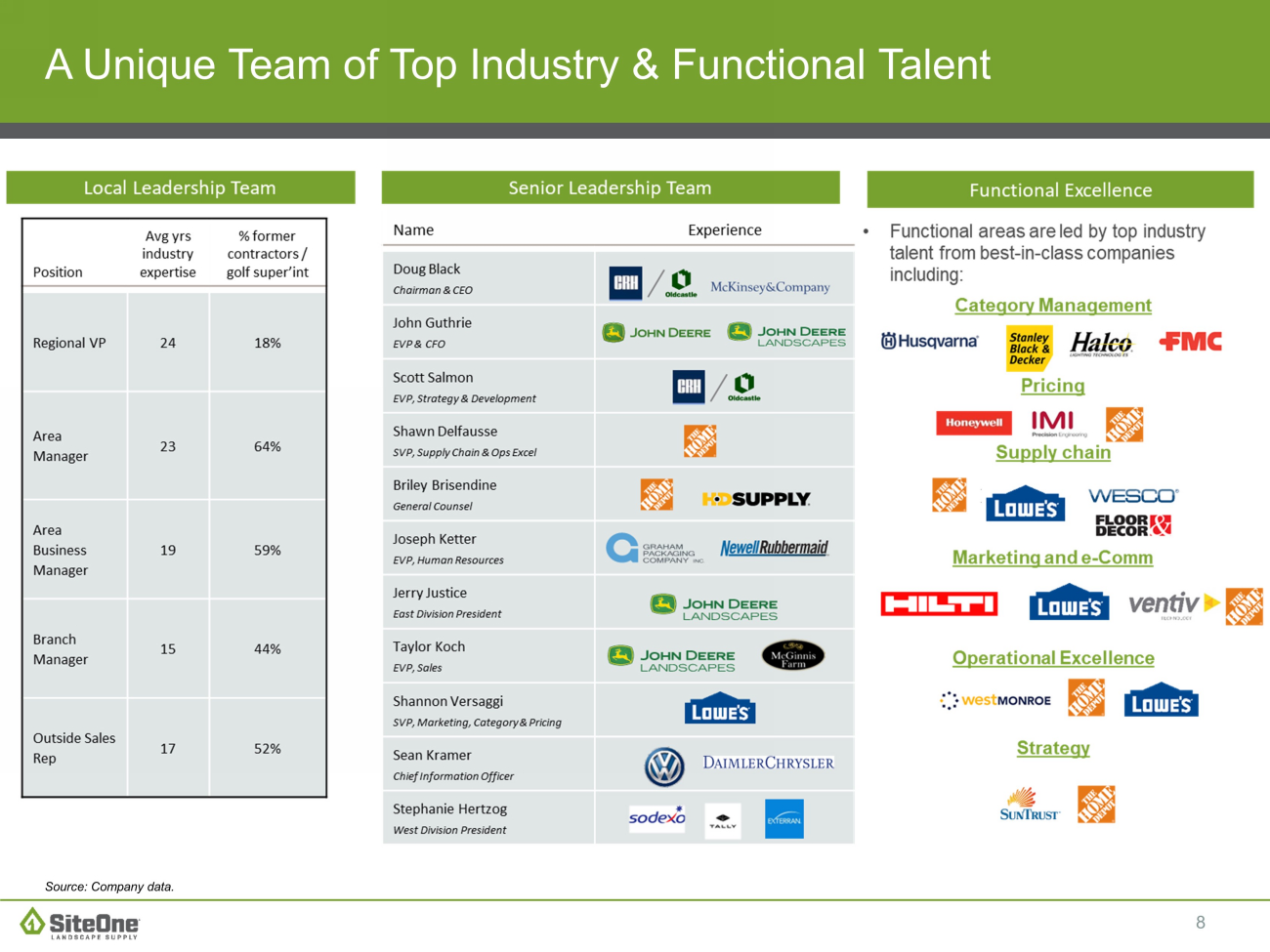 7 SiteOne is Built for Continued Growth and Margin Enhancement Current strategy x Leverage strengths of both large and local company ■ Fully exploit our scale, resources and capabilities ■ Execute local market growth strategies ■ Deliver superior value to our customers and suppliers ■ Close and integrate high value - added acquisitions ■ Entrepreneurial local area teams supported by world - class functional support x Drive commercial and operational performance ■ Category management ■ Supply chain ■ Salesforce performance ■ Operational excellence ■ Marketing and Digital Value creation levers 1) Organic growth 2) Margin expansion 3) Acquisition growth