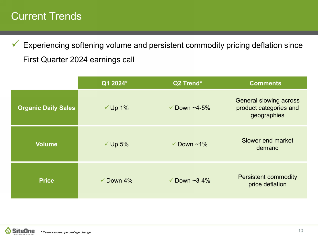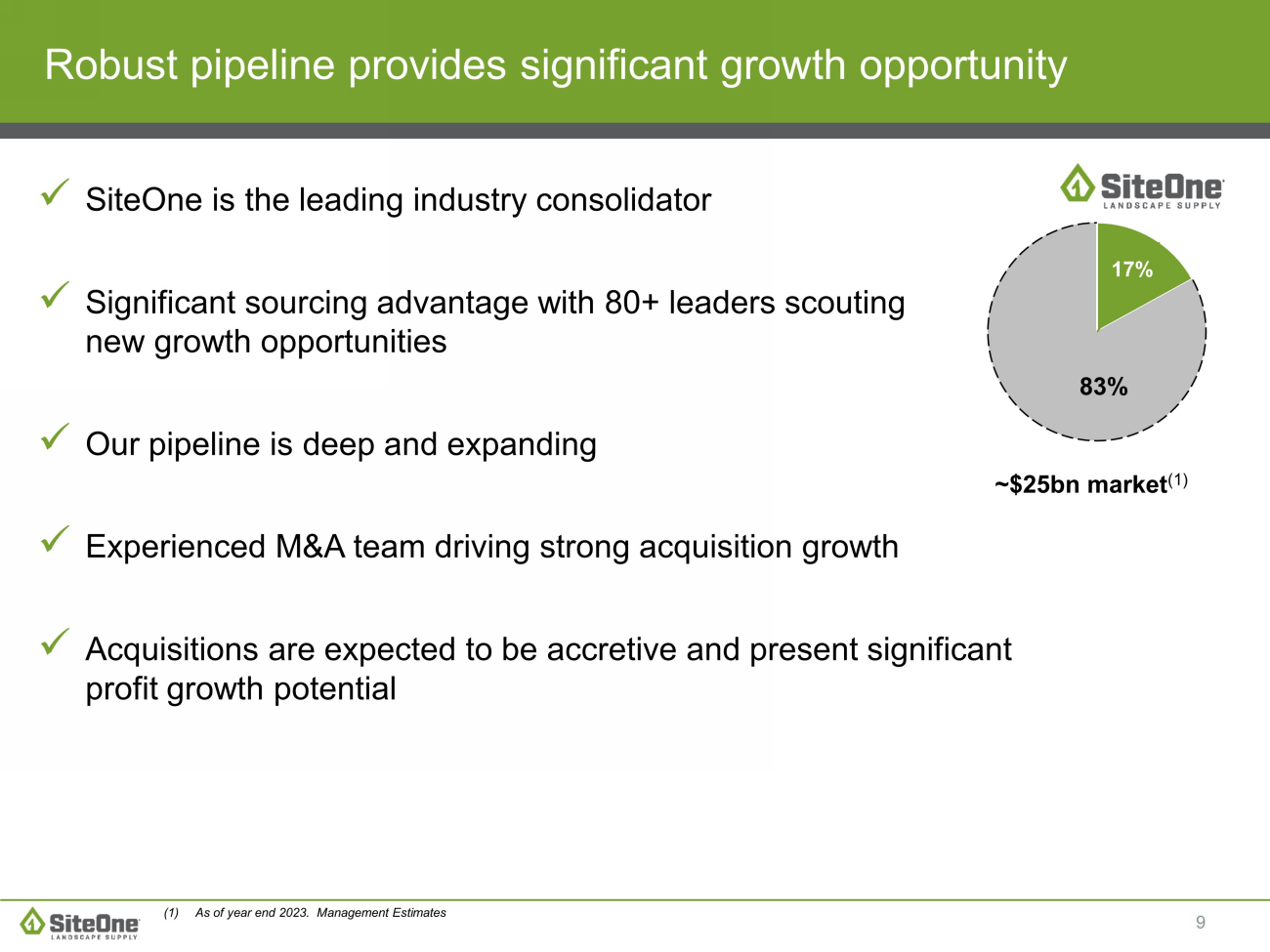 9 x SiteOne is the leading industry consolidator x Significant sourcing advantage with 80+ leaders scouting new growth opportunities x Our pipeline is deep and expanding x Experienced M&A team driving strong acquisition growth x Acquisitions are expected to be accretive and present significant profit growth potential Robust pipeline provides significant growth opportunity 17% (1) As of year end 2023. Management Estimates ~$25bn market (1) 83%