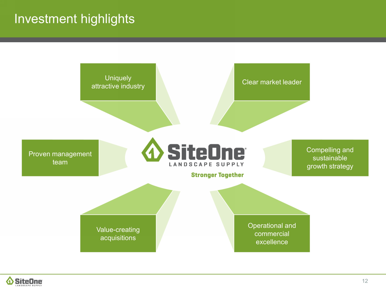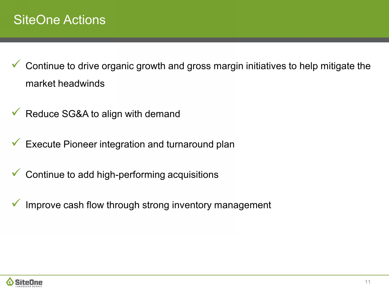 11 x Continue to drive organic growth and gross margin initiatives to help mitigate the market headwinds x Reduce SG&A to align with demand x Execute Pioneer integration and turnaround plan x Continue to add high - performing acquisitions x Improve cash flow through strong inventory management SiteOne Actions