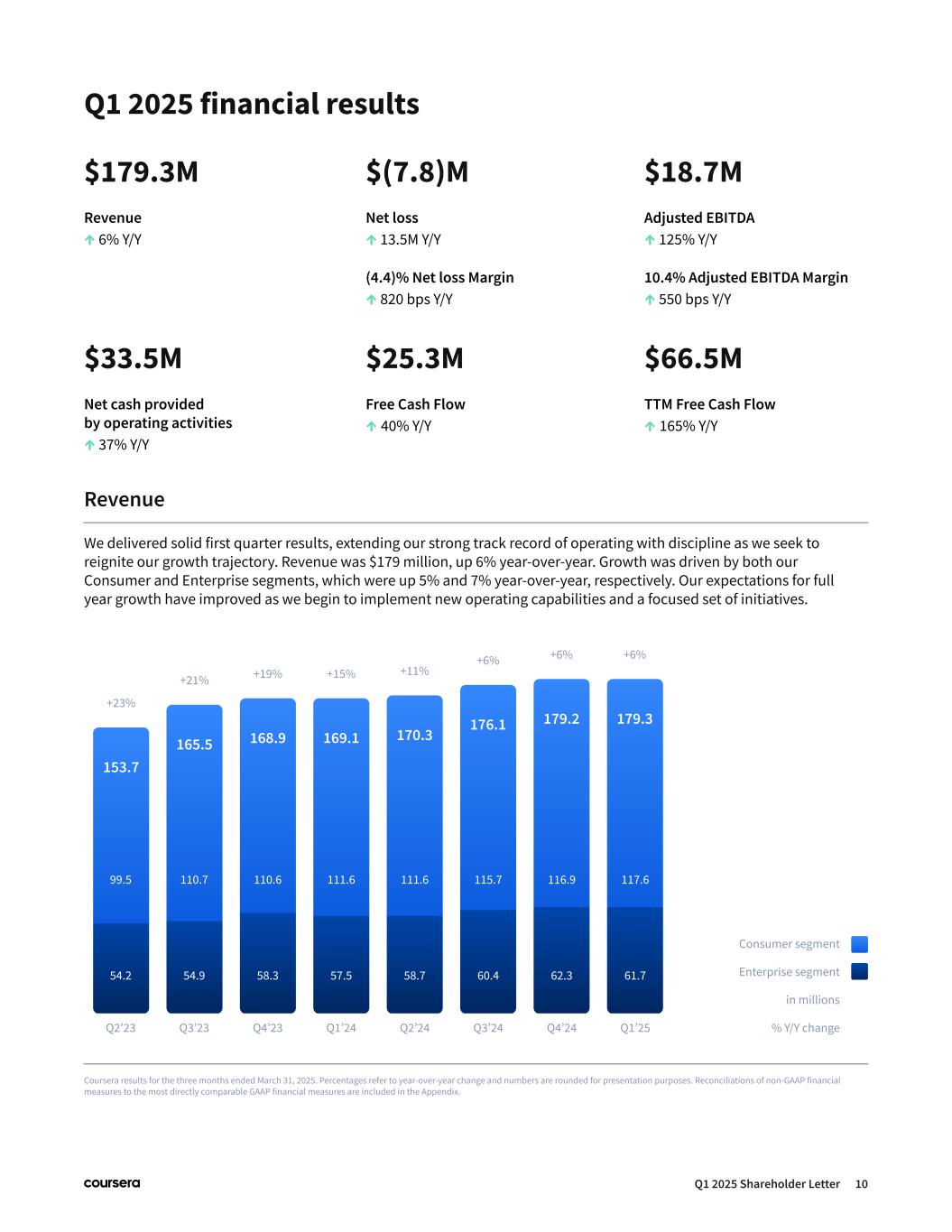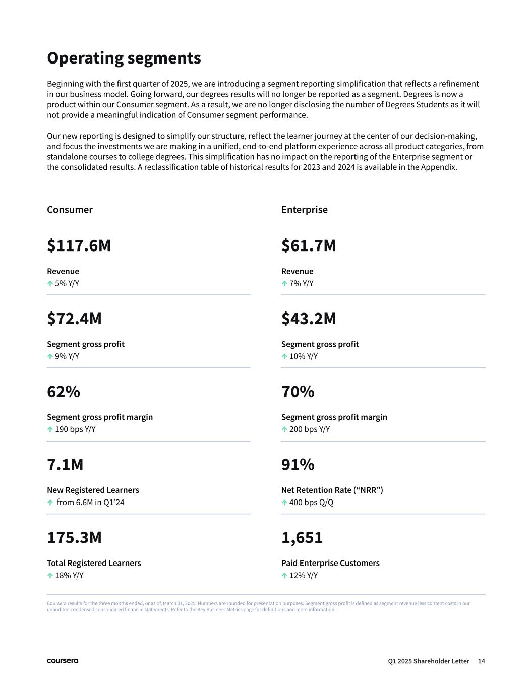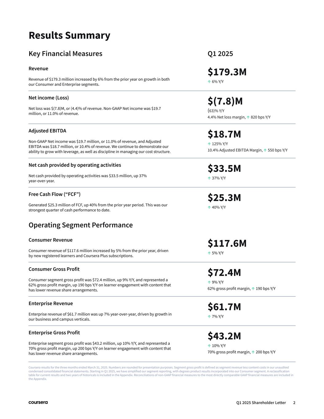 Results Summary Coursera results for the three months ended March 31, 2025. Numbers are rounded for presentation purposes. Segment gross profit is defined as segment revenue less content costs in our unaudited condensed consolidated financial statements. Starting in Q1 2025, we have simplified our segment reporting, with degrees product results incorporated into our Consumer segment. A reclassification table for current results and two years of historicals is included in the Appendix. Reconciliations of non-GAAP financial measures to the most directly comparable GAAP financial measures are included in the Appendix. Q1 2025 Shareholder Letter 2 Key Financial Measures Q1 2025 Revenue Revenue of $179.3 million increased by 6% from the prior year on growth in both our Consumer and Enterprise segments. $179.3M ↑ 6% Y/Y Net income (Loss) Net loss was $(7.8)M, or (4.4)% of revenue. Non-GAAP Net income was $19.7 million, or 11.0% of revenue. $(7.8)M (63)% Y/Y 4.4% Net loss margin, ↑ 820 bps Y/Y Adjusted EBITDA Non-GAAP Net income was $19.7 million, or 11.0% of revenue, and Adjusted EBITDA was $18.7 million, or 10.4% of revenue. We continue to demonstrate our ability to grow with leverage, as well as discipline in managing our cost structure. $18.7M ↑ 125% Y/Y 10.4% Adjusted EBITDA Margin, ↑ 550 bps Y/Y Net cash provided by operating activities Net cash provided by operating activities was $33.5 million, up 37% year-over-year. $33.5M ↑ 37% Y/Y Free Cash Flow (“FCF”) Generated $25.3 million of FCF, up 40% from the prior year period. This was our strongest quarter of cash performance to date. $25.3M ↑ 40% Y/Y Operating Segment Performance Consumer Revenue Consumer revenue of $117.6 million increased by 5% from the prior year, driven by new registered learners and Coursera Plus subscriptions. $117.6M ↑ 5% Y/Y Consumer Gross Profit Consumer segment gross profit was $72.4 million, up 9% Y/Y, and represented a 62% gross profit margin, up 190 bps Y/Y on learner engagement with content that has lower revenue share arrangements. $72.4M ↑ 9% Y/Y 62% gross profit margin, ↑ 190 bps Y/Y Enterprise Revenue Enterprise revenue of $61.7 million was up 7% year-over-year, driven by growth in our business and campus verticals. $61.7M ↑ 7% Y/Y Enterprise Gross Profit Enterprise segment gross profit was $43.2 million, up 10% Y/Y, and represented a 70% gross profit margin, up 200 bps Y/Y on learner engagement with content that has lower revenue share arrangements. $43.2M ↑ 10% Y/Y 70% gross profit margin, ↑ 200 bps Y/Y
