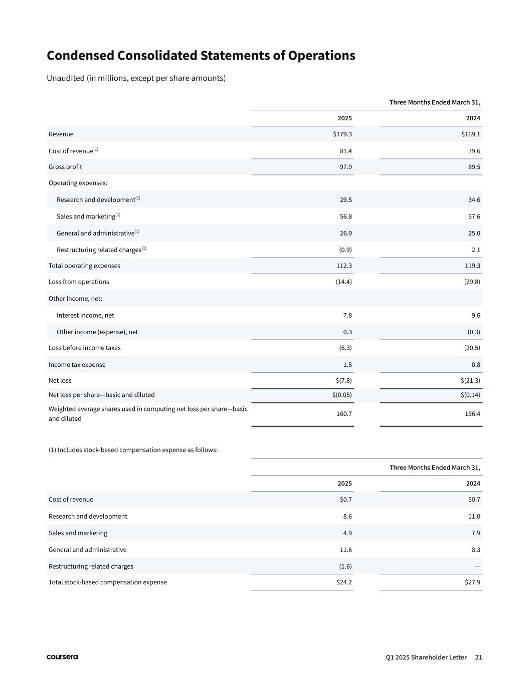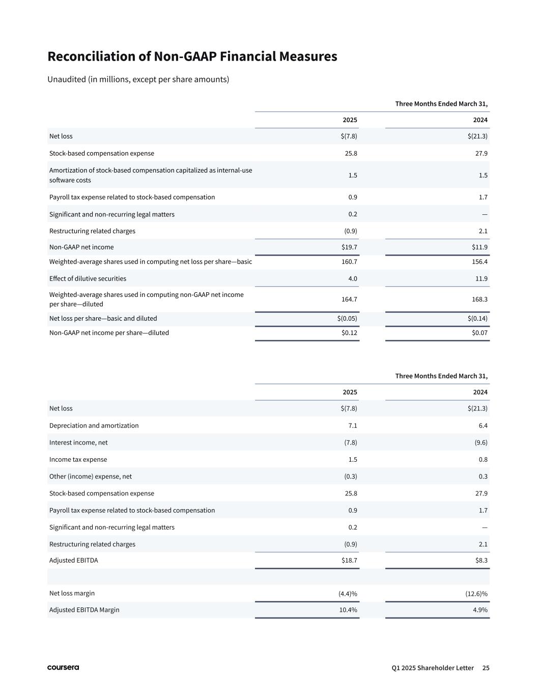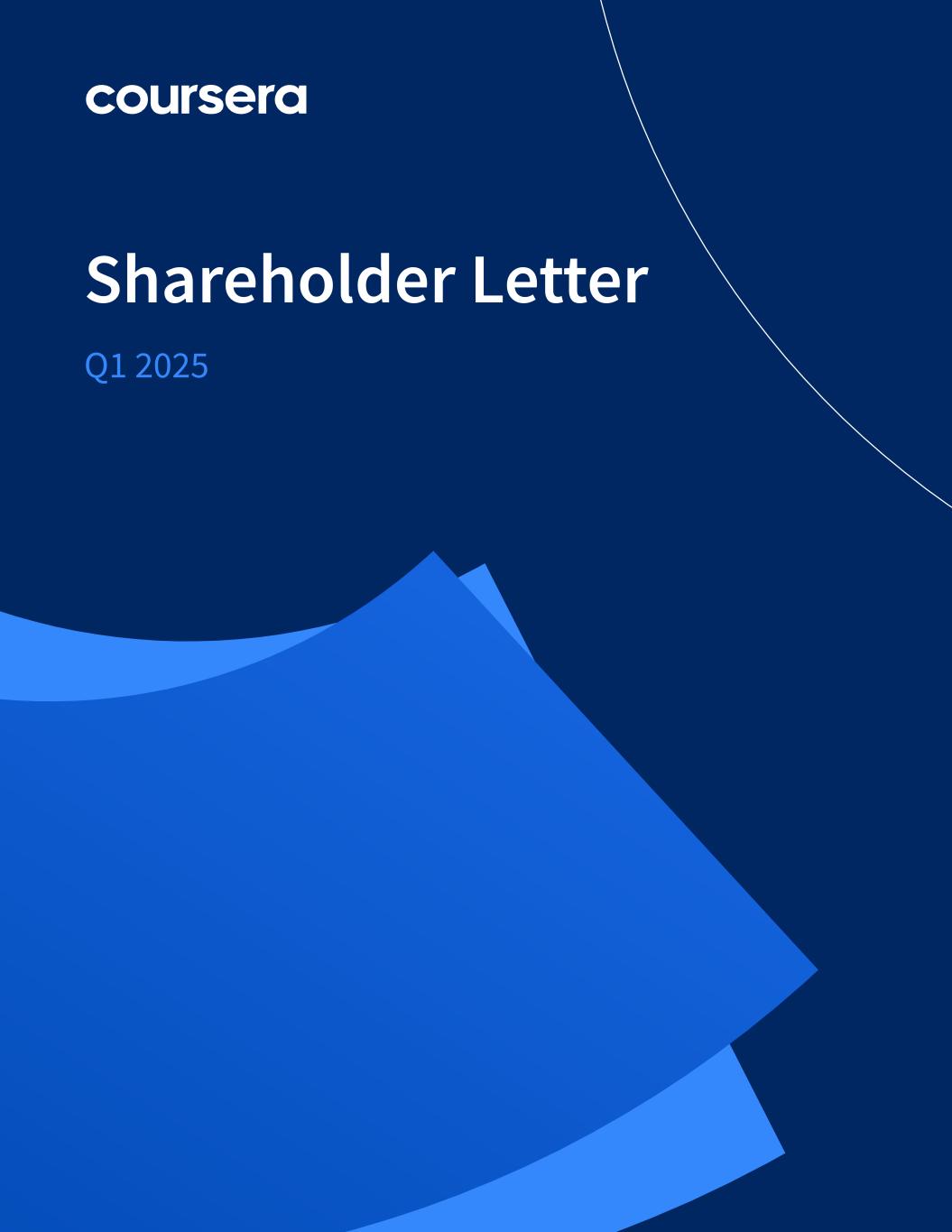 Results Summary Coursera results for the three months ended March 31, 2025. Numbers are rounded for presentation purposes. Segment gross profit is defined as segment revenue less content costs in our unaudited condensed consolidated financial statements. Starting in Q1 2025, we have simplified our segment reporting, with degrees product results incorporated into our Consumer segment. A reclassification table for current results and two years of historicals is included in the Appendix. Reconciliations of non-GAAP financial measures to the most directly comparable GAAP financial measures are included in the Appendix. Q1 2025 Shareholder Letter 2 Key Financial Measures Q1 2025 Revenue Revenue of $179.3 million increased by 6% from the prior year on growth in both our Consumer and Enterprise segments. $179.3M ↑ 6% Y/Y Net income (Loss) Net loss was $(7.8)M, or (4.4)% of revenue. Non-GAAP Net income was $19.7 million, or 11.0% of revenue. $(7.8)M (63)% Y/Y 4.4% Net loss margin, ↑ 820 bps Y/Y Adjusted EBITDA Non-GAAP Net income was $19.7 million, or 11.0% of revenue, and Adjusted EBITDA was $18.7 million, or 10.4% of revenue. We continue to demonstrate our ability to grow with leverage, as well as discipline in managing our cost structure. $18.7M ↑ 125% Y/Y 10.4% Adjusted EBITDA Margin, ↑ 550 bps Y/Y Net cash provided by operating activities Net cash provided by operating activities was $33.5 million, up 37% year-over-year. $33.5M ↑ 37% Y/Y Free Cash Flow (“FCF”) Generated $25.3 million of FCF, up 40% from the prior year period. This was our strongest quarter of cash performance to date. $25.3M ↑ 40% Y/Y Operating Segment Performance Consumer Revenue Consumer revenue of $117.6 million increased by 5% from the prior year, driven by new registered learners and Coursera Plus subscriptions. $117.6M ↑ 5% Y/Y Consumer Gross Profit Consumer segment gross profit was $72.4 million, up 9% Y/Y, and represented a 62% gross profit margin, up 190 bps Y/Y on learner engagement with content that has lower revenue share arrangements. $72.4M ↑ 9% Y/Y 62% gross profit margin, ↑ 190 bps Y/Y Enterprise Revenue Enterprise revenue of $61.7 million was up 7% year-over-year, driven by growth in our business and campus verticals. $61.7M ↑ 7% Y/Y Enterprise Gross Profit Enterprise segment gross profit was $43.2 million, up 10% Y/Y, and represented a 70% gross profit margin, up 200 bps Y/Y on learner engagement with content that has lower revenue share arrangements. $43.2M ↑ 10% Y/Y 70% gross profit margin, ↑ 200 bps Y/Y
