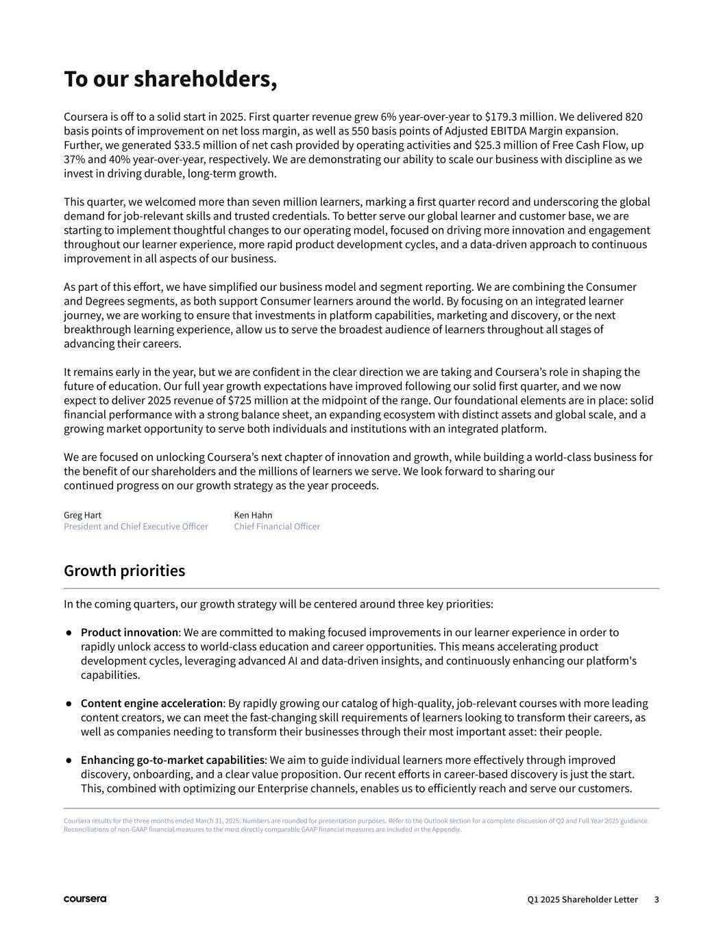 To our shareholders, Q1 2025 Shareholder Letter 3 Coursera is off to a solid start in 2025. First quarter revenue grew 6% year-over-year to $179.3 million. We delivered 820 basis points of improvement on net loss margin, as well as 550 basis points of Adjusted EBITDA Margin expansion. Further, we generated $33.5 million of net cash provided by operating activities and $25.3 million of Free Cash Flow, up 37% and 40% year-over-year, respectively. We are demonstrating our ability to scale our business with discipline as we invest in driving durable, long-term growth. This quarter, we welcomed more than seven million learners, marking a first quarter record and underscoring the global demand for job-relevant skills and trusted credentials. To better serve our global learner and customer base, we are starting to implement thoughtful changes to our operating model, focused on driving more innovation and engagement throughout our learner experience, more rapid product development cycles, and a data-driven approach to continuous improvement in all aspects of our business. As part of this effort, we have simplified our business model and segment reporting. We are combining the Consumer and Degrees segments, as both support Consumer learners around the world. By focusing on an integrated learner journey, we are working to ensure that investments in platform capabilities, marketing and discovery, or the next breakthrough learning experience, allow us to serve the broadest audience of learners throughout all stages of advancing their careers. It remains early in the year, but we are confident in the clear direction we are taking and Courseraʼs role in shaping the future of education. Our full year growth expectations have improved following our solid first quarter, and we now expect to deliver 2025 revenue of $725 million at the midpoint of the range. Our foundational elements are in place: solid financial performance with a strong balance sheet, an expanding ecosystem with distinct assets and global scale, and a growing market opportunity to serve both individuals and institutions with an integrated platform. We are focused on unlocking Courseraʼs next chapter of innovation and growth, while building a world-class business for the benefit of our shareholders and the millions of learners we serve. We look forward to sharing our continued progress on our growth strategy as the year proceeds. Coursera results for the three months ended March 31, 2025. Numbers are rounded for presentation purposes. Refer to the Outlook section for a complete discussion of Q2 and Full Year 2025 guidance. Reconciliations of non-GAAP financial measures to the most directly comparable GAAP financial measures are included in the Appendix. Growth priorities In the coming quarters, our growth strategy will be centered around three key priorities: ● Product innovation: We are committed to making focused improvements in our learner experience in order to rapidly unlock access to world-class education and career opportunities. This means accelerating product development cycles, leveraging advanced AI and data-driven insights, and continuously enhancing our platform's capabilities. ● Content engine acceleration: By rapidly growing our catalog of high-quality, job-relevant courses with more leading content creators, we can meet the fast-changing skill requirements of learners looking to transform their careers, as well as companies needing to transform their businesses through their most important asset: their people. ● Enhancing go-to-market capabilities: We aim to guide individual learners more effectively through improved discovery, onboarding, and a clear value proposition. Our recent efforts in career-based discovery is just the start. This, combined with optimizing our Enterprise channels, enables us to efficiently reach and serve our customers. Greg Hart President and Chief Executive Officer Ken Hahn Chief Financial Officer