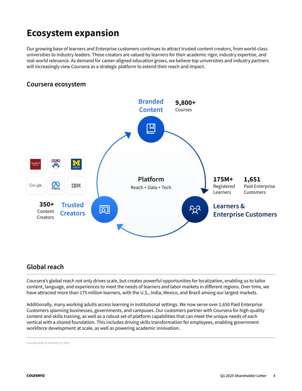 Platform Reach + Data + Tech Ecosystem expansion Q1 2025 Shareholder Letter 4 Our growing base of learners and Enterprise customers continues to attract trusted content creators, from world-class universities to industry leaders. These creators are valued by learners for their academic rigor, industry expertise, and real-world relevance. As demand for career-aligned education grows, we believe top universities and industry partners will increasingly view Coursera as a strategic platform to extend their reach and impact. Coursera ecosystem Coursera data as of March 31, 2025. Global reach Courseraʼs global reach not only drives scale, but creates powerful opportunities for localization, enabling us to tailor content, language, and experiences to meet the needs of learners and labor markets in different regions. Over time, we have attracted more than 175 million learners, with the U.S., India, Mexico, and Brazil among our largest markets. Additionally, many working adults access learning in institutional settings. We now serve over 1,650 Paid Enterprise Customers spanning businesses, governments, and campuses. Our customers partner with Coursera for high-quality content and skills training, as well as a robust set of platform capabilities that can meet the unique needs of each vertical with a shared foundation. This includes driving skills transformation for employees, enabling government workforce development at scale, as well as powering academic innovation. Branded Content Trusted Creators Learners & Enterprise Customers 350+ Content Creators 175M+ Registered Learners 1,651 Paid Enterprise Customers 9,800+ Courses