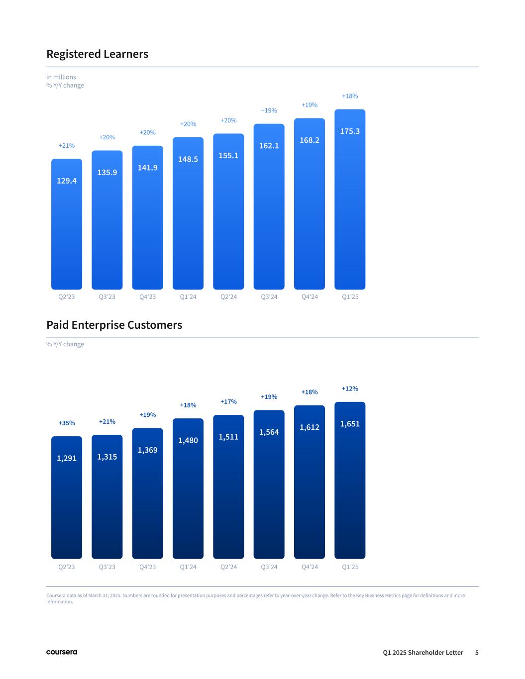 +18% +19% +19% +20%+20% +20% +20% +21% Q1 2025 Shareholder Letter 5 Q2ʼ23 Q3ʼ23 Q4ʼ23 Q1ʼ24 Q2ʼ24 Q3ʼ24 Q4ʼ24 Q1ʼ25 1,6511,6121,5641,5111,480 1,369 1,3151,291 Q2ʼ23 Q3ʼ23 Q4ʼ23 Q1ʼ24 Q2ʼ24 Q3ʼ24 Q4ʼ24 Q1ʼ25 175.3 168.2162.1 155.1148.5 141.9135.9 129.4 Paid Enterprise Customers % Y/Y change Registered Learners in millions % Y/Y change Coursera data as of March 31, 2025. Numbers are rounded for presentation purposes and percentages refer to year-over-year change. Refer to the Key Business Metrics page for definitions and more information. +12%+18% +19% +17%+18% +19% +21%+35%