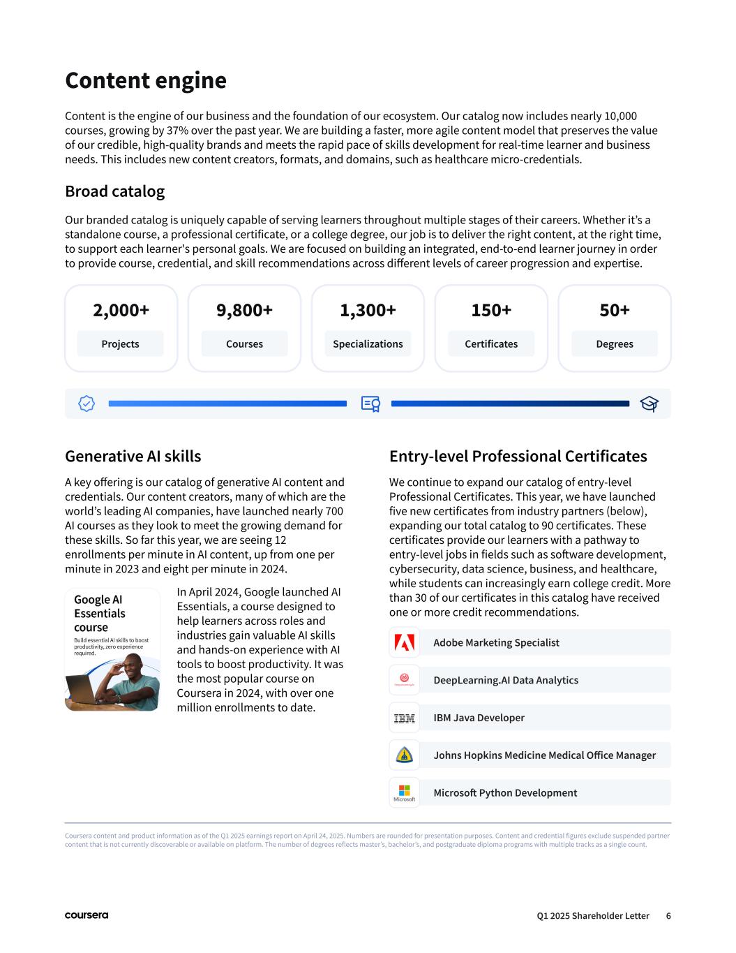Adobe Marketing Specialist Content engine Coursera content and product information as of the Q1 2025 earnings report on April 24, 2025. Numbers are rounded for presentation purposes. Content and credential figures exclude suspended partner content that is not currently discoverable or available on platform. The number of degrees reflects masterʼs, bachelorʼs, and postgraduate diploma programs with multiple tracks as a single count. Q1 2025 Shareholder Letter 6 Content is the engine of our business and the foundation of our ecosystem. Our catalog now includes nearly 10,000 courses, growing by 37% over the past year. We are building a faster, more agile content model that preserves the value of our credible, high-quality brands and meets the rapid pace of skills development for real-time learner and business needs. This includes new content creators, formats, and domains, such as healthcare micro-credentials. Broad catalog Our branded catalog is uniquely capable of serving learners throughout multiple stages of their careers. Whether itʼs a standalone course, a professional certificate, or a college degree, our job is to deliver the right content, at the right time, to support each learner's personal goals. We are focused on building an integrated, end-to-end learner journey in order to provide course, credential, and skill recommendations across different levels of career progression and expertise. 2,000+ 9,800+ 1,300+ 150+ 50+ Projects Courses Specializations Certificates Degrees Generative AI skills A key offering is our catalog of generative AI content and credentials. Our content creators, many of which are the worldʼs leading AI companies, have launched nearly 700 AI courses as they look to meet the growing demand for these skills. So far this year, we are seeing 12 enrollments per minute in AI content, up from one per minute in 2023 and eight per minute in 2024. In April 2024, Google launched AI Essentials, a course designed to help learners across roles and industries gain valuable AI skills and hands-on experience with AI tools to boost productivity. It was the most popular course on Coursera in 2024, with over one million enrollments to date. Entry-level Professional Certificates We continue to expand our catalog of entry-level Professional Certificates. This year, we have launched five new certificates from industry partners (below), expanding our total catalog to 90 certificates. These certificates provide our learners with a pathway to entry-level jobs in fields such as software development, cybersecurity, data science, business, and healthcare, while students can increasingly earn college credit. More than 30 of our certificates in this catalog have received one or more credit recommendations. DeepLearning.AI Data Analytics IBM Java Developer Microsoft Python Development Johns Hopkins Medicine Medical Office Manager
