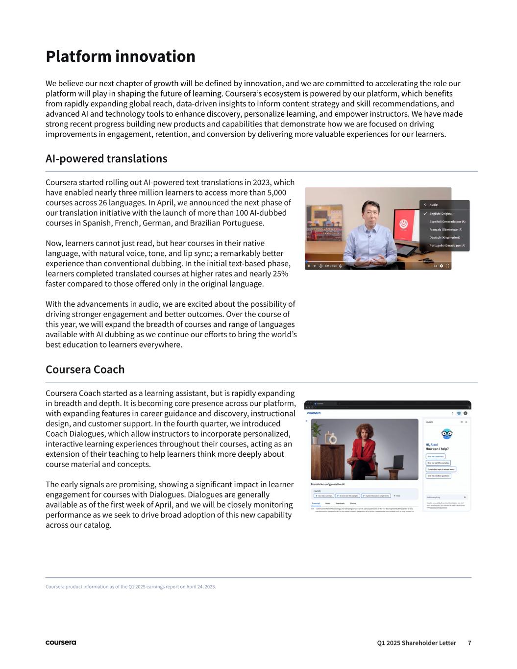 Platform innovation Coursera product information as of the Q1 2025 earnings report on April 24, 2025. Q1 2025 Shareholder Letter 7 We believe our next chapter of growth will be defined by innovation, and we are committed to accelerating the role our platform will play in shaping the future of learning. Courseraʼs ecosystem is powered by our platform, which benefits from rapidly expanding global reach, data-driven insights to inform content strategy and skill recommendations, and advanced AI and technology tools to enhance discovery, personalize learning, and empower instructors. We have made strong recent progress building new products and capabilities that demonstrate how we are focused on driving improvements in engagement, retention, and conversion by delivering more valuable experiences for our learners. AI-powered translations Coursera started rolling out AI-powered text translations in 2023, which have enabled nearly three million learners to access more than 5,000 courses across 26 languages. In April, we announced the next phase of our translation initiative with the launch of more than 100 AI-dubbed courses in Spanish, French, German, and Brazilian Portuguese. Now, learners cannot just read, but hear courses in their native language, with natural voice, tone, and lip sync; a remarkably better experience than conventional dubbing. In the initial text-based phase, learners completed translated courses at higher rates and nearly 25% faster compared to those offered only in the original language. With the advancements in audio, we are excited about the possibility of driving stronger engagement and better outcomes. Over the course of this year, we will expand the breadth of courses and range of languages available with AI dubbing as we continue our efforts to bring the worldʼs best education to learners everywhere. Coursera Coach Coursera Coach started as a learning assistant, but is rapidly expanding in breadth and depth. It is becoming core presence across our platform, with expanding features in career guidance and discovery, instructional design, and customer support. In the fourth quarter, we introduced Coach Dialogues, which allow instructors to incorporate personalized, interactive learning experiences throughout their courses, acting as an extension of their teaching to help learners think more deeply about course material and concepts. The early signals are promising, showing a significant impact in learner engagement for courses with Dialogues. Dialogues are generally available as of the first week of April, and we will be closely monitoring performance as we seek to drive broad adoption of this new capability across our catalog.