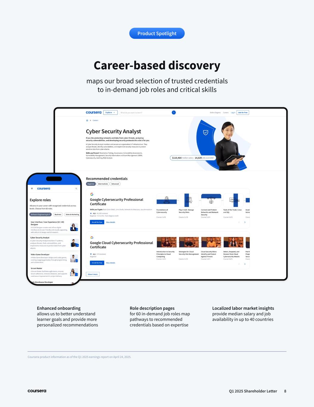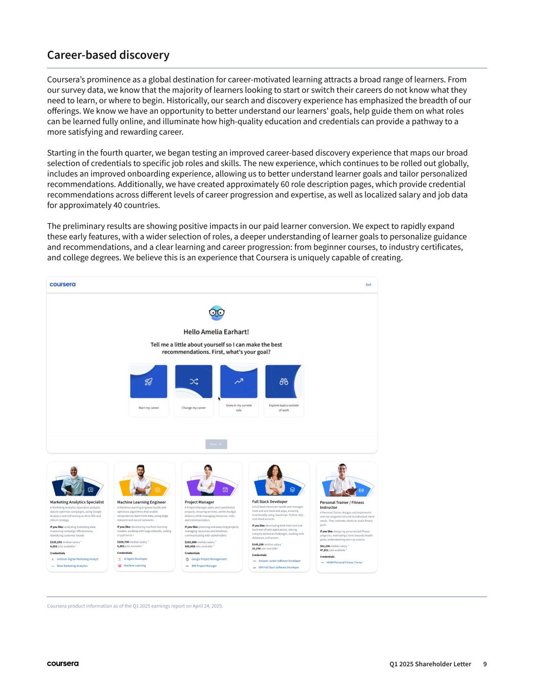 Coursera product information as of the Q1 2025 earnings report on April 24, 2025. Q1 2025 Shareholder Letter 9 Career-based discovery Courseraʼs prominence as a global destination for career-motivated learning attracts a broad range of learners. From our survey data, we know that the majority of learners looking to start or switch their careers do not know what they need to learn, or where to begin. Historically, our search and discovery experience has emphasized the breadth of our offerings. We know we have an opportunity to better understand our learners' goals, help guide them on what roles can be learned fully online, and illuminate how high-quality education and credentials can provide a pathway to a more satisfying and rewarding career. Starting in the fourth quarter, we began testing an improved career-based discovery experience that maps our broad selection of credentials to specific job roles and skills. The new experience, which continues to be rolled out globally, includes an improved onboarding experience, allowing us to better understand learner goals and tailor personalized recommendations. Additionally, we have created approximately 60 role description pages, which provide credential recommendations across different levels of career progression and expertise, as well as localized salary and job data for approximately 40 countries. The preliminary results are showing positive impacts in our paid learner conversion. We expect to rapidly expand these early features, with a wider selection of roles, a deeper understanding of learner goals to personalize guidance and recommendations, and a clear learning and career progression: from beginner courses, to industry certificates, and college degrees. We believe this is an experience that Coursera is uniquely capable of creating.