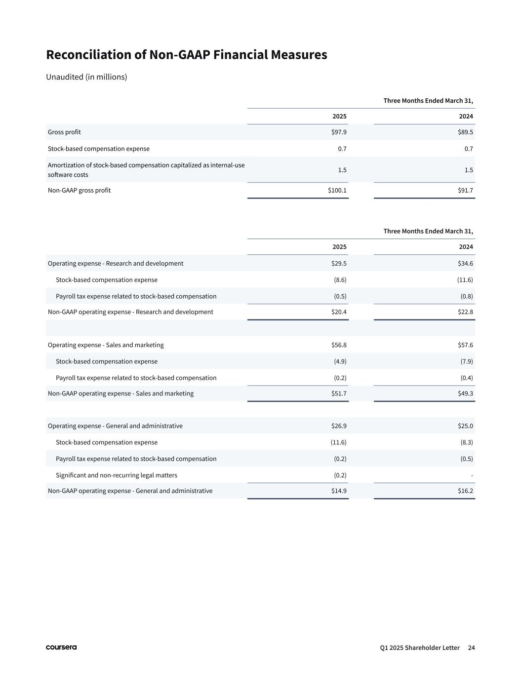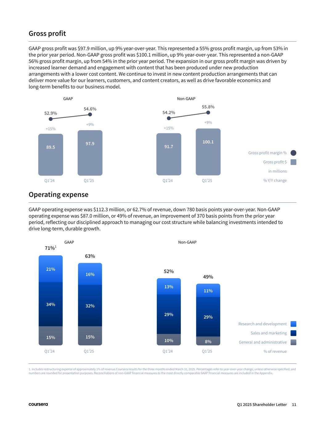 Q1 2025 Shareholder Letter 11 Gross profit GAAP gross profit was $97.9 million, up 9% year-over-year. This represented a 55% gross profit margin, up from 53% in the prior year period. Non-GAAP gross profit was $100.1 million, up 9% year-over-year. This represented a non-GAAP 56% gross profit margin, up from 54% in the prior year period. The expansion in our gross profit margin was driven by increased learner demand and engagement with content that has been produced under new production arrangements with a lower cost content. We continue to invest in new content production arrangements that can deliver more value for our learners, customers, and content creators, as well as drive favorable economics and long-term benefits to our business model. 1. Includes restructuring expense of approximately 1% of revenue.Coursera results for the three months ended March 31, 2025. Percentages refer to year-over-year change, unless otherwise specified, and numbers are rounded for presentation purposes. Reconciliations of non-GAAP financial measures to the most directly comparable GAAP financial measures are included in the Appendix. Operating expense GAAP operating expense was $112.3 million, or 62.7% of revenue, down 780 basis points year-over-year. Non-GAAP operating expense was $87.0 million, or 49% of revenue, an improvement of 370 basis points from the prior year period, reflecting our disciplined approach to managing our cost structure while balancing investments intended to drive long-term, durable growth. Q1ʼ24 Q1ʼ25 Q1ʼ24 Q1ʼ25 21% 16% 13% 11% 34% 32% 29% 29% 8%10% 15%15% 71%1 63% 52% 49% Research and development Sales and marketing General and administrative % of revenue Q1ʼ24 Q1ʼ25 Q1ʼ24 Q1ʼ25 89.5 97.9 91.7 100.1 Gross profit margin % Gross profit $ in millions % Y/Y change 52.9% +15% 54.6% +9% 54.2% +15% 55.8% +9% GAAP Non-GAAP GAAP Non-GAAP