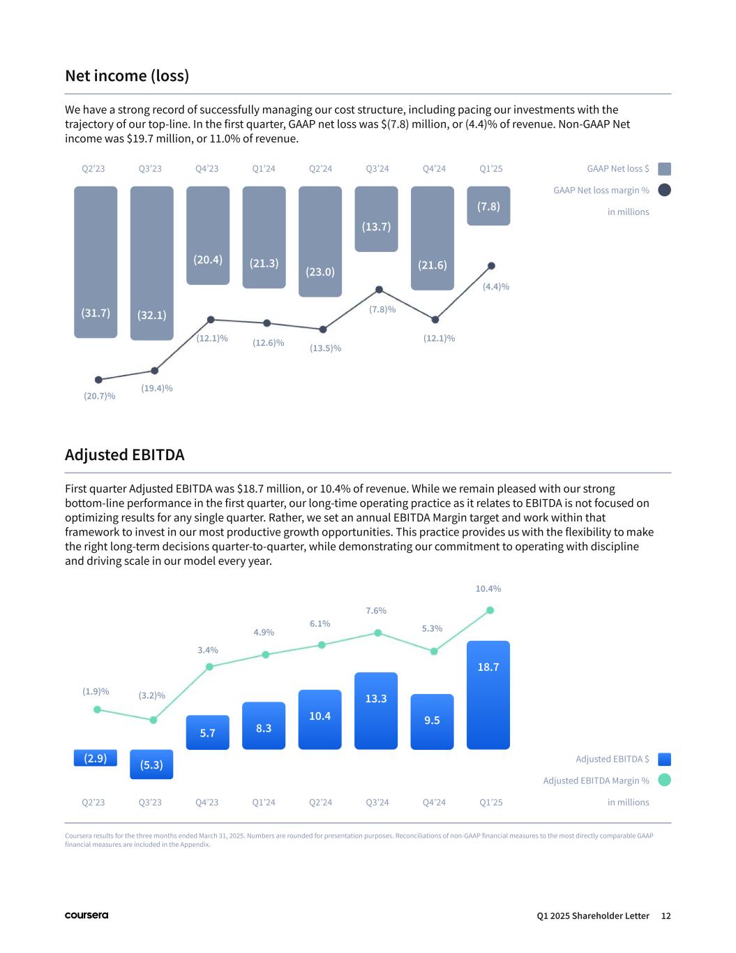 Net income (loss) We have a strong record of successfully managing our cost structure, including pacing our investments with the trajectory of our top-line. In the first quarter, GAAP net loss was $(7.8) million, or (4.4)% of revenue. Non-GAAP Net income was $19.7 million, or 11.0% of revenue. Q1 2025 Shareholder Letter 12 Coursera results for the three months ended March 31, 2025. Numbers are rounded for presentation purposes. Reconciliations of non-GAAP financial measures to the most directly comparable GAAP financial measures are included in the Appendix. Adjusted EBITDA First quarter Adjusted EBITDA was $18.7 million, or 10.4% of revenue. While we remain pleased with our strong bottom-line performance in the first quarter, our long-time operating practice as it relates to EBITDA is not focused on optimizing results for any single quarter. Rather, we set an annual EBITDA Margin target and work within that framework to invest in our most productive growth opportunities. This practice provides us with the flexibility to make the right long-term decisions quarter-to-quarter, while demonstrating our commitment to operating with discipline and driving scale in our model every year. Q2ʼ23 Q3ʼ23 Q4ʼ23 Q1ʼ24 Q2ʼ24 Q3ʼ24 Q4ʼ24 Q1ʼ25 GAAP Net loss $ GAAP Net loss margin % in millions (31.7) (32.1) (20.4) (21.3) (23.0) (13.7) (21.6) (7.8) (20.7)% (12.6)%(12.1)% (19.4)% (4.4)% (13.5)% (7.8)% (12.1)% Q2ʼ23 Q3ʼ23 Q4ʼ23 Q1ʼ24 Q2ʼ24 Q3ʼ24 Q4ʼ24 Q1ʼ25 (2.9) (5.3) 5.7 8.3 10.4 13.3 9.5 18.7 (1.9)% (3.2)% 3.4% 4.9% 10.4% 5.3% 7.6% 6.1% Adjusted EBITDA $ Adjusted EBITDA Margin % in millions