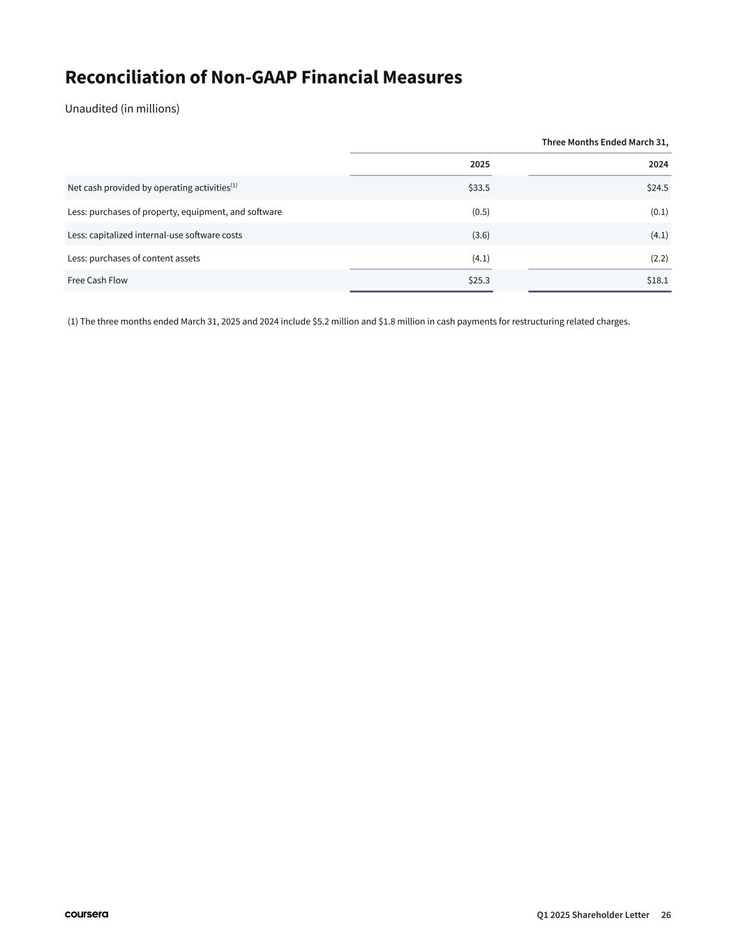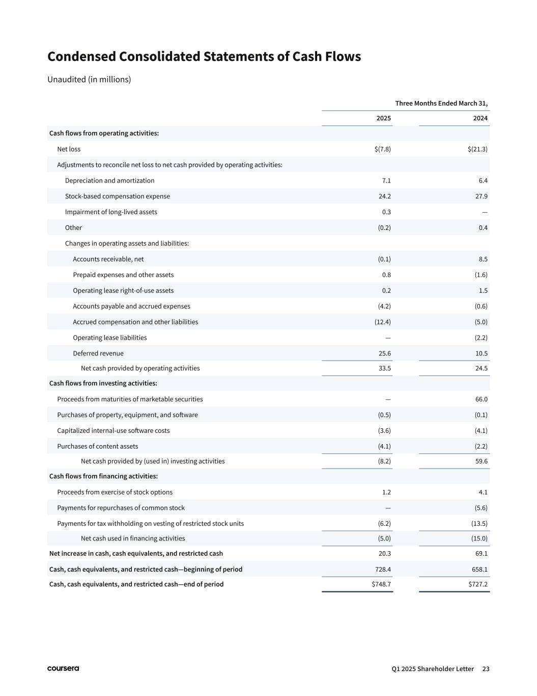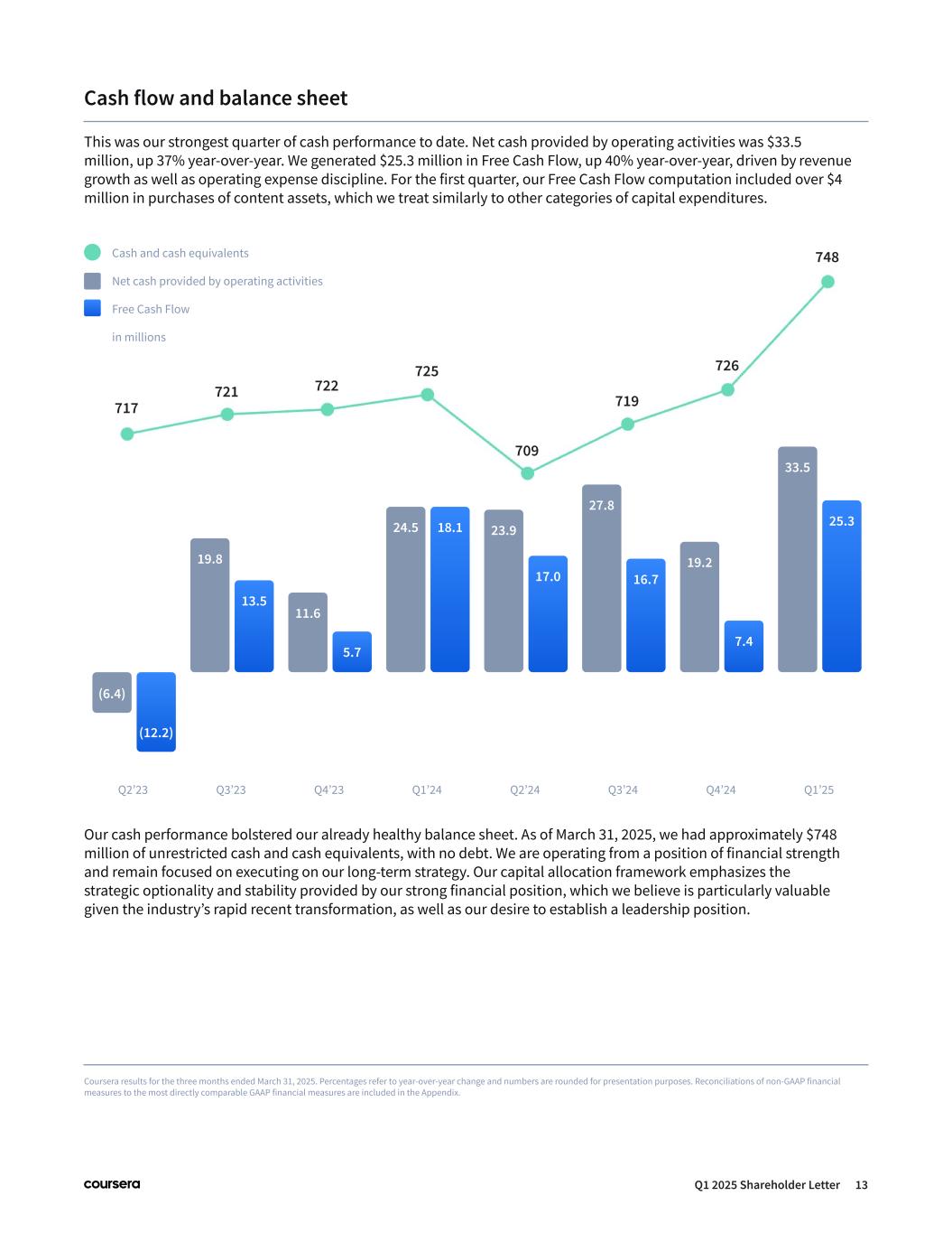 Cash flow and balance sheet This was our strongest quarter of cash performance to date. Net cash provided by operating activities was $33.5 million, up 37% year-over-year. We generated $25.3 million in Free Cash Flow, up 40% year-over-year, driven by revenue growth as well as operating expense discipline. For the first quarter, our Free Cash Flow computation included over $4 million in purchases of content assets, which we treat similarly to other categories of capital expenditures. Q1 2025 Shareholder Letter 13 Coursera results for the three months ended March 31, 2025. Percentages refer to year-over-year change and numbers are rounded for presentation purposes. Reconciliations of non-GAAP financial measures to the most directly comparable GAAP financial measures are included in the Appendix. Q2ʼ23 Q3ʼ23 Q4ʼ23 Q1ʼ24 Q2ʼ24 Q3ʼ24 Q4ʼ24 Q1ʼ25 (6.4) (12.2) 19.8 13.5 11.6 5.7 24.5 18.1 23.9 17.0 27.8 16.7 19.2 7.4 33.5 25.3 Our cash performance bolstered our already healthy balance sheet. As of March 31, 2025, we had approximately $748 million of unrestricted cash and cash equivalents, with no debt. We are operating from a position of financial strength and remain focused on executing on our long-term strategy. Our capital allocation framework emphasizes the strategic optionality and stability provided by our strong financial position, which we believe is particularly valuable given the industryʼs rapid recent transformation, as well as our desire to establish a leadership position. 717 748 726 719 709 725 722721 Cash and cash equivalents Net cash provided by operating activities Free Cash Flow in millions