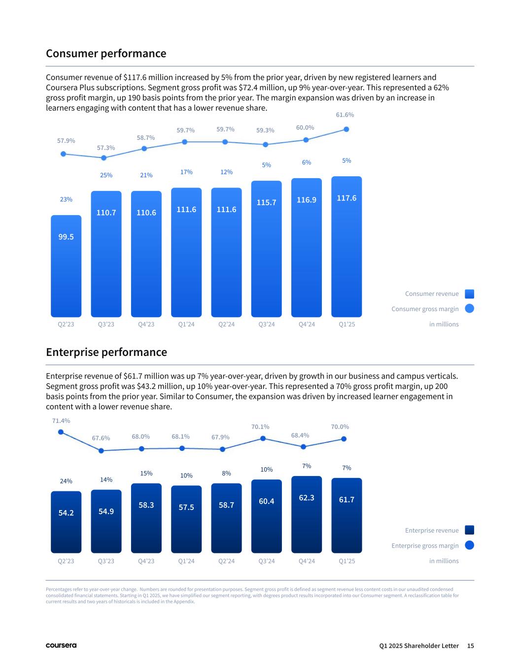 Q1 2025 Shareholder Letter 15 Q2ʼ23 Q3ʼ23 Q4ʼ23 Q1ʼ24 Q2ʼ24 Q3ʼ24 Q4ʼ24 Q1ʼ25 Q2ʼ23 Q3ʼ23 Q4ʼ23 Q1ʼ24 Q2ʼ24 Q3ʼ24 Q4ʼ24 Q1ʼ25 117.6116.9115.7 Enterprise performance Enterprise revenue of $61.7 million was up 7% year-over-year, driven by growth in our business and campus verticals. Segment gross profit was $43.2 million, up 10% year-over-year. This represented a 70% gross profit margin, up 200 basis points from the prior year. Similar to Consumer, the expansion was driven by increased learner engagement in content with a lower revenue share. Consumer performance Consumer revenue of $117.6 million increased by 5% from the prior year, driven by new registered learners and Coursera Plus subscriptions. Segment gross profit was $72.4 million, up 9% year-over-year. This represented a 62% gross profit margin, up 190 basis points from the prior year. The margin expansion was driven by an increase in learners engaging with content that has a lower revenue share. Percentages refer to year-over-year change. Numbers are rounded for presentation purposes. Segment gross profit is defined as segment revenue less content costs in our unaudited condensed consolidated financial statements. Starting in Q1 2025, we have simplified our segment reporting, with degrees product results incorporated into our Consumer segment. A reclassification table for current results and two years of historicals is included in the Appendix. 111.6111.6110.6110.7 99.5 61.762.360.458.757.558.3 54.954.2 5%6%5% 12%17%21%25% 23% 7%7%10%8%10%15% 14%24% Enterprise revenue Enterprise gross margin in millions Consumer revenue Consumer gross margin in millions 57.9% 57.3% 58.7% 59.7% 61.6% 60.0%59.3%59.7% 71.4% 67.6% 68.0% 68.1% 70.0% 68.4% 70.1% 67.9%