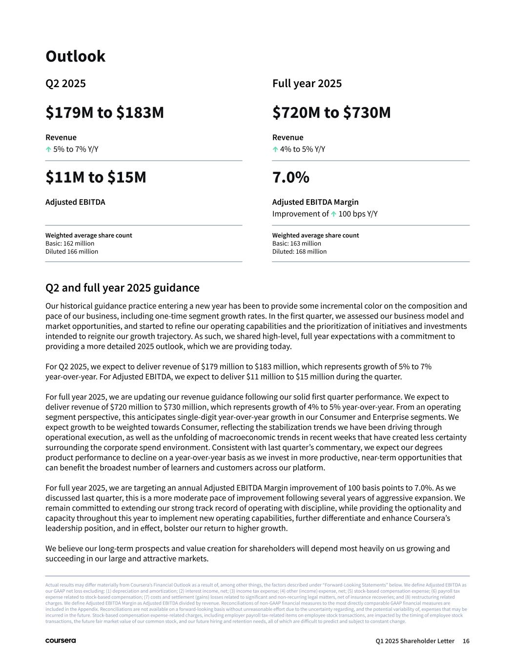 Outlook Actual results may differ materially from Courseraʼs Financial Outlook as a result of, among other things, the factors described under “Forward-Looking Statements” below. We define Adjusted EBITDA as our GAAP net loss excluding: (1) depreciation and amortization; (2) interest income, net; (3) income tax expense; (4) other (income) expense, net; (5) stock-based compensation expense; (6) payroll tax expense related to stock-based compensation; (7) costs and settlement (gains) losses related to significant and non-recurring legal matters, net of insurance recoveries; and (8) restructuring related charges. We define Adjusted EBITDA Margin as Adjusted EBITDA divided by revenue. Reconciliations of non-GAAP financial measures to the most directly comparable GAAP financial measures are included in the Appendix. Reconciliations are not available on a forward-looking basis without unreasonable effort due to the uncertainty regarding, and the potential variability of, expenses that may be incurred in the future. Stock-based compensation expense-related charges, including employer payroll tax-related items on employee stock transactions, are impacted by the timing of employee stock transactions, the future fair market value of our common stock, and our future hiring and retention needs, all of which are difficult to predict and subject to constant change. Q1 2025 Shareholder Letter 16 Q2 2025 Full year 2025 $179M to $183M Revenue ↑ 5% to 7% Y/Y $720M to $730M Revenue ↑ 4% to 5% Y/Y $11M to $15M Adjusted EBITDA 7.0% Adjusted EBITDA Margin Improvement of ↑ 100 bps Y/Y Weighted average share count Basic: 162 million Diluted 166 million Weighted average share count Basic: 163 million Diluted: 168 million Q2 and full year 2025 guidance Our historical guidance practice entering a new year has been to provide some incremental color on the composition and pace of our business, including one-time segment growth rates. In the first quarter, we assessed our business model and market opportunities, and started to refine our operating capabilities and the prioritization of initiatives and investments intended to reignite our growth trajectory. As such, we shared high-level, full year expectations with a commitment to providing a more detailed 2025 outlook, which we are providing today. For Q2 2025, we expect to deliver revenue of $179 million to $183 million, which represents growth of 5% to 7% year-over-year. For Adjusted EBITDA, we expect to deliver $11 million to $15 million during the quarter. For full year 2025, we are updating our revenue guidance following our solid first quarter performance. We expect to deliver revenue of $720 million to $730 million, which represents growth of 4% to 5% year-over-year. From an operating segment perspective, this anticipates single-digit year-over-year growth in our Consumer and Enterprise segments. We expect growth to be weighted towards Consumer, reflecting the stabilization trends we have been driving through operational execution, as well as the unfolding of macroeconomic trends in recent weeks that have created less certainty surrounding the corporate spend environment. Consistent with last quarterʼs commentary, we expect our degrees product performance to decline on a year-over-year basis as we invest in more productive, near-term opportunities that can benefit the broadest number of learners and customers across our platform. For full year 2025, we are targeting an annual Adjusted EBITDA Margin improvement of 100 basis points to 7.0%. As we discussed last quarter, this is a more moderate pace of improvement following several years of aggressive expansion. We remain committed to extending our strong track record of operating with discipline, while providing the optionality and capacity throughout this year to implement new operating capabilities, further differentiate and enhance Courseraʼs leadership position, and in effect, bolster our return to higher growth. We believe our long-term prospects and value creation for shareholders will depend most heavily on us growing and succeeding in our large and attractive markets.