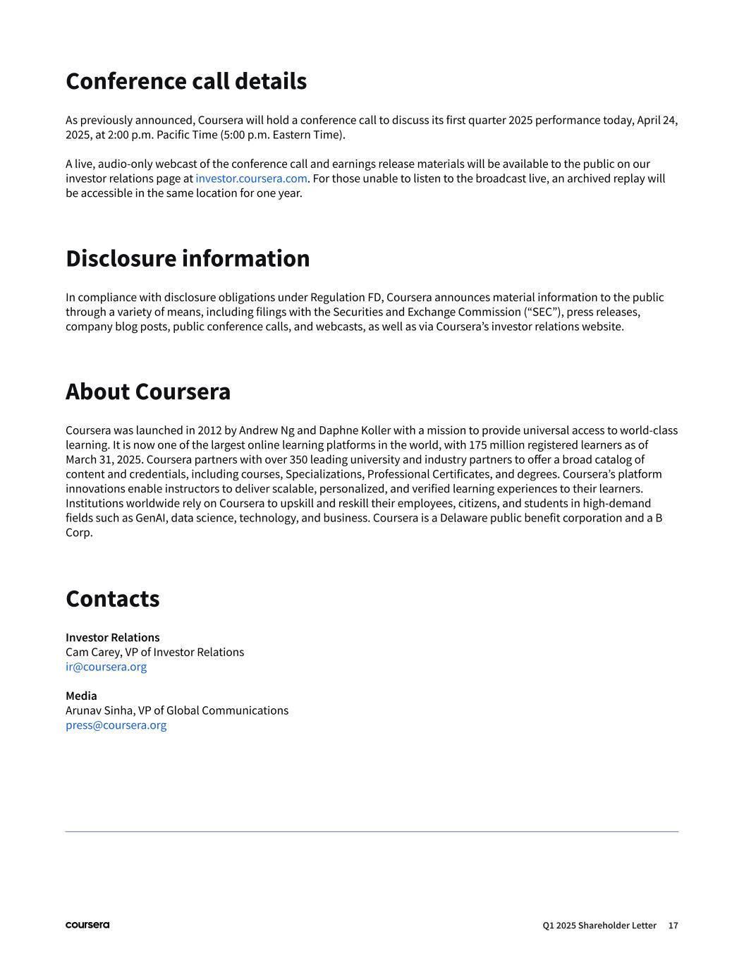 Conference call details Q1 2025 Shareholder Letter 17 As previously announced, Coursera will hold a conference call to discuss its first quarter 2025 performance today, April 24, 2025, at 2:00 p.m. Pacific Time (5:00 p.m. Eastern Time). A live, audio-only webcast of the conference call and earnings release materials will be available to the public on our investor relations page at investor.coursera.com. For those unable to listen to the broadcast live, an archived replay will be accessible in the same location for one year. Disclosure information In compliance with disclosure obligations under Regulation FD, Coursera announces material information to the public through a variety of means, including filings with the Securities and Exchange Commission (“SEC”), press releases, company blog posts, public conference calls, and webcasts, as well as via Courseraʼs investor relations website. About Coursera Coursera was launched in 2012 by Andrew Ng and Daphne Koller with a mission to provide universal access to world-class learning. It is now one of the largest online learning platforms in the world, with 175 million registered learners as of March 31, 2025. Coursera partners with over 350 leading university and industry partners to offer a broad catalog of content and credentials, including courses, Specializations, Professional Certificates, and degrees. Courseraʼs platform innovations enable instructors to deliver scalable, personalized, and verified learning experiences to their learners. Institutions worldwide rely on Coursera to upskill and reskill their employees, citizens, and students in high-demand fields such as GenAI, data science, technology, and business. Coursera is a Delaware public benefit corporation and a B Corp. Contacts Investor Relations Cam Carey, VP of Investor Relations ir@coursera.org Media Arunav Sinha, VP of Global Communications press@coursera.org