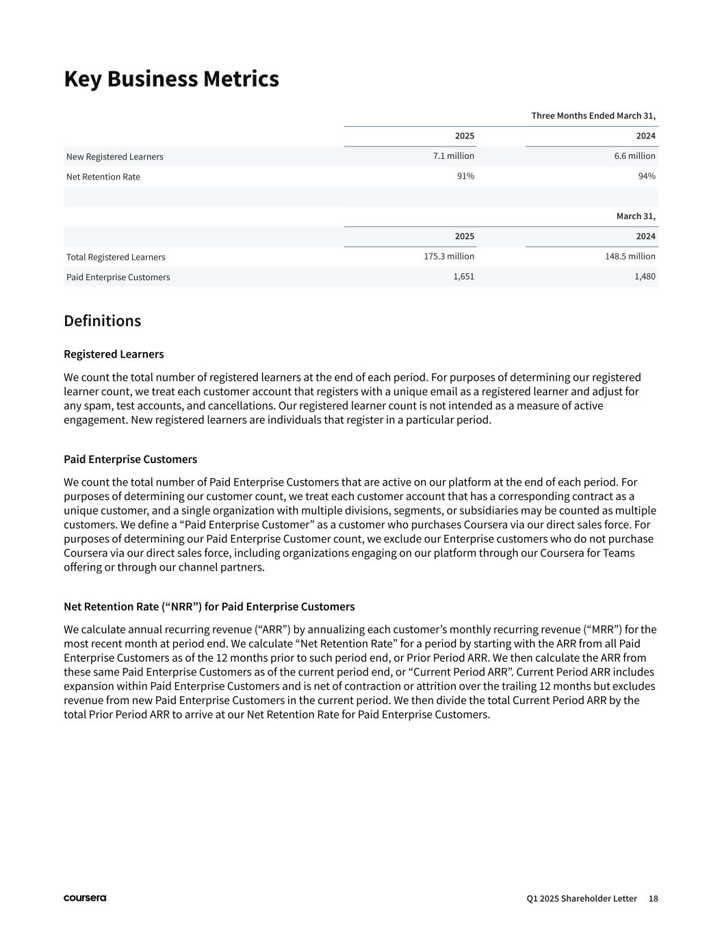 Key Business Metrics Q1 2025 Shareholder Letter 18 Definitions Registered Learners We count the total number of registered learners at the end of each period. For purposes of determining our registered learner count, we treat each customer account that registers with a unique email as a registered learner and adjust for any spam, test accounts, and cancellations. Our registered learner count is not intended as a measure of active engagement. New registered learners are individuals that register in a particular period. Paid Enterprise Customers We count the total number of Paid Enterprise Customers that are active on our platform at the end of each period. For purposes of determining our customer count, we treat each customer account that has a corresponding contract as a unique customer, and a single organization with multiple divisions, segments, or subsidiaries may be counted as multiple customers. We define a “Paid Enterprise Customer” as a customer who purchases Coursera via our direct sales force. For purposes of determining our Paid Enterprise Customer count, we exclude our Enterprise customers who do not purchase Coursera via our direct sales force, including organizations engaging on our platform through our Coursera for Teams offering or through our channel partners. Net Retention Rate (“NRR”) for Paid Enterprise Customers We calculate annual recurring revenue (“ARR”) by annualizing each customerʼs monthly recurring revenue (“MRR”) for the most recent month at period end. We calculate “Net Retention Rate” for a period by starting with the ARR from all Paid Enterprise Customers as of the 12 months prior to such period end, or Prior Period ARR. We then calculate the ARR from these same Paid Enterprise Customers as of the current period end, or “Current Period ARR”. Current Period ARR includes expansion within Paid Enterprise Customers and is net of contraction or attrition over the trailing 12 months but excludes revenue from new Paid Enterprise Customers in the current period. We then divide the total Current Period ARR by the total Prior Period ARR to arrive at our Net Retention Rate for Paid Enterprise Customers. Three Months Ended March 31, 2025 2024 New Registered Learners 7.1 million 6.6 million Net Retention Rate 91% 94% March 31, 2025 2024 Total Registered Learners 175.3 million 148.5 million Paid Enterprise Customers 1,651 1,480
