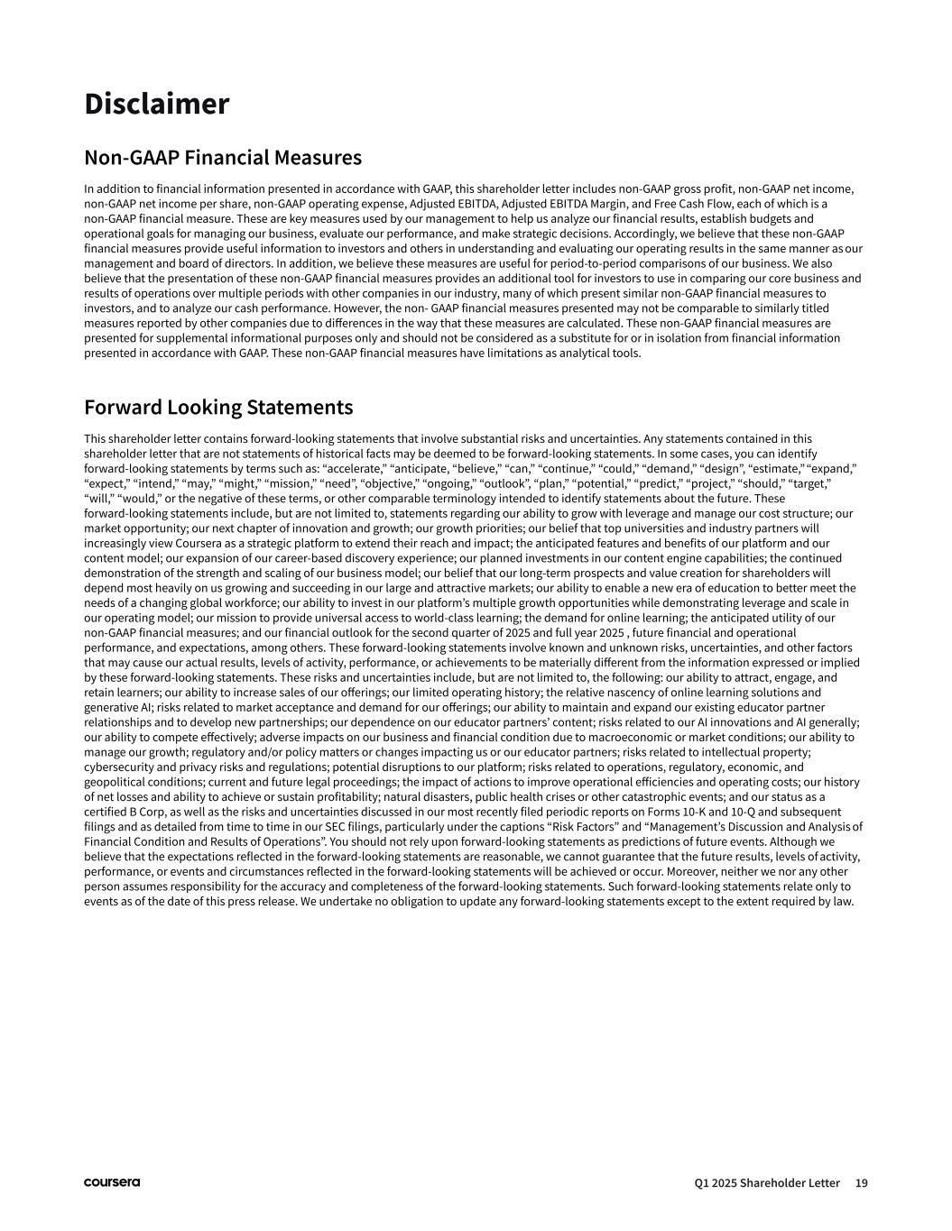 Disclaimer Q1 2025 Shareholder Letter 19 Non-GAAP Financial Measures In addition to financial information presented in accordance with GAAP, this shareholder letter includes non-GAAP gross profit, non-GAAP net income, non-GAAP net income per share, non-GAAP operating expense, Adjusted EBITDA, Adjusted EBITDA Margin, and Free Cash Flow, each of which is a non-GAAP financial measure. These are key measures used by our management to help us analyze our financial results, establish budgets and operational goals for managing our business, evaluate our performance, and make strategic decisions. Accordingly, we believe that these non-GAAP financial measures provide useful information to investors and others in understanding and evaluating our operating results in the same manner as our management and board of directors. In addition, we believe these measures are useful for period-to-period comparisons of our business. We also believe that the presentation of these non-GAAP financial measures provides an additional tool for investors to use in comparing our core business and results of operations over multiple periods with other companies in our industry, many of which present similar non-GAAP financial measures to investors, and to analyze our cash performance. However, the non- GAAP financial measures presented may not be comparable to similarly titled measures reported by other companies due to differences in the way that these measures are calculated. These non-GAAP financial measures are presented for supplemental informational purposes only and should not be considered as a substitute for or in isolation from financial information presented in accordance with GAAP. These non-GAAP financial measures have limitations as analytical tools. Forward Looking Statements This shareholder letter contains forward-looking statements that involve substantial risks and uncertainties. Any statements contained in this shareholder letter that are not statements of historical facts may be deemed to be forward-looking statements. In some cases, you can identify forward-looking statements by terms such as: “accelerate,” “anticipate, “believe,” “can,” “continue,” “could,” “demand,” “design”, “estimate,” “expand,” “expect,” “intend,” “may,” “might,” “mission,” “need”, “objective,” “ongoing,” “outlook”, “plan,” “potential,” “predict,” “project,” “should,” “target,” “will,” “would,” or the negative of these terms, or other comparable terminology intended to identify statements about the future. These forward-looking statements include, but are not limited to, statements regarding our ability to grow with leverage and manage our cost structure; our market opportunity; our next chapter of innovation and growth; our growth priorities; our belief that top universities and industry partners will increasingly view Coursera as a strategic platform to extend their reach and impact; the anticipated features and benefits of our platform and our content model; our expansion of our career-based discovery experience; our planned investments in our content engine capabilities; the continued demonstration of the strength and scaling of our business model; our belief that our long-term prospects and value creation for shareholders will depend most heavily on us growing and succeeding in our large and attractive markets; our ability to enable a new era of education to better meet the needs of a changing global workforce; our ability to invest in our platformʼs multiple growth opportunities while demonstrating leverage and scale in our operating model; our mission to provide universal access to world-class learning; the demand for online learning; the anticipated utility of our non-GAAP financial measures; and our financial outlook for the second quarter of 2025 and full year 2025 , future financial and operational performance, and expectations, among others. These forward-looking statements involve known and unknown risks, uncertainties, and other factors that may cause our actual results, levels of activity, performance, or achievements to be materially different from the information expressed or implied by these forward-looking statements. These risks and uncertainties include, but are not limited to, the following: our ability to attract, engage, and retain learners; our ability to increase sales of our offerings; our limited operating history; the relative nascency of online learning solutions and generative AI; risks related to market acceptance and demand for our offerings; our ability to maintain and expand our existing educator partner relationships and to develop new partnerships; our dependence on our educator partnersʼ content; risks related to our AI innovations and AI generally; our ability to compete effectively; adverse impacts on our business and financial condition due to macroeconomic or market conditions; our ability to manage our growth; regulatory and/or policy matters or changes impacting us or our educator partners; risks related to intellectual property; cybersecurity and privacy risks and regulations; potential disruptions to our platform; risks related to operations, regulatory, economic, and geopolitical conditions; current and future legal proceedings; the impact of actions to improve operational efficiencies and operating costs; our history of net losses and ability to achieve or sustain profitability; natural disasters, public health crises or other catastrophic events; and our status as a certified B Corp, as well as the risks and uncertainties discussed in our most recently filed periodic reports on Forms 10-K and 10-Q and subsequent filings and as detailed from time to time in our SEC filings, particularly under the captions “Risk Factors” and “Managementʼs Discussion and Analysis of Financial Condition and Results of Operations”. You should not rely upon forward-looking statements 