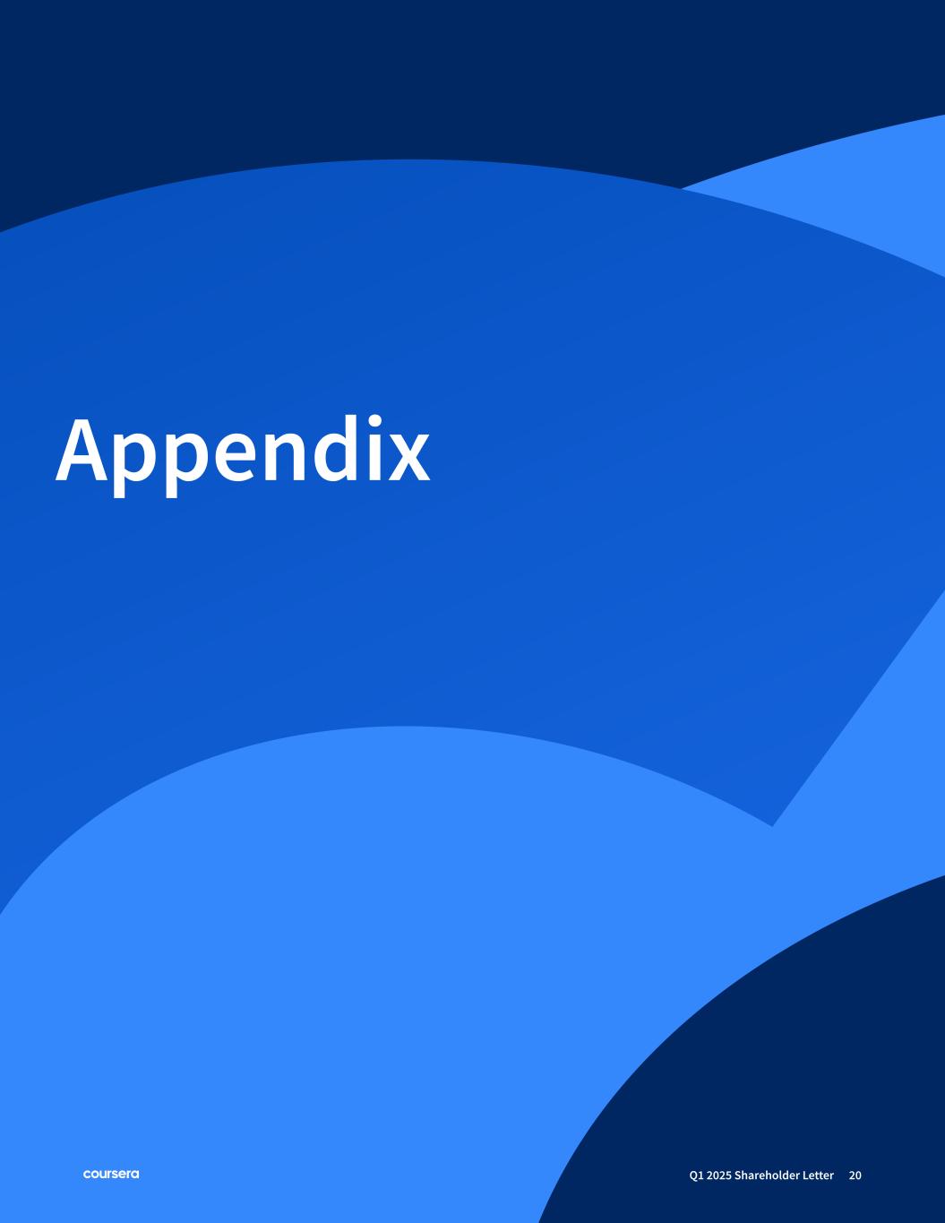 Disclaimer Q1 2025 Shareholder Letter 19 Non-GAAP Financial Measures In addition to financial information presented in accordance with GAAP, this shareholder letter includes non-GAAP gross profit, non-GAAP net income, non-GAAP net income per share, non-GAAP operating expense, Adjusted EBITDA, Adjusted EBITDA Margin, and Free Cash Flow, each of which is a non-GAAP financial measure. These are key measures used by our management to help us analyze our financial results, establish budgets and operational goals for managing our business, evaluate our performance, and make strategic decisions. Accordingly, we believe that these non-GAAP financial measures provide useful information to investors and others in understanding and evaluating our operating results in the same manner as our management and board of directors. In addition, we believe these measures are useful for period-to-period comparisons of our business. We also believe that the presentation of these non-GAAP financial measures provides an additional tool for investors to use in comparing our core business and results of operations over multiple periods with other companies in our industry, many of which present similar non-GAAP financial measures to investors, and to analyze our cash performance. However, the non- GAAP financial measures presented may not be comparable to similarly titled measures reported by other companies due to differences in the way that these measures are calculated. These non-GAAP financial measures are presented for supplemental informational purposes only and should not be considered as a substitute for or in isolation from financial information presented in accordance with GAAP. These non-GAAP financial measures have limitations as analytical tools. Forward Looking Statements This shareholder letter contains forward-looking statements that involve substantial risks and uncertainties. Any statements contained in this shareholder letter that are not statements of historical facts may be deemed to be forward-looking statements. In some cases, you can identify forward-looking statements by terms such as: “accelerate,” “anticipate, “believe,” “can,” “continue,” “could,” “demand,” “design”, “estimate,” “expand,” “expect,” “intend,” “may,” “might,” “mission,” “need”, “objective,” “ongoing,” “outlook”, “plan,” “potential,” “predict,” “project,” “should,” “target,” “will,” “would,” or the negative of these terms, or other comparable terminology intended to identify statements about the future. These forward-looking statements include, but are not limited to, statements regarding our ability to grow with leverage and manage our cost structure; our market opportunity; our next chapter of innovation and growth; our growth priorities; our belief that top universities and industry partners will increasingly view Coursera as a strategic platform to extend their reach and impact; the anticipated features and benefits of our platform and our content model; our expansion of our career-based discovery experience; our planned investments in our content engine capabilities; the continued demonstration of the strength and scaling of our business model; our belief that our long-term prospects and value creation for shareholders will depend most heavily on us growing and succeeding in our large and attractive markets; our ability to enable a new era of education to better meet the needs of a changing global workforce; our ability to invest in our platformʼs multiple growth opportunities while demonstrating leverage and scale in our operating model; our mission to provide universal access to world-class learning; the demand for online learning; the anticipated utility of our non-GAAP financial measures; and our financial outlook for the second quarter of 2025 and full year 2025 , future financial and operational performance, and expectations, among others. These forward-looking statements involve known and unknown risks, uncertainties, and other factors that may cause our actual results, levels of activity, performance, or achievements to be materially different from the information expressed or implied by these forward-looking statements. These risks and uncertainties include, but are not limited to, the following: our ability to attract, engage, and retain learners; our ability to increase sales of our offerings; our limited operating history; the relative nascency of online learning solutions and generative AI; risks related to market acceptance and demand for our offerings; our ability to maintain and expand our existing educator partner relationships and to develop new partnerships; our dependence on our educator partnersʼ content; risks related to our AI innovations and AI generally; our ability to compete effectively; adverse impacts on our business and financial condition due to macroeconomic or market conditions; our ability to manage our growth; regulatory and/or policy matters or changes impacting us or our educator partners; risks related to intellectual property; cybersecurity and privacy risks and regulations; potential disruptions to our platform; risks related to operations, regulatory, economic, and geopolitical conditions; current and future legal proceedings; the impact of actions to improve operational efficiencies and operating costs; our history of net losses and ability to achieve or sustain profitability; natural disasters, public health crises or other catastrophic events; and our status as a certified B Corp, as well as the risks and uncertainties discussed in our most recently filed periodic reports on Forms 10-K and 10-Q and subsequent filings and as detailed from time to time in our SEC filings, particularly under the captions “Risk Factors” and “Managementʼs Discussion and Analysis of Financial Condition and Results of Operations”. You should not rely upon forward-looking statements 