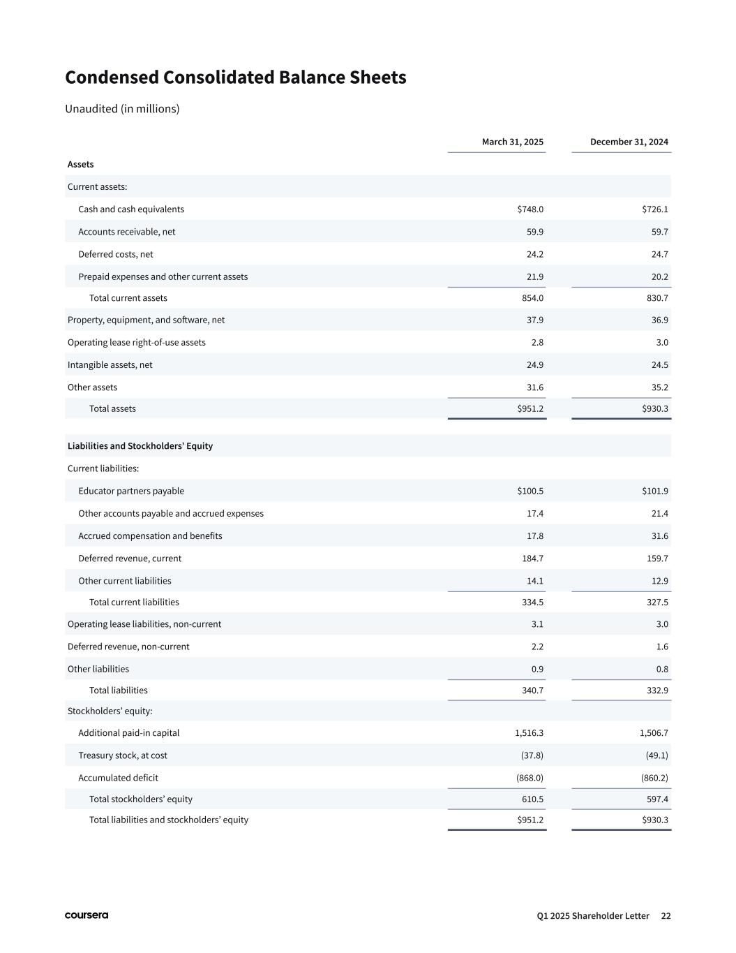 Condensed Consolidated Balance Sheets Unaudited (in millions) Q1 2025 Shareholder Letter 22 March 31, 2025 December 31, 2024 Assets Current assets: Cash and cash equivalents $748.0 $726.1 Accounts receivable, net 59.9 59.7 Deferred costs, net 24.2 24.7 Prepaid expenses and other current assets 21.9 20.2 Total current assets 854.0 830.7 Property, equipment, and software, net 37.9 36.9 Operating lease right-of-use assets 2.8 3.0 Intangible assets, net 24.9 24.5 Other assets 31.6 35.2 Total assets $951.2 $930.3 Liabilities and Stockholdersʼ Equity Current liabilities: Educator partners payable $100.5 $101.9 Other accounts payable and accrued expenses 17.4 21.4 Accrued compensation and benefits 17.8 31.6 Deferred revenue, current 184.7 159.7 Other current liabilities 14.1 12.9 Total current liabilities 334.5 327.5 Operating lease liabilities, non-current 3.1 3.0 Deferred revenue, non-current 2.2 1.6 Other liabilities 0.9 0.8 Total liabilities 340.7 332.9 Stockholdersʼ equity: Additional paid-in capital 1,516.3 1,506.7 Treasury stock, at cost (37.8) (49.1) Accumulated deficit (868.0) (860.2) Total stockholdersʼ equity 610.5 597.4 Total liabilities and stockholdersʼ equity $951.2 $930.3 Three Months Ended March 31, 2025 2024 Cash flows from operating activities: Net loss $ (7.8) $ (21.3) Adjustments to reconcile net loss to net cash provided by operating activities: Depreciation and amortization 7.1 6.4 Stock-based compensation expense 24.2 27.9 Impairment of long-lived assets 0.3 — Other (0.2) 0.4 Changes in operating assets and liabilities: Accounts receivable, net (0.1) 8.5 Prepaid expenses and other assets 0.8 (1.6) Operating lease right-of-use assets 0.2 1.5 Accounts payable and accrued expenses (4.2) (0.6) Accrued compensation and other liabilities (12.4) (5.0) Operating lease liabilities — (2.2) Deferred revenue 25.6 10.5 Net cash provided by operating activities 33.5 24.5 Cash flows from investing activities: Proceeds from maturities of marketable securities — 66.0 Purchases of property, equipment, and software (0.5) (0.1) Capitalized internal-use software costs (3.6) (4.1) Purchases of content assets (4.1) (2.2) Net cash provided by (used in) investing activities (8.2) 59.6 Cash flows from financing activities: Proceeds from exercise of stock options 1.2 4.1 Payments for repurchases of common stock — (5.6) Payments for tax withholding on vesting of restricted stock units (6.2) (13.5) Net cash used in financing activities (5.0) (15.0) Net increase in cash, cash equivalents, and restricted cash 20.3 69.1 Cash, cash equivalents, and restricted cash—beginning of period 728.4 658.1 Cash, cash equivalents, and restricted cash—end of period $ 748.7 $ 727.2