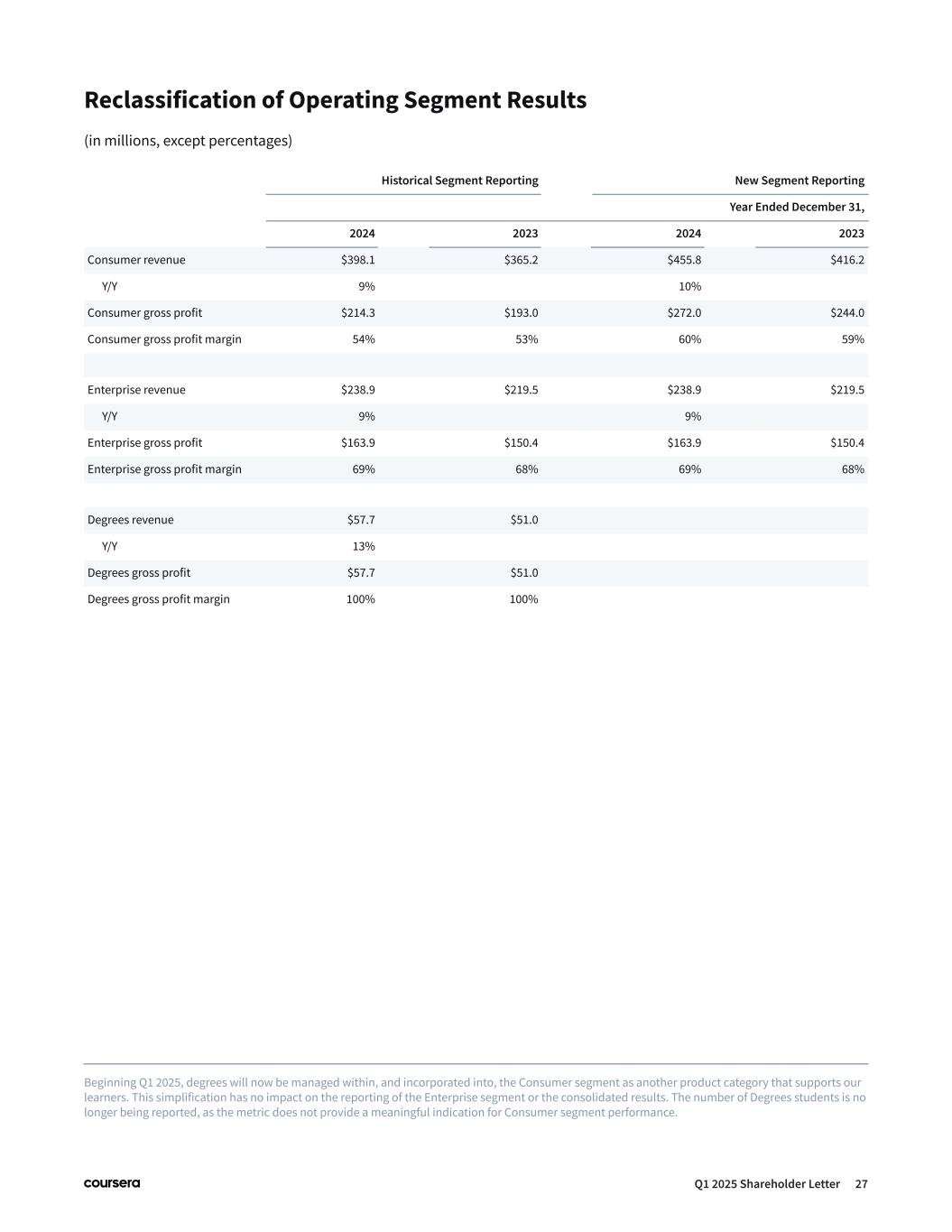 Historical Segment Reporting New Segment Reporting Year Ended December 31, 2024 2023 2024 2023 Consumer revenue $398.1 $365.2 $455.8 $416.2 Y/Y 9% 10% Consumer gross profit $214.3 $193.0 $272.0 $244.0 Consumer gross profit margin 54% 53% 60% 59% Enterprise revenue $238.9 $219.5 $238.9 $219.5 Y/Y 9% 9% Enterprise gross profit $163.9 $150.4 $163.9 $150.4 Enterprise gross profit margin 69% 68% 69% 68% Degrees revenue $57.7 $51.0 Y/Y 13% Degrees gross profit $57.7 $51.0 Degrees gross profit margin 100% 100% Reclassification of Operating Segment Results (in millions, except percentages) Beginning Q1 2025, degrees will now be managed within, and incorporated into, the Consumer segment as another product category that supports our learners. This simplification has no impact on the reporting of the Enterprise segment or the consolidated results. The number of Degrees students is no longer being reported, as the metric does not provide a meaningful indication for Consumer segment performance. Q1 2025 Shareholder Letter 27
