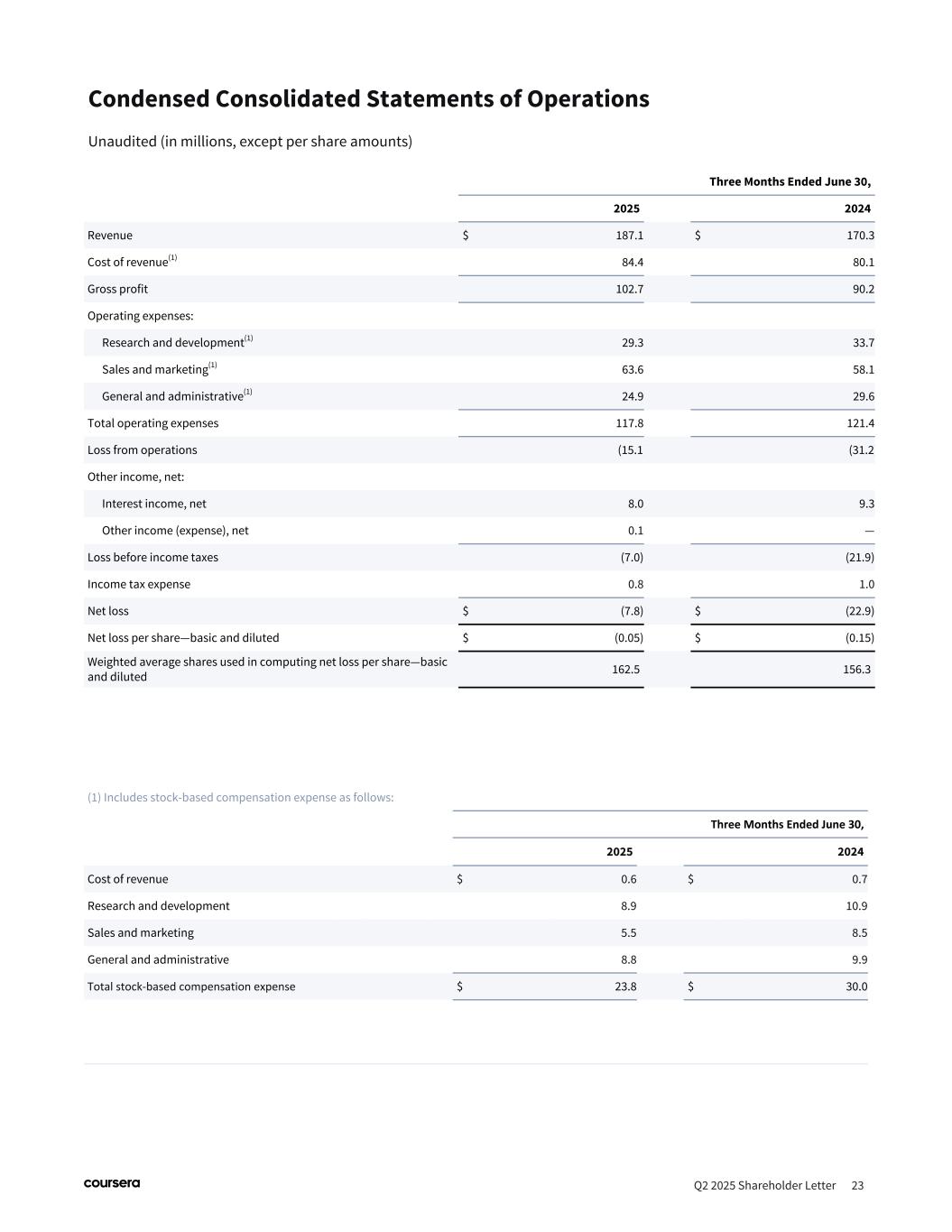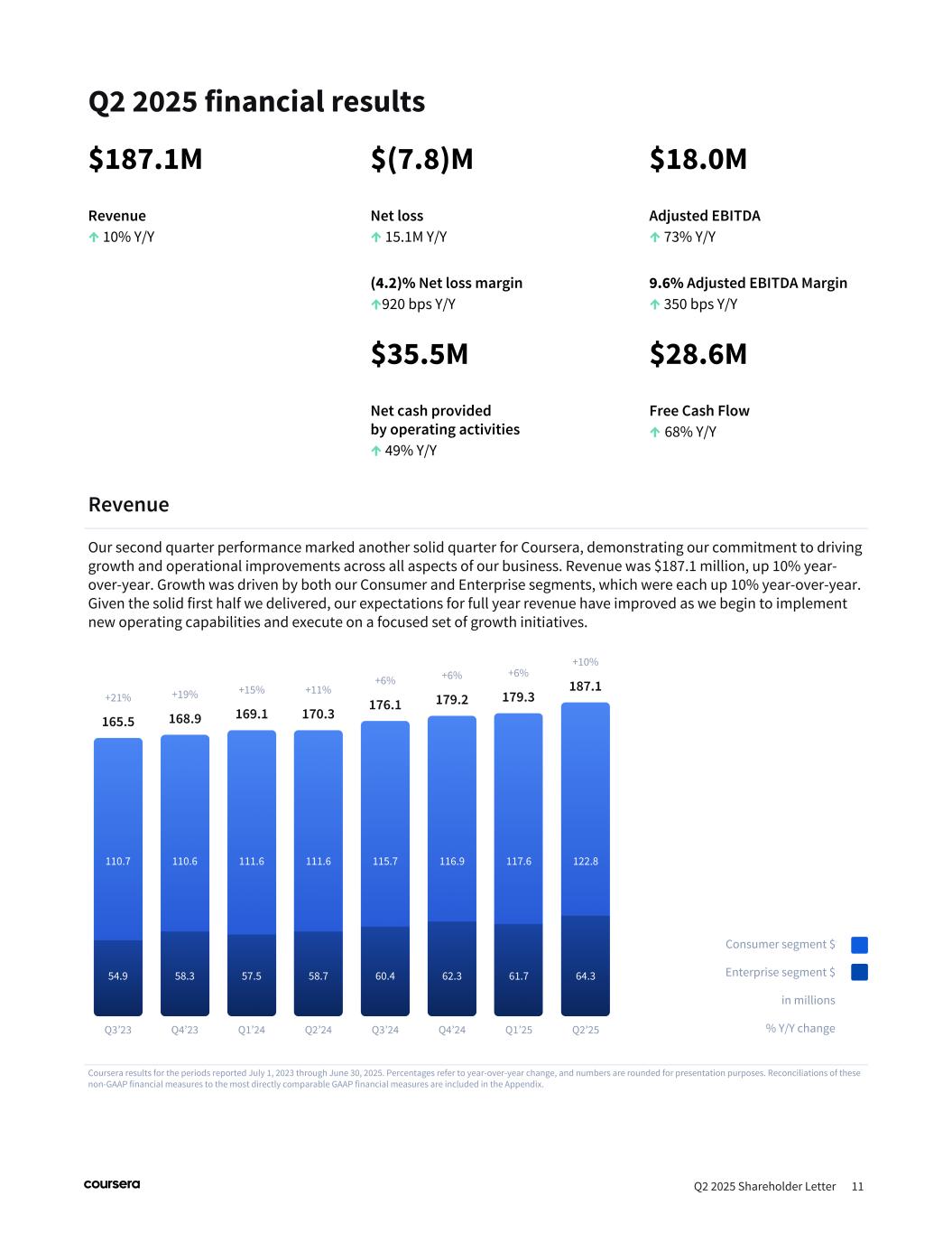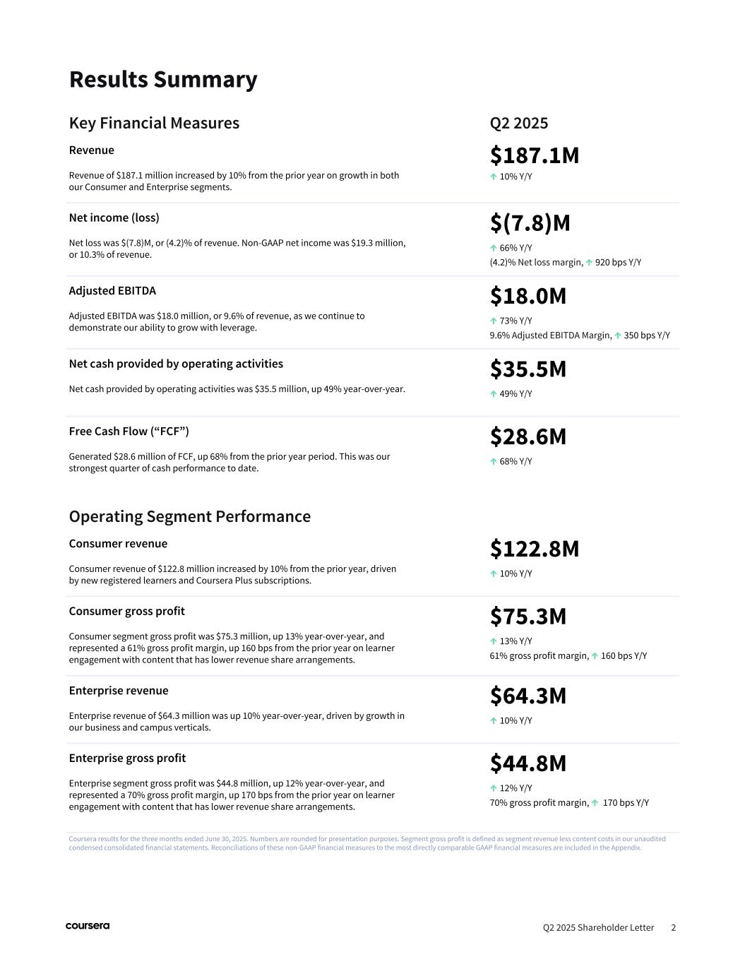Results Summary Coursera results for the three months ended June 30, 2025. Numbers are rounded for presentation purposes. Segment gross profit is defined as segment revenue less content costs in our unaudited condensed consolidated financial statements. Reconciliations of these non-GAAP financial measures to the most directly comparable GAAP financial measures are included in the Appendix. Q2 2025 Shareholder Letter 2 Key Financial Measures Q2 2025 Revenue Revenue of $187.1 million increased by 10% from the prior year on growth in both our Consumer and Enterprise segments. $187.1M ↑ 10% Y/Y Net income (loss) Net loss was $(7.8)M, or (4.2)% of revenue. Non-GAAP net income was $19.3 million, or 10.3% of revenue. $(7.8)M ↑ 66% Y/Y (4.2)% Net loss margin, ↑ 920 bps Y/Y Adjusted EBITDA Adjusted EBITDA was $18.0 million, or 9.6% of revenue, as we continue to demonstrate our ability to grow with leverage. $18.0M ↑ 73% Y/Y 9.6% Adjusted EBITDA Margin, ↑ 350 bps Y/Y Net cash provided by operating activities Net cash provided by operating activities was $35.5 million, up 49% year-over-year. $35.5M ↑ 49% Y/Y Free Cash Flow (“FCF”) Generated $28.6 million of FCF, up 68% from the prior year period. This was our strongest quarter of cash performance to date. $28.6M ↑ 68% Y/Y Operating Segment Performance Consumer revenue Consumer revenue of $122.8 million increased by 10% from the prior year, driven by new registered learners and Coursera Plus subscriptions. $122.8M ↑ 10% Y/Y Consumer gross profit Consumer segment gross profit was $75.3 million, up 13% year-over-year, and represented a 61% gross profit margin, up 160 bps from the prior year on learner engagement with content that has lower revenue share arrangements. $75.3M ↑ 13% Y/Y 61% gross profit margin, ↑ 160 bps Y/Y Enterprise revenue Enterprise revenue of $64.3 million was up 10% year-over-year, driven by growth in our business and campus verticals. $64.3M ↑ 10% Y/Y Enterprise gross profit Enterprise segment gross profit was $44.8 million, up 12% year-over-year, and represented a 70% gross profit margin, up 170 bps from the prior year on learner engagement with content that has lower revenue share arrangements. $44.8M ↑ 12% Y/Y 70% gross profit margin, ↑ 170 bps Y/Y