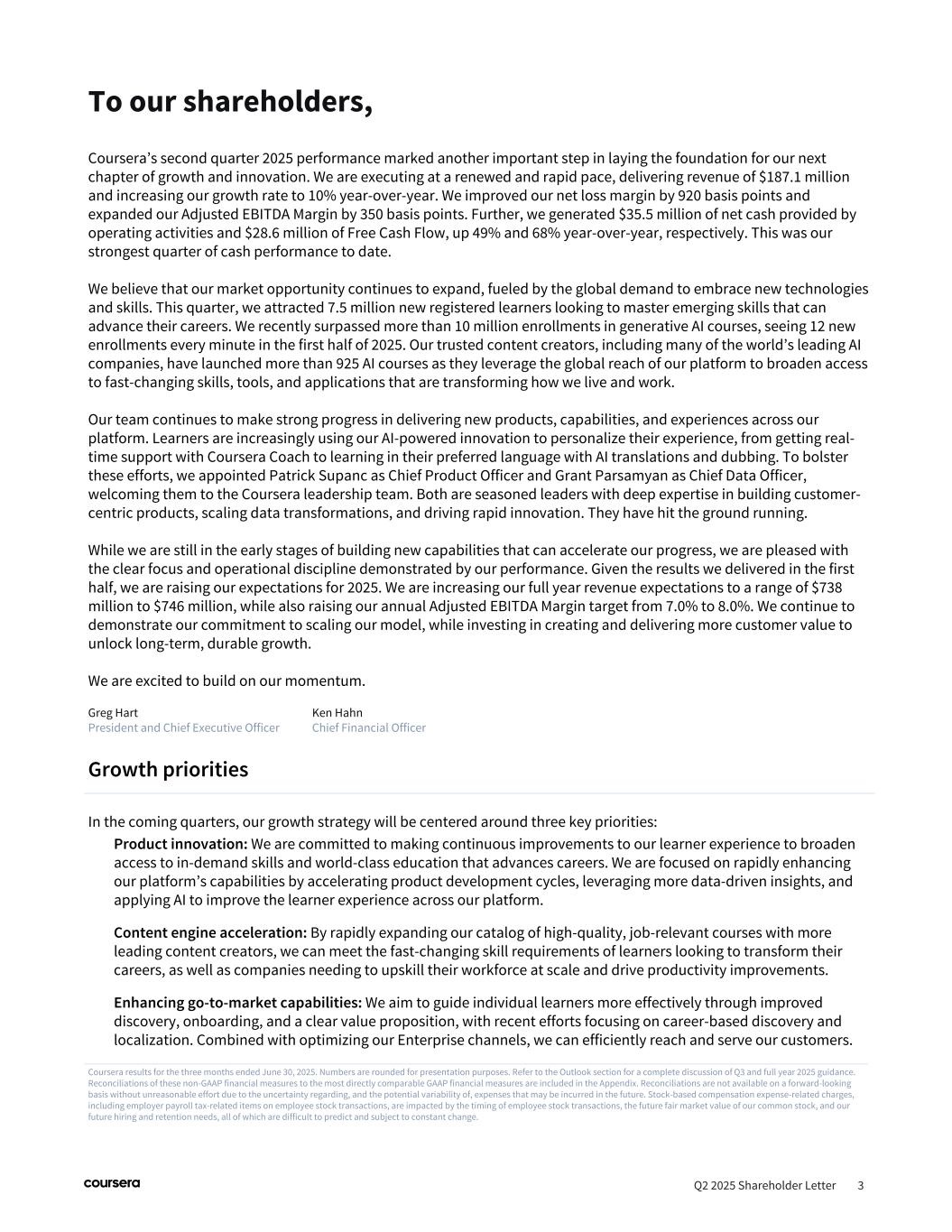 To our shareholders, Q2 2025 Shareholder Letter 3 Coursera’s second quarter 2025 performance marked another important step in laying the foundation for our next chapter of growth and innovation. We are executing at a renewed and rapid pace, delivering revenue of $187.1 million and increasing our growth rate to 10% year-over-year. We improved our net loss margin by 920 basis points and expanded our Adjusted EBITDA Margin by 350 basis points. Further, we generated $35.5 million of net cash provided by operating activities and $28.6 million of Free Cash Flow, up 49% and 68% year-over-year, respectively. This was our strongest quarter of cash performance to date. We believe that our market opportunity continues to expand, fueled by the global demand to embrace new technologies and skills. This quarter, we attracted 7.5 million new registered learners looking to master emerging skills that can advance their careers. We recently surpassed more than 10 million enrollments in generative AI courses, seeing 12 new enrollments every minute in the first half of 2025. Our trusted content creators, including many of the world’s leading AI companies, have launched more than 925 AI courses as they leverage the global reach of our platform to broaden access to fast-changing skills, tools, and applications that are transforming how we live and work. Our team continues to make strong progress in delivering new products, capabilities, and experiences across our platform. Learners are increasingly using our AI-powered innovation to personalize their experience, from getting real- time support with Coursera Coach to learning in their preferred language with AI translations and dubbing. To bolster these efforts, we appointed Patrick Supanc as Chief Product Officer and Grant Parsamyan as Chief Data Officer, welcoming them to the Coursera leadership team. Both are seasoned leaders with deep expertise in building customer- centric products, scaling data transformations, and driving rapid innovation. They have hit the ground running. While we are still in the early stages of building new capabilities that can accelerate our progress, we are pleased with the clear focus and operational discipline demonstrated by our performance. Given the results we delivered in the first half, we are raising our expectations for 2025. We are increasing our full year revenue expectations to a range of $738 million to $746 million, while also raising our annual Adjusted EBITDA Margin target from 7.0% to 8.0%. We continue to demonstrate our commitment to scaling our model, while investing in creating and delivering more customer value to unlock long-term, durable growth. We are excited to build on our momentum. Coursera results for the three months ended June 30, 2025. Numbers are rounded for presentation purposes. Refer to the Outlook section for a complete discussion of Q3 and full year 2025 guidance. Reconciliations of these non-GAAP financial measures to the most directly comparable GAAP financial measures are included in the Appendix. Reconciliations are not available on a forward-looking basis without unreasonable effort due to the uncertainty regarding, and the potential variability of, expenses that may be incurred in the future. Stock-based compensation expense-related charges, including employer payroll tax-related items on employee stock transactions, are impacted by the timing of employee stock transactions, the future fair market value of our common stock, and our future hiring and retention needs, all of which are difficult to predict and subject to constant change. Greg Hart President and Chief Executive Officer Ken Hahn Chief Financial Officer Growth priorities In the coming quarters, our growth strategy will be centered around three key priorities: Product innovation: We are committed to making continuous improvements to our learner experience to broaden access to in-demand skills and world-class education that advances careers. We are focused on rapidly enhancing our platform’s capabilities by accelerating product development cycles, leveraging more data-driven insights, and applying AI to improve the learner experience across our platform. Content engine acceleration: By rapidly expanding our catalog of high-quality, job-relevant courses with more leading content creators, we can meet the fast-changing skill requirements of learners looking to transform their careers, as well as companies needing to upskill their workforce at scale and drive productivity improvements. Enhancing go-to-market capabilities: We aim to guide individual learners more effectively through improved discovery, onboarding, and a clear value proposition, with recent efforts focusing on career-based discovery and localization. Combined with optimizing our Enterprise channels, we can efficiently reach and serve our customers.