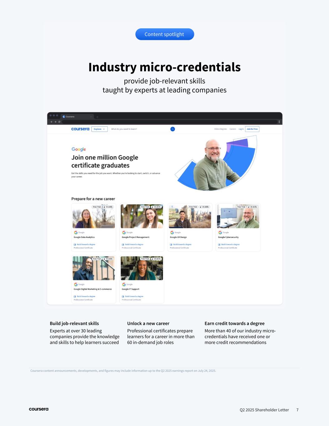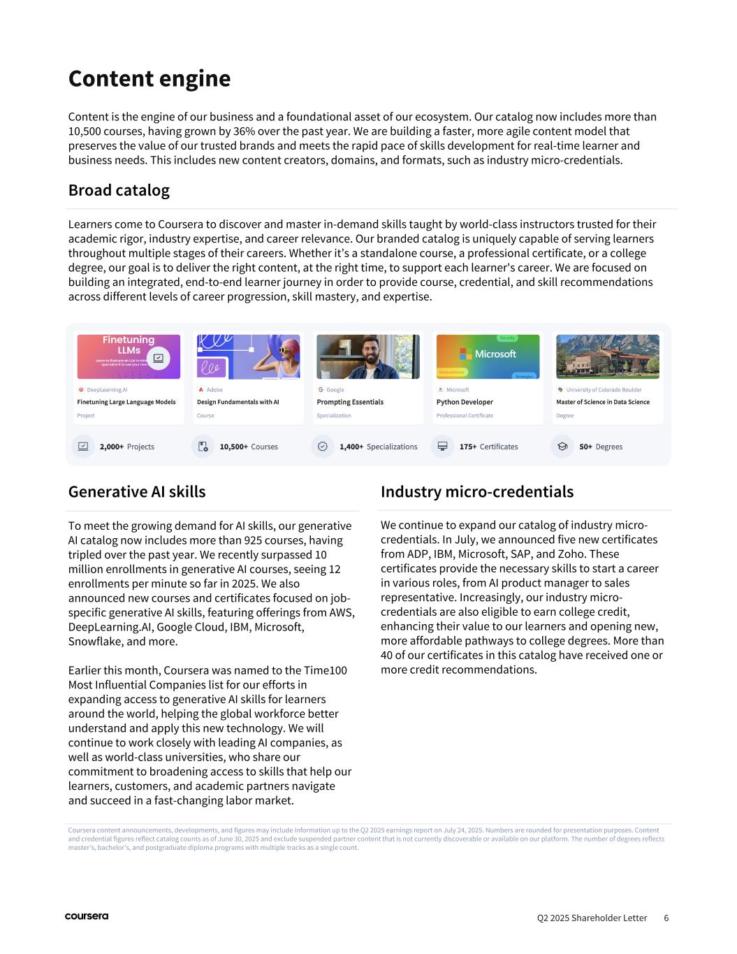 Content engine Coursera content announcements, developments, and figures may include information up to the Q2 2025 earnings report on July 24, 2025. Numbers are rounded for presentation purposes. Content and credential figures reflect catalog counts as of June 30, 2025 and exclude suspended partner content that is not currently discoverable or available on our platform. The number of degrees reflects master’s, bachelor’s, and postgraduate diploma programs with multiple tracks as a single count. Q2 2025 Shareholder Letter 6 Content is the engine of our business and a foundational asset of our ecosystem. Our catalog now includes more than 10,500 courses, having grown by 36% over the past year. We are building a faster, more agile content model that preserves the value of our trusted brands and meets the rapid pace of skills development for real-time learner and business needs. This includes new content creators, domains, and formats, such as industry micro-credentials. Broad catalog Learners come to Coursera to discover and master in-demand skills taught by world-class instructors trusted for their academic rigor, industry expertise, and career relevance. Our branded catalog is uniquely capable of serving learners throughout multiple stages of their careers. Whether it’s a standalone course, a professional certificate, or a college degree, our goal is to deliver the right content, at the right time, to support each learner's career. We are focused on building an integrated, end-to-end learner journey in order to provide course, credential, and skill recommendations across different levels of career progression, skill mastery, and expertise. Generative AI skills To meet the growing demand for AI skills, our generative AI catalog now includes more than 925 courses, having tripled over the past year. We recently surpassed 10 million enrollments in generative AI courses, seeing 12 enrollments per minute so far in 2025. We also announced new courses and certificates focused on job- specific generative AI skills, featuring offerings from AWS, DeepLearning.AI, Google Cloud, IBM, Microsoft, Snowflake, and more. Earlier this month, Coursera was named to the Time100 Most Influential Companies list for our efforts in expanding access to generative AI skills for learners around the world, helping the global workforce better understand and apply this new technology. We will continue to work closely with leading AI companies, as well as world-class universities, who share our commitment to broadening access to skills that help our learners, customers, and academic partners navigate and succeed in a fast-changing labor market. Industry micro-credentials We continue to expand our catalog of industry micro- credentials. In July, we announced five new certificates from ADP, IBM, Microsoft, SAP, and Zoho. These certificates provide the necessary skills to start a career in various roles, from AI product manager to sales representative. Increasingly, our industry micro- credentials are also eligible to earn college credit, enhancing their value to our learners and opening new, more affordable pathways to college degrees. More than 40 of our certificates in this catalog have received one or more credit recommendations.