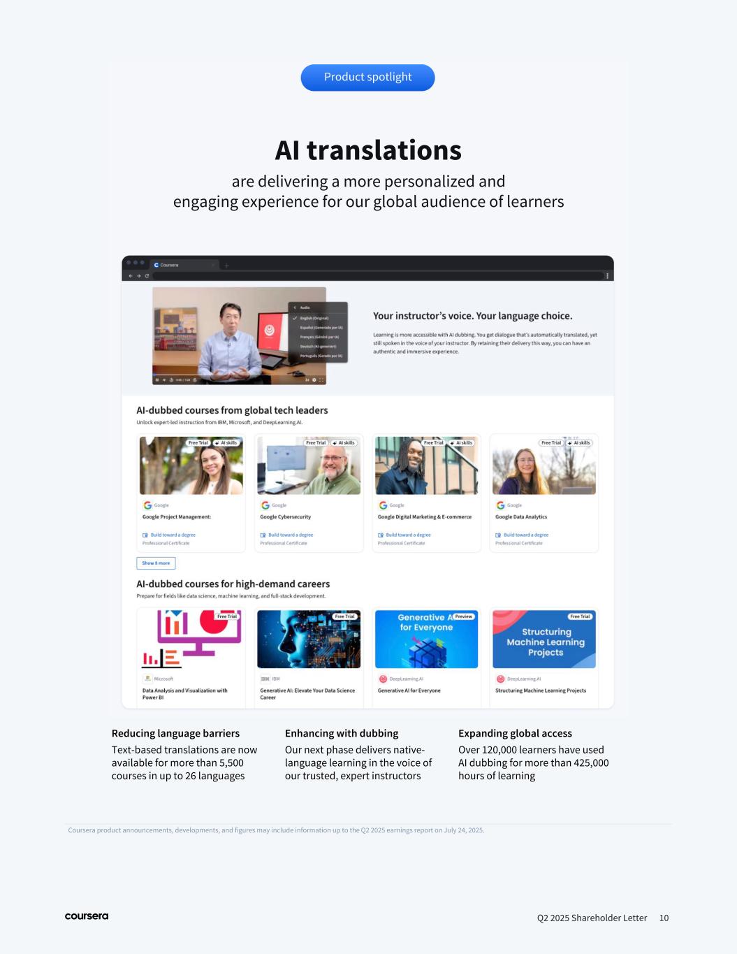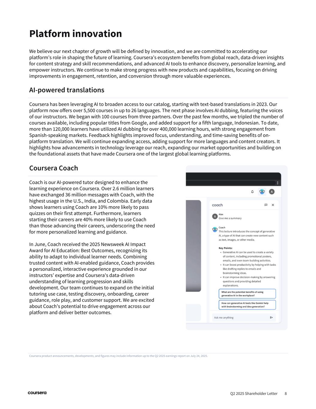 AI-powered translations Coursera has been leveraging AI to broaden access to our catalog, starting with text-based translations in 2023. Our platform now offers over 5,500 courses in up to 26 languages. The next phase involves AI dubbing, featuring the voices of our instructors. We began with 100 courses from three partners. Over the past few months, we tripled the number of courses available, including popular titles from Google, and added support for a fifth language, Indonesian. To date, more than 120,000 learners have utilized AI dubbing for over 400,000 learning hours, with strong engagement from Spanish-speaking markets. Feedback highlights improved focus, understanding, and time-saving benefits of on- platform translation. We will continue expanding access, adding support for more languages and content creators. It highlights how advancements in technology leverage our reach, expanding our market opportunities and building on the foundational assets that have made Coursera one of the largest global learning platforms. Platform innovation Coursera product announcements, developments, and figures may include information up to the Q2 2025 earnings report on July 24, 2025. Q2 2025 Shareholder Letter 8 We believe our next chapter of growth will be defined by innovation, and we are committed to accelerating our platform’s role in shaping the future of learning. Coursera’s ecosystem benefits from global reach, data-driven insights for content strategy and skill recommendations, and advanced AI tools to enhance discovery, personalize learning, and empower instructors. We continue to make strong progress with new products and capabilities, focusing on driving improvements in engagement, retention, and conversion through more valuable experiences. Coursera Coach Coach is our AI-powered tutor designed to enhance the learning experience on Coursera. Over 2.6 million learners have exchanged 36 million messages with Coach, with the highest usage in the U.S., India, and Colombia. Early data shows learners using Coach are 10% more likely to pass quizzes on their first attempt. Furthermore, learners starting their careers are 40% more likely to use Coach than those advancing their careers, underscoring the need for more personalized learning and guidance. In June, Coach received the 2025 Newsweek AI Impact Award for AI Education: Best Outcomes, recognizing its ability to adapt to individual learner needs. Combining trusted content with AI-enabled guidance, Coach provides a personalized, interactive experience grounded in our instructors’ expertise and Coursera's data-driven understanding of learning progression and skills development. Our team continues to expand on the initial tutoring use case, testing discovery, onboarding, career guidance, role play, and customer support. We are excited about Coach’s potential to drive engagement across our platform and deliver better outcomes.