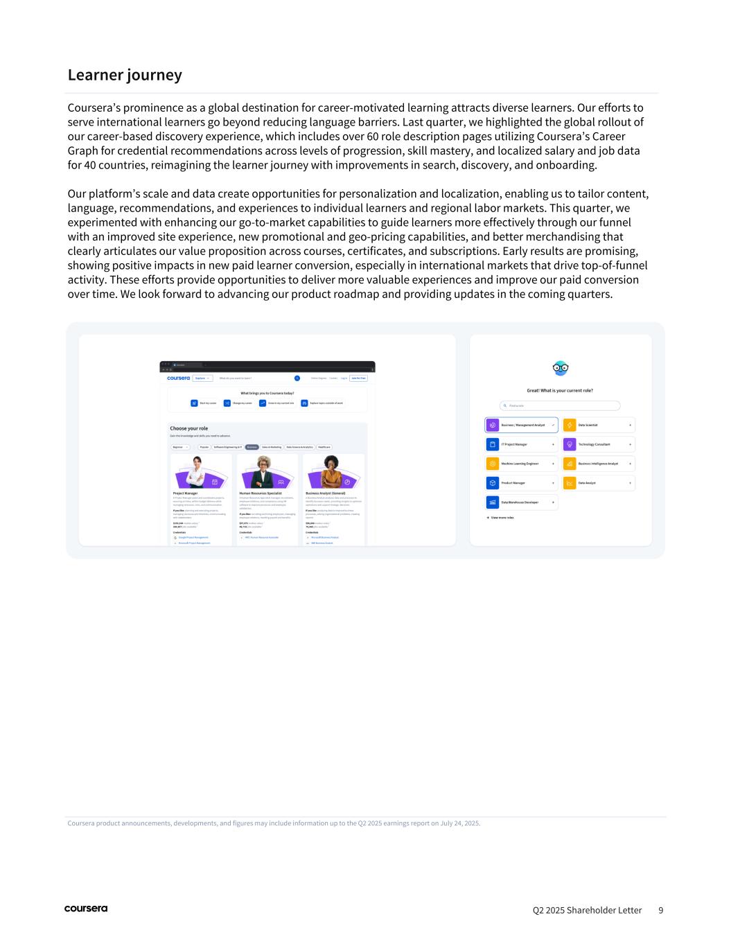 Coursera product announcements, developments, and figures may include information up to the Q2 2025 earnings report on July 24, 2025. Q2 2025 Shareholder Letter 9 Learner journey Coursera’s prominence as a global destination for career-motivated learning attracts diverse learners. Our efforts to serve international learners go beyond reducing language barriers. Last quarter, we highlighted the global rollout of our career-based discovery experience, which includes over 60 role description pages utilizing Coursera’s Career Graph for credential recommendations across levels of progression, skill mastery, and localized salary and job data for 40 countries, reimagining the learner journey with improvements in search, discovery, and onboarding. Our platform’s scale and data create opportunities for personalization and localization, enabling us to tailor content, language, recommendations, and experiences to individual learners and regional labor markets. This quarter, we experimented with enhancing our go-to-market capabilities to guide learners more effectively through our funnel with an improved site experience, new promotional and geo-pricing capabilities, and better merchandising that clearly articulates our value proposition across courses, certificates, and subscriptions. Early results are promising, showing positive impacts in new paid learner conversion, especially in international markets that drive top-of-funnel activity. These efforts provide opportunities to deliver more valuable experiences and improve our paid conversion over time. We look forward to advancing our product roadmap and providing updates in the coming quarters.