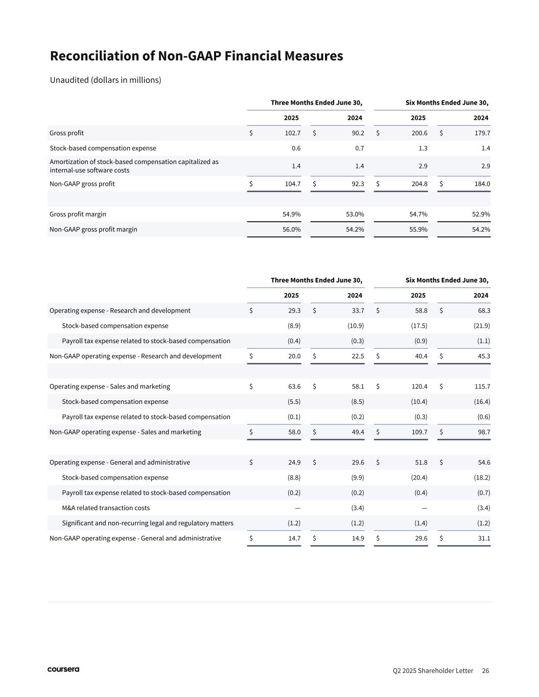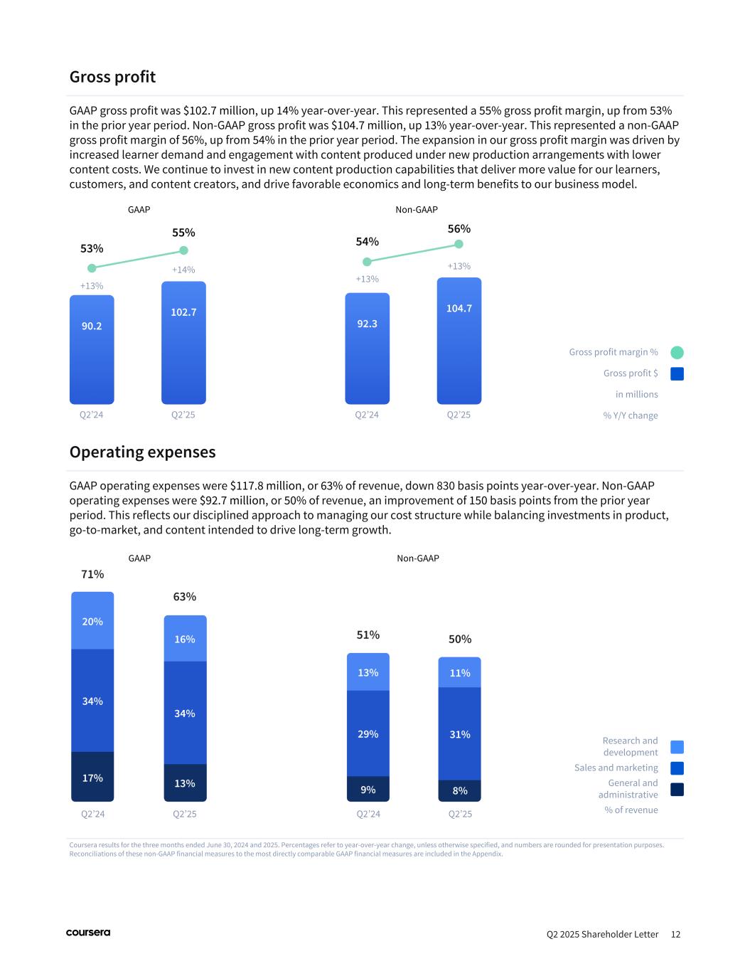 Q2 2025 Shareholder Letter 12 Gross profit GAAP gross profit was $102.7 million, up 14% year-over-year. This represented a 55% gross profit margin, up from 53% in the prior year period. Non-GAAP gross profit was $104.7 million, up 13% year-over-year. This represented a non-GAAP gross profit margin of 56%, up from 54% in the prior year period. The expansion in our gross profit margin was driven by increased learner demand and engagement with content produced under new production arrangements with lower content costs. We continue to invest in new content production capabilities that deliver more value for our learners, customers, and content creators, and drive favorable economics and long-term benefits to our business model. Coursera results for the three months ended June 30, 2024 and 2025. Percentages refer to year-over-year change, unless otherwise specified, and numbers are rounded for presentation purposes. Reconciliations of these non-GAAP financial measures to the most directly comparable GAAP financial measures are included in the Appendix. Operating expenses GAAP operating expenses were $117.8 million, or 63% of revenue, down 830 basis points year-over-year. Non-GAAP operating expenses were $92.7 million, or 50% of revenue, an improvement of 150 basis points from the prior year period. This reflects our disciplined approach to managing our cost structure while balancing investments in product, go-to-market, and content intended to drive long-term growth. Research and development Sales and marketing General and administrative % of revenue Gross profit margin % Gross profit $ in millions % Y/Y change GAAP Non-GAAP GAAP Non-GAAP