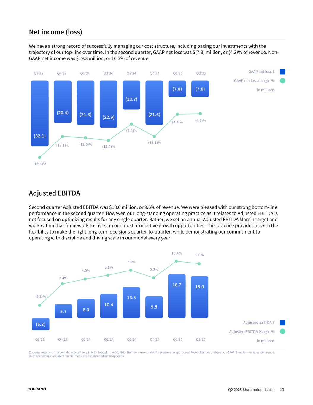 Net income (loss) We have a strong record of successfully managing our cost structure, including pacing our investments with the trajectory of our top-line over time. In the second quarter, GAAP net loss was $(7.8) million, or (4.2)% of revenue. Non- GAAP net income was $19.3 million, or 10.3% of revenue. Q2 2025 Shareholder Letter 13 Coursera results for the periods reported July 1, 2023 through June 30, 2025. Numbers are rounded for presentation purposes. Reconciliations of these non-GAAP financial measures to the most directly comparable GAAP financial measures are included in the Appendix. Adjusted EBITDA Second quarter Adjusted EBITDA was $18.0 million, or 9.6% of revenue. We were pleased with our strong bottom-line performance in the second quarter. However, our long-standing operating practice as it relates to Adjusted EBITDA is not focused on optimizing results for any single quarter. Rather, we set an annual Adjusted EBITDA Margin target and work within that framework to invest in our most productive growth opportunities. This practice provides us with the flexibility to make the right long-term decisions quarter-to-quarter, while demonstrating our commitment to operating with discipline and driving scale in our model every year. GAAP net loss $ GAAP net loss margin % in millions Adjusted EBITDA $ Adjusted EBITDA Margin % in millions