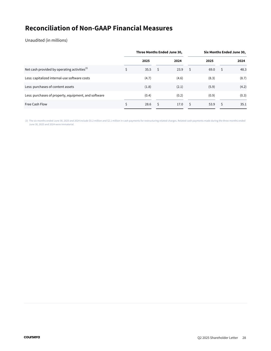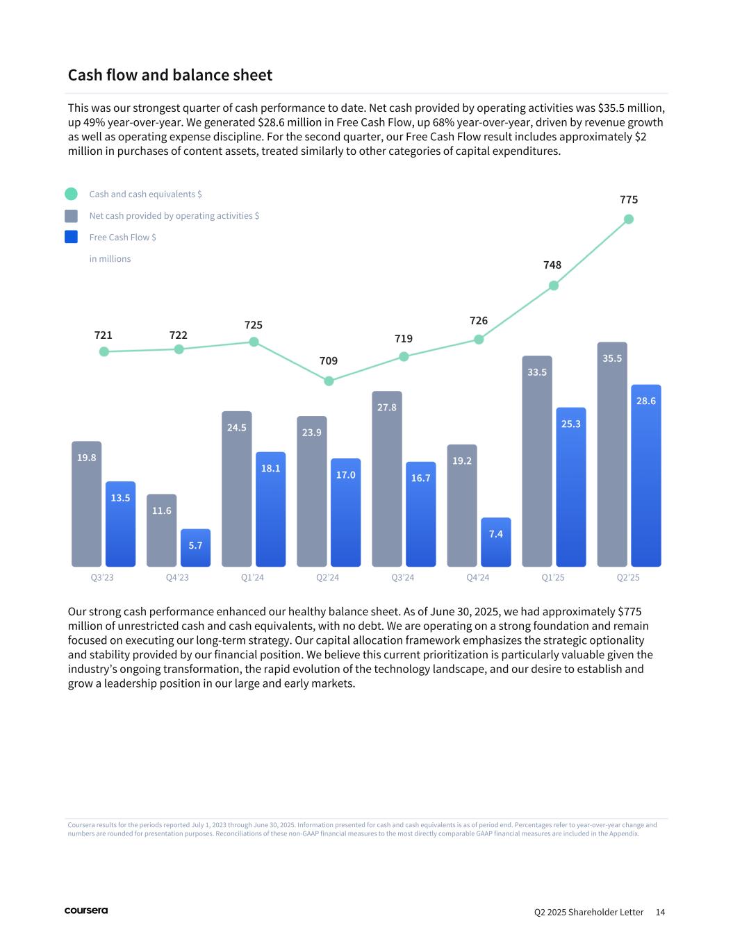 Cash flow and balance sheet This was our strongest quarter of cash performance to date. Net cash provided by operating activities was $35.5 million, up 49% year-over-year. We generated $28.6 million in Free Cash Flow, up 68% year-over-year, driven by revenue growth as well as operating expense discipline. For the second quarter, our Free Cash Flow result includes approximately $2 million in purchases of content assets, treated similarly to other categories of capital expenditures. Q2 2025 Shareholder Letter 14 Coursera results for the periods reported July 1, 2023 through June 30, 2025. Information presented for cash and cash equivalents is as of period end. Percentages refer to year-over-year change and numbers are rounded for presentation purposes. Reconciliations of these non-GAAP financial measures to the most directly comparable GAAP financial measures are included in the Appendix. Our strong cash performance enhanced our healthy balance sheet. As of June 30, 2025, we had approximately $775 million of unrestricted cash and cash equivalents, with no debt. We are operating on a strong foundation and remain focused on executing our long-term strategy. Our capital allocation framework emphasizes the strategic optionality and stability provided by our financial position. We believe this current prioritization is particularly valuable given the industry’s ongoing transformation, the rapid evolution of the technology landscape, and our desire to establish and grow a leadership position in our large and early markets. Cash and cash equivalents $ Net cash provided by operating activities $ Free Cash Flow $ in millions