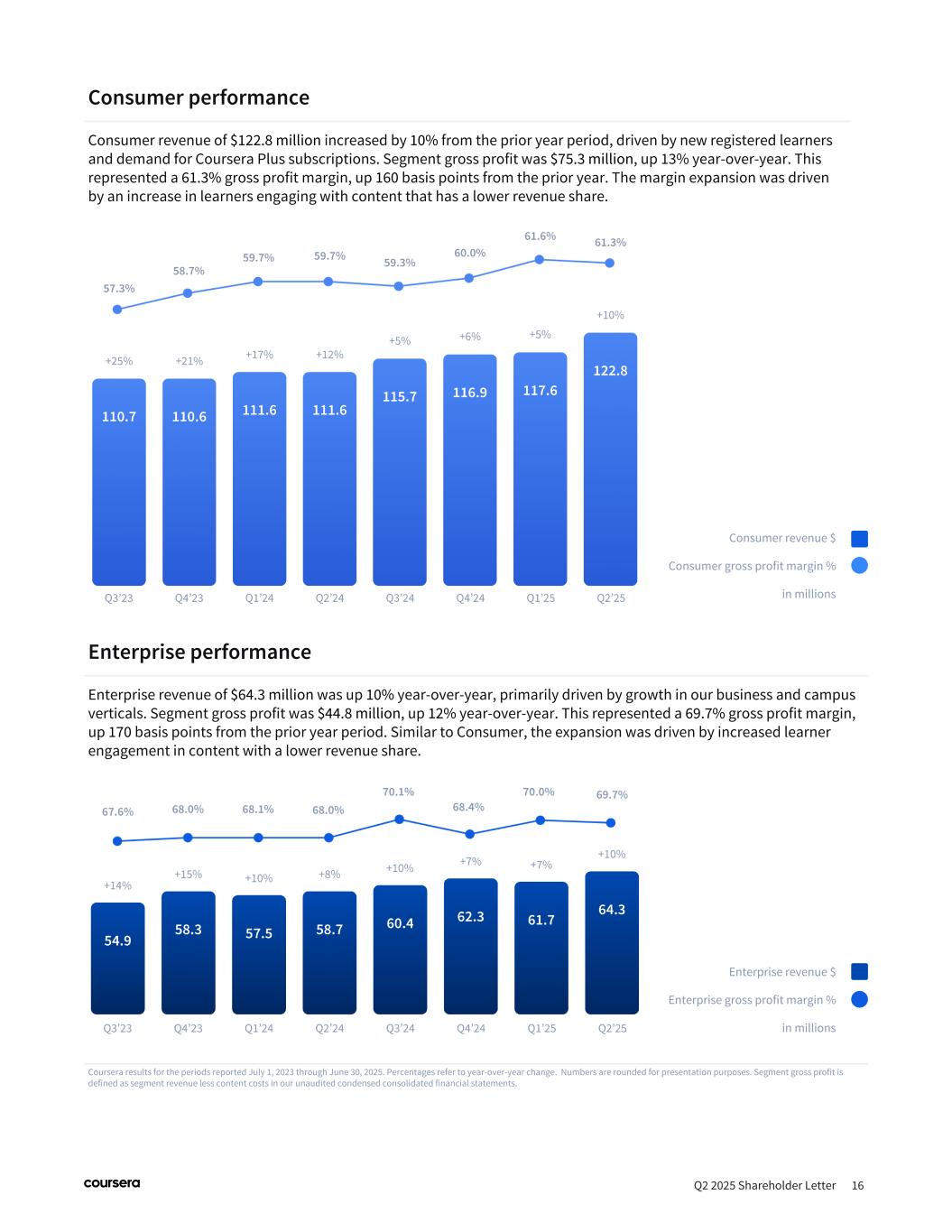 Q2 2025 Shareholder Letter 16 Enterprise performance Enterprise revenue of $64.3 million was up 10% year-over-year, primarily driven by growth in our business and campus verticals. Segment gross profit was $44.8 million, up 12% year-over-year. This represented a 69.7% gross profit margin, up 170 basis points from the prior year period. Similar to Consumer, the expansion was driven by increased learner engagement in content with a lower revenue share. Consumer performance Consumer revenue of $122.8 million increased by 10% from the prior year period, driven by new registered learners and demand for Coursera Plus subscriptions. Segment gross profit was $75.3 million, up 13% year-over-year. This represented a 61.3% gross profit margin, up 160 basis points from the prior year. The margin expansion was driven by an increase in learners engaging with content that has a lower revenue share. Coursera results for the periods reported July 1, 2023 through June 30, 2025. Percentages refer to year-over-year change. Numbers are rounded for presentation purposes. Segment gross profit is defined as segment revenue less content costs in our unaudited condensed consolidated financial statements. Enterprise revenue $ Enterprise gross profit margin % in millions Consumer revenue $ Consumer gross profit margin % in millions