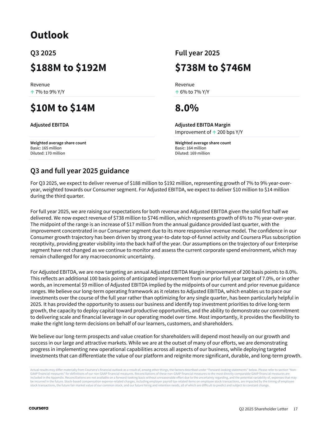 Outlook Actual results may differ materially from Coursera’s financial outlook as a result of, among other things, the factors described under “Forward-looking statements” below. Please refer to section “Non- GAAP financial measures” for definitions of our non-GAAP financial measures. Reconciliations of these non-GAAP financial measures to the most directly comparable GAAP financial measures are included in the Appendix. Reconciliations are not available on a forward-looking basis without unreasonable effort due to the uncertainty regarding, and the potential variability of, expenses that may be incurred in the future. Stock-based compensation expense-related charges, including employer payroll tax-related items on employee stock transactions, are impacted by the timing of employee stock transactions, the future fair market value of our common stock, and our future hiring and retention needs, all of which are difficult to predict and subject to constant change. Q2 2025 Shareholder Letter 17 Q3 2025 Full year 2025 $188M to $192M Revenue ↑ 7% to 9% Y/Y $738M to $746M Revenue ↑ 6% to 7% Y/Y $10M to $14M Adjusted EBITDA 8.0% Adjusted EBITDA Margin Improvement of ↑ 200 bps Y/Y Weighted average share count Basic: 165 million Diluted: 170 million Weighted average share count Basic: 164 million Diluted: 169 million Q3 and full year 2025 guidance For Q3 2025, we expect to deliver revenue of $188 million to $192 million, representing growth of 7% to 9% year-over- year, weighted towards our Consumer segment. For Adjusted EBITDA, we expect to deliver $10 million to $14 million during the third quarter. For full year 2025, we are raising our expectations for both revenue and Adjusted EBITDA given the solid first half we delivered. We now expect revenue of $738 million to $746 million, which represents growth of 6% to 7% year-over-year. The midpoint of the range is an increase of $17 million from the annual guidance provided last quarter, with the improvement concentrated in our Consumer segment due to its more responsive revenue model. The confidence in our Consumer growth trajectory has been driven by strong year-to-date top-of-funnel activity and Coursera Plus subscription receptivity, providing greater visibility into the back half of the year. Our assumptions on the trajectory of our Enterprise segment have not changed as we continue to monitor and assess the current corporate spend environment, which may remain challenged for any macroeconomic uncertainty. For Adjusted EBITDA, we are now targeting an annual Adjusted EBITDA Margin improvement of 200 basis points to 8.0%. This reflects an additional 100 basis points of anticipated improvement from our prior full year target of 7.0%, or in other words, an incremental $9 million of Adjusted EBITDA implied by the midpoints of our current and prior revenue guidance ranges. We believe our long-term operating framework as it relates to Adjusted EBITDA, which enables us to pace our investments over the course of the full year rather than optimizing for any single quarter, has been particularly helpful in 2025. It has provided the opportunity to assess our business and identify top investment priorities to drive long-term growth, the capacity to deploy capital toward productive opportunities, and the ability to demonstrate our commitment to delivering scale and financial leverage in our operating model over time. Most importantly, it provides the flexibility to make the right long-term decisions on behalf of our learners, customers, and shareholders. We believe our long-term prospects and value creation for shareholders will depend most heavily on our growth and success in our large and attractive markets. While we are at the outset of many of our efforts, we are demonstrating progress in implementing new operational capabilities across all aspects of our business, while deploying targeted investments that can differentiate the value of our platform and reignite more significant, durable, and long-term growth.