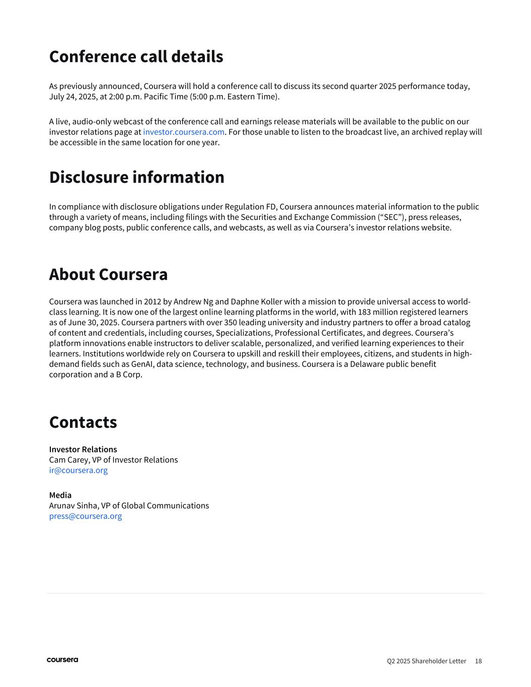 Conference call details Q2 2025 Shareholder Letter 18 As previously announced, Coursera will hold a conference call to discuss its second quarter 2025 performance today, July 24, 2025, at 2:00 p.m. Pacific Time (5:00 p.m. Eastern Time). A live, audio-only webcast of the conference call and earnings release materials will be available to the public on our investor relations page at investor.coursera.com. For those unable to listen to the broadcast live, an archived replay will be accessible in the same location for one year. Disclosure information In compliance with disclosure obligations under Regulation FD, Coursera announces material information to the public through a variety of means, including filings with the Securities and Exchange Commission (“SEC”), press releases, company blog posts, public conference calls, and webcasts, as well as via Coursera’s investor relations website. About Coursera Coursera was launched in 2012 by Andrew Ng and Daphne Koller with a mission to provide universal access to world- class learning. It is now one of the largest online learning platforms in the world, with 183 million registered learners as of June 30, 2025. Coursera partners with over 350 leading university and industry partners to offer a broad catalog of content and credentials, including courses, Specializations, Professional Certificates, and degrees. Coursera’s platform innovations enable instructors to deliver scalable, personalized, and verified learning experiences to their learners. Institutions worldwide rely on Coursera to upskill and reskill their employees, citizens, and students in high- demand fields such as GenAI, data science, technology, and business. Coursera is a Delaware public benefit corporation and a B Corp. Contacts Investor Relations Cam Carey, VP of Investor Relations ir@coursera.org Media Arunav Sinha, VP of Global Communications press@coursera.org