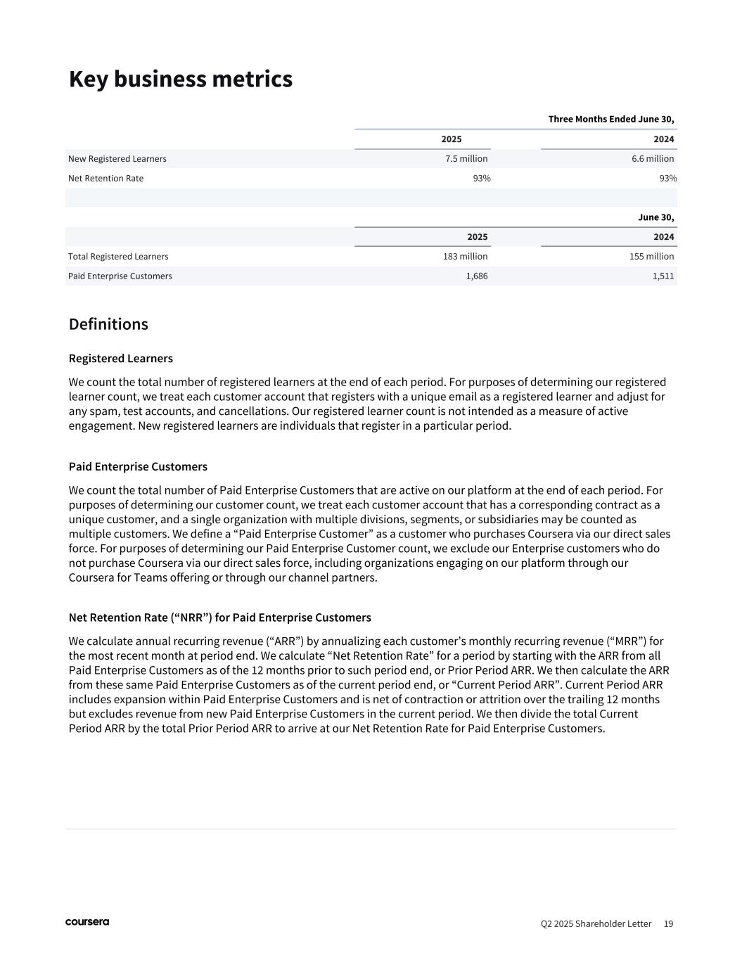 Key business metrics Q2 2025 Shareholder Letter 19 Definitions Registered Learners We count the total number of registered learners at the end of each period. For purposes of determining our registered learner count, we treat each customer account that registers with a unique email as a registered learner and adjust for any spam, test accounts, and cancellations. Our registered learner count is not intended as a measure of active engagement. New registered learners are individuals that register in a particular period. Paid Enterprise Customers We count the total number of Paid Enterprise Customers that are active on our platform at the end of each period. For purposes of determining our customer count, we treat each customer account that has a corresponding contract as a unique customer, and a single organization with multiple divisions, segments, or subsidiaries may be counted as multiple customers. We define a “Paid Enterprise Customer” as a customer who purchases Coursera via our direct sales force. For purposes of determining our Paid Enterprise Customer count, we exclude our Enterprise customers who do not purchase Coursera via our direct sales force, including organizations engaging on our platform through our Coursera for Teams offering or through our channel partners. Net Retention Rate (“NRR”) for Paid Enterprise Customers We calculate annual recurring revenue (“ARR”) by annualizing each customer’s monthly recurring revenue (“MRR”) for the most recent month at period end. We calculate “Net Retention Rate” for a period by starting with the ARR from all Paid Enterprise Customers as of the 12 months prior to such period end, or Prior Period ARR. We then calculate the ARR from these same Paid Enterprise Customers as of the current period end, or “Current Period ARR”. Current Period ARR includes expansion within Paid Enterprise Customers and is net of contraction or attrition over the trailing 12 months but excludes revenue from new Paid Enterprise Customers in the current period. We then divide the total Current Period ARR by the total Prior Period ARR to arrive at our Net Retention Rate for Paid Enterprise Customers. Three Months Ended June 30, 2025 2024 New Registered Learners 7.5 million 6.6 million Net Retention Rate 93 % 93 % June 30, 2025 2024 Total Registered Learners 183 million 155 million Paid Enterprise Customers 1,686 1,511