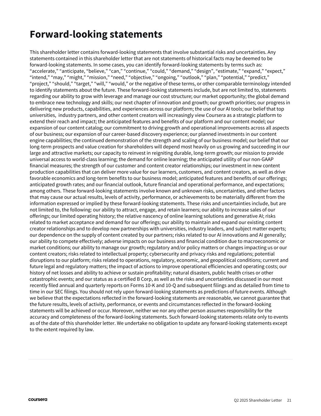 Forward-looking statements Q2 2025 Shareholder Letter 21 This shareholder letter contains forward-looking statements that involve substantial risks and uncertainties. Any statements contained in this shareholder letter that are not statements of historical facts may be deemed to be forward-looking statements. In some cases, you can identify forward-looking statements by terms such as: “accelerate,” “anticipate, “believe,” “can,” “continue,” “could,” “demand,” “design”, “estimate,” “expand,” “expect,” “intend,” “may,” “might,” “mission,” “need,” “objective,” “ongoing,” “outlook,” “plan,” “potential,” “predict,” “project,” “should,” “target,” “will,” “would,” or the negative of these terms, or other comparable terminology intended to identify statements about the future. These forward-looking statements include, but are not limited to, statements regarding our ability to grow with leverage and manage our cost structure; our market opportunity; the global demand to embrace new technology and skills; our next chapter of innovation and growth; our growth priorities; our progress in delivering new products, capabilities, and experiences across our platform; the use of our AI tools; our belief that top universities, industry partners, and other content creators will increasingly view Coursera as a strategic platform to extend their reach and impact; the anticipated features and benefits of our platform and our content model; our expansion of our content catalog; our commitment to driving growth and operational improvements across all aspects of our business; our expansion of our career-based discovery experience; our planned investments in our content engine capabilities; the continued demonstration of the strength and scaling of our business model; our belief that our long-term prospects and value creation for shareholders will depend most heavily on us growing and succeeding in our large and attractive markets; our capacity to reinvest in reigniting durable, long-term growth; our mission to provide universal access to world-class learning; the demand for online learning; the anticipated utility of our non-GAAP financial measures; the strength of our customer and content creator relationships; our investment in new content production capabilities that can deliver more value for our learners, customers, and content creators, as well as drive favorable economics and long-term benefits to our business model; anticipated features and benefits of our offerings; anticipated growth rates; and our financial outlook, future financial and operational performance, and expectations; among others. These forward-looking statements involve known and unknown risks, uncertainties, and other factors that may cause our actual results, levels of activity, performance, or achievements to be materially different from the information expressed or implied by these forward-looking statements. These risks and uncertainties include, but are not limited to, the following: our ability to attract, engage, and retain learners; our ability to increase sales of our offerings; our limited operating history; the relative nascency of online learning solutions and generative AI; risks related to market acceptance and demand for our offerings; our ability to maintain and expand our existing content creator relationships and to develop new partnerships with universities, industry leaders, and subject matter experts; our dependence on the supply of content created by our partners; risks related to our AI innovations and AI generally; our ability to compete effectively; adverse impacts on our business and financial condition due to macroeconomic or market conditions; our ability to manage our growth; regulatory and/or policy matters or changes impacting us or our content creators; risks related to intellectual property; cybersecurity and privacy risks and regulations; potential disruptions to our platform; risks related to operations, regulatory, economic, and geopolitical conditions; current and future legal and regulatory matters; the impact of actions to improve operational efficiencies and operating costs; our history of net losses and ability to achieve or sustain profitability; natural disasters, public health crises or other catastrophic events; and our status as a certified B Corp, as well as the risks and uncertainties discussed in our most recently filed annual and quarterly reports on Forms 10-K and 10-Q and subsequent filings and as detailed from time to time in our SEC filings. You should not rely upon forward-looking statements as predictions of future events. Although we believe that the expectations reflected in the forward-looking statements are reasonable, we cannot guarantee that the future results, levels of activity, performance, or events and circumstances reflected in the forward-looking statements will be achieved or occur. Moreover, neither we nor any other person assumes responsibility for the accuracy and completeness of the forward-looking statements. Such forward-looking statements relate only to events as of the date of this shareholder letter. We undertake no obligation to update any forward-looking statements except to the extent required by law.