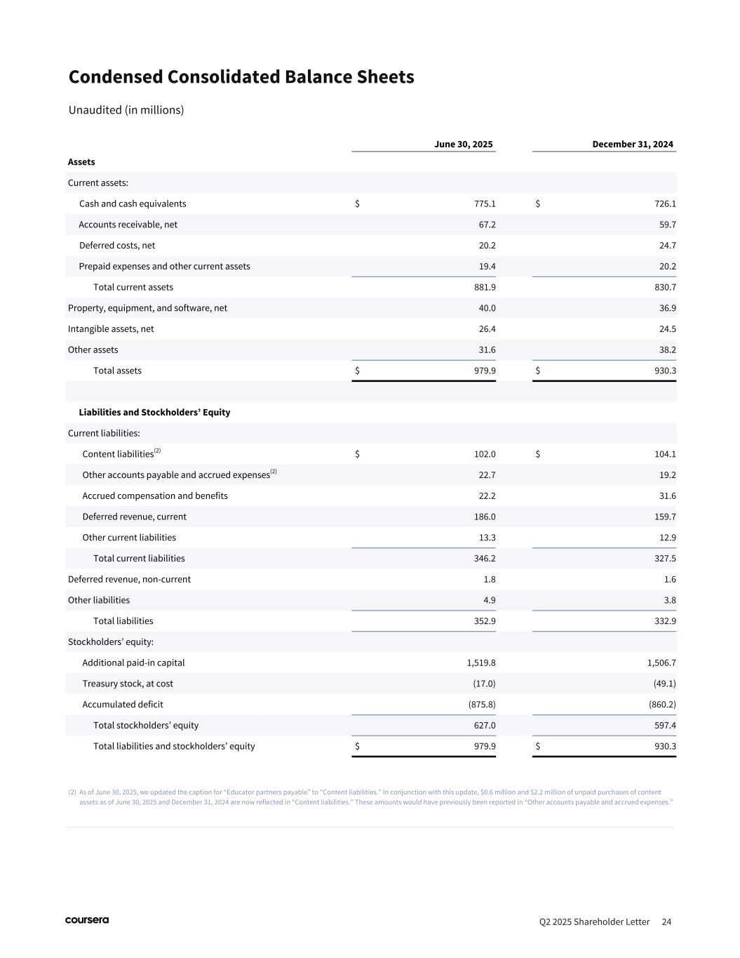 Condensed Consolidated Balance Sheets Unaudited (in millions) Q2 2025 Shareholder Letter 24 June 30, 2025 December 31, 2024 Assets Current assets: Cash and cash equivalents $ 775.1 $ 726.1 Accounts receivable, net 67.2 59.7 Deferred costs, net 20.2 24.7 Prepaid expenses and other current assets 19.4 20.2 Total current assets 881.9 830.7 Property, equipment, and software, net 40.0 36.9 Intangible assets, net 26.4 24.5 Other assets 31.6 38.2 Total assets $ 979.9 $ 930.3 Liabilities and Stockholders’ Equity Current liabilities: Content liabilities(2) $ 102.0 $ 104.1 Other accounts payable and accrued expenses(2) 22.7 19.2 Accrued compensation and benefits 22.2 31.6 Deferred revenue, current 186.0 159.7 Other current liabilities 13.3 12.9 Total current liabilities 346.2 327.5 Deferred revenue, non-current 1.8 1.6 Other liabilities 4.9 3.8 Total liabilities 352.9 332.9 Stockholders’ equity: Additional paid-in capital 1,519.8 1,506.7 Treasury stock, at cost (17.0) (49.1) Accumulated deficit (875.8) (860.2) Total stockholders’ equity 627.0 597.4 Total liabilities and stockholders’ equity $ 979.9 $ 930.3 (2) As of June 30, 2025, we updated the caption for “Educator partners payable” to “Content liabilities.” In conjunction with this update, $0.6 million and $2.2 million of unpaid purchases of content assets as of June 30, 2025 and December 31, 2024 are now reflected in “Content liabilities.” These amounts would have previously been reported in “Other accounts payable and accrued expenses.”