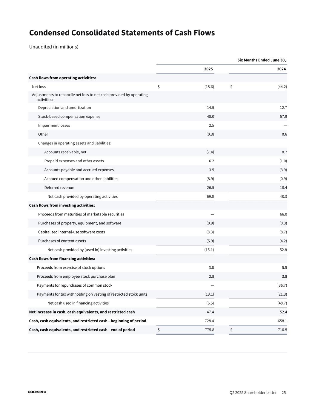 Condensed Consolidated Statements of Cash Flows Unaudited (in millions) Q2 2025 Shareholder Letter 25 Six Months Ended June 30, 2025 2024 Cash flows from operating activities: Net loss $ (15.6) $ (44.2) Adjustments to reconcile net loss to net cash provided by operating activities: Depreciation and amortization 14.5 12.7 Stock-based compensation expense 48.0 57.9 Impairment losses 2.5 — Other (0.3) 0.6 Changes in operating assets and liabilities: Accounts receivable, net (7.4) 8.7 Prepaid expenses and other assets 6.2 (1.0) Accounts payable and accrued expenses 3.5 (3.9) Accrued compensation and other liabilities (8.9) (0.9) Deferred revenue 26.5 18.4 Net cash provided by operating activities 69.0 48.3 Cash flows from investing activities: Proceeds from maturities of marketable securities — 66.0 Purchases of property, equipment, and software (0.9) (0.3) Capitalized internal-use software costs (8.3) (8.7) Purchases of content assets (5.9) (4.2) Net cash provided by (used in) investing activities (15.1) 52.8 Cash flows from financing activities: Proceeds from exercise of stock options 3.8 5.5 Proceeds from employee stock purchase plan 2.8 3.8 Payments for repurchases of common stock — (36.7) Payments for tax withholding on vesting of restricted stock units (13.1) (21.3) Net cash used in financing activities (6.5) (48.7) Net increase in cash, cash equivalents, and restricted cash 47.4 52.4 Cash, cash equivalents, and restricted cash—beginning of period 728.4 658.1 Cash, cash equivalents, and restricted cash—end of period $ 775.8 $ 710.5