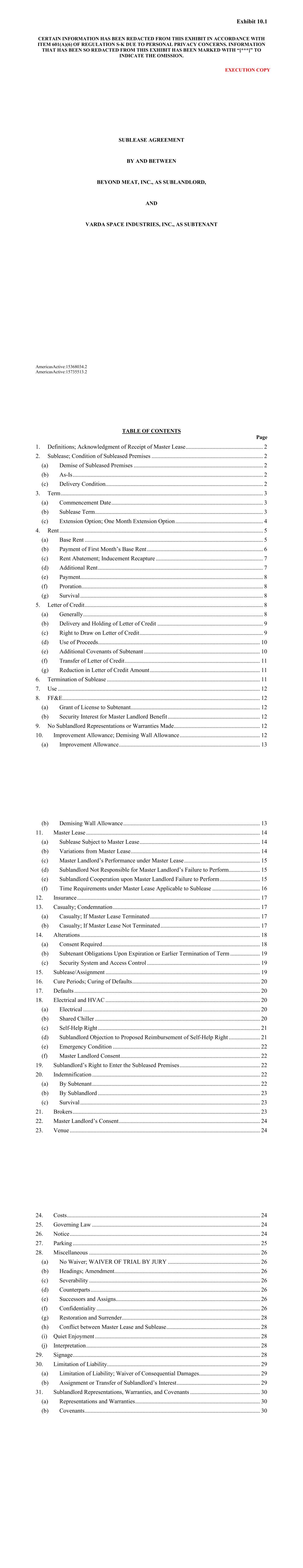 Exhibit 10.1 AmericasActive:15368034.2 AmericasActive:15735513.2 CERTAIN INFORMATION HAS BEEN REDACTED FROM THIS EXHIBIT IN ACCORDANCE WITH ITEM 601(A)(6) OF REGULATION S-K DUE TO PERSONAL PRIVACY CONCERNS. INFORMATION THAT HAS BEEN SO REDACTED FROM THIS EXHIBIT HAS BEEN MARKED WITH “[***]” TO INDICATE THE OMISSION. SUBLEASE AGREEMENT BY AND BETWEEN BEYOND MEAT, INC., AS SUBLANDLORD, AND VARDA SPACE INDUSTRIES, INC., AS SUBTENANT EXECUTION COPY TABLE OF CONTENTS Page 1. Definitions; Acknowledgment of Receipt of Master Lease .................................................... 2 2. Sublease; Condition of Subleased Premises ........................................................................... 2 (a) Demise of Subleased Premises ....................................................................................... 2 (b) As-Is ................................................................................................................................ 2 (c) Delivery Condition.......................................................................................................... 2 3. Term ........................................................................................................................................ 3 (a) Commencement Date ...................................................................................................... 3 (b) Sublease Term ................................................................................................................. 3 (c) Extension Option; One Month Extension Option ........................................................... 4 4. Rent ......................................................................................................................................... 5 (a) Base Rent ........................................................................................................................ 5 (b) Payment of First Month’s Base Rent .............................................................................. 6 (c) Rent Abatement; Inducement Recapture ........................................................................ 7 (d) Additional Rent ............................................................................................................... 7 (e) Payment........................................................................................................................... 8 (f) Proration .......................................................................................................................... 8 (g) Survival ........................................................................................................................... 8 5. Letter of Credit ........................................................................................................................ 8 (a) Generally ......................................................................................................................... 8 (b) Delivery and Holding of Letter of Credit ....................................................................... 9 (c) Right to Draw on Letter of Credit ................................................................................... 9 (d) Use of Proceeds............................................................................................................. 10 (e) Additional Covenants of Subtenant .............................................................................. 10 (f) Transfer of Letter of Credit ........................................................................................... 11 (g) Reduction in Letter of Credit Amount .......................................................................... 11 6. Termination of Sublease ....................................................................................................... 11 7. Use ........................................................................................................................................ 12 8. FF&E..................................................................................................................................... 12 (a) Grant of License to Subtenant....................................................................................... 12 (b) Security Interest for Master Landlord Benefit .............................................................. 12 9. No Sublandlord Representations or Warranties Made.......................................................... 12 10. Improvement Allowance; Demising Wall Allowance ...................................................... 12 (a) Improvement Allowance ............................................................................................... 13 (b) Demising Wall Allowance ............................................................................................ 13 11. Master Lease ..................................................................................................................... 14 (a) Sublease Subject to Master Lease ................................................................................. 14 (b) Variations from Master Lease ....................................................................................... 14 (c) Master Landlord’s Performance under Master Lease ................................................... 15 (d) Sublandlord Not Responsible for Master Landlord’s Failure to Perform..................... 15 (e) Sublandlord Cooperation upon Master Landlord Failure to Perform ........................... 15 (f) Time Requirements under Master Lease Applicable to Sublease ................................ 16 12. Insurance ........................................................................................................................... 17 13. Casualty; Condemnation ................................................................................................... 17 (a) Casualty; If Master Lease Terminated ................................