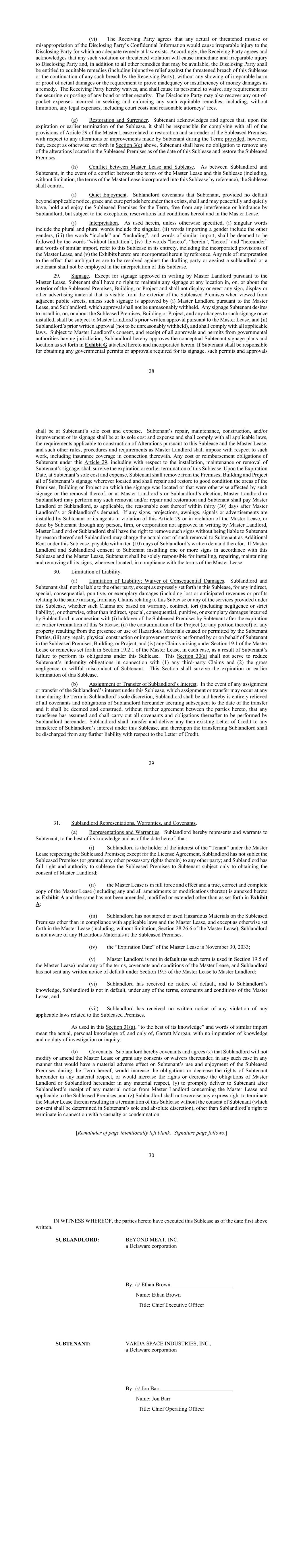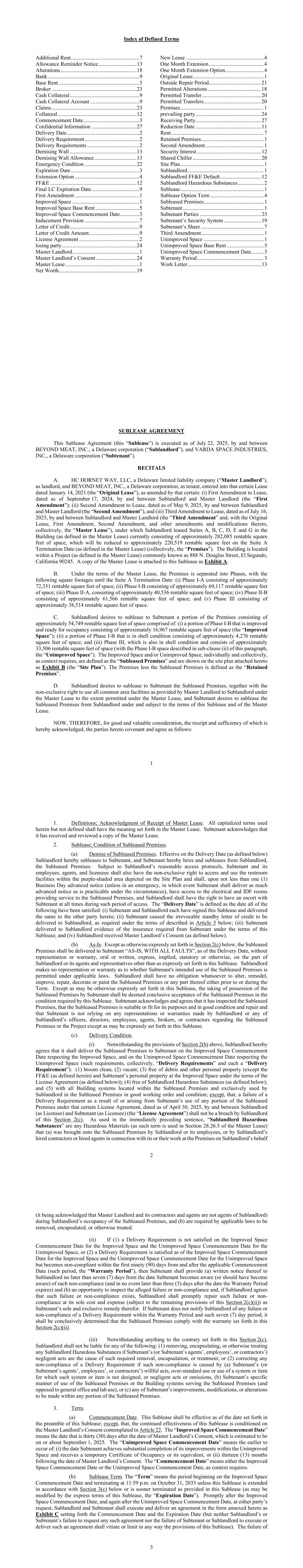 Index of Defined Terms Additional Rent .................................................. 7 Allowance Reminder Notice ............................ 13 Alterations ........................................................ 18 Bank ................................................................... 9 Base Rent ........................................................... 5 Broker .............................................................. 23 Cash Collateral ................................................... 9 Cash Collateral Account .................................... 9 Claims .............................................................. 23 Collateral .......................................................... 12 Commencement Date ......................................... 3 Confidential Information ................................. 27 Delivery Date ..................................................... 2 Delivery Requirement ........................................ 2 Delivery Requirements ...................................... 2 Demising Wall ................................................. 13 Demising Wall Allowance ............................... 13 Emergency Condition ...................................... 22 Expiration Date .................................................. 3 Extension Option ............................................... 4 FF&E ............................................................... 12 Final LC Expiration Date ................................... 9 First Amendment ............................................... 1 Improved Space ................................................. 1 Improved Space Base Rent ................................ 5 Improved Space Commencement Date .............. 3 Inducement Provision ........................................ 7 Letter of Credit ................................................... 9 Letter of Credit Amount ..................................... 9 License Agreement ............................................ 2 losing party....................................................... 24 Master Landlord ................................................. 1 Master Landlord’s Consent .............................. 24 Master Lease ...................................................... 1 Net Worth......................................................... 19 New Lease ......................................................... 4 One Month Extension ........................................ 4 One Month Extension Option ............................ 4 Original Lease .................................................... 1 Outside Repair Period ...................................... 21 Permitted Alterations ....................................... 18 Permitted Transfer ........................................... 20 Permitted Transfers .......................................... 20 Premises ............................................................. 1 prevailing party ................................................ 24 Receiving Party ................................................ 27 Reduction Date ................................................ 11 Rent .................................................................... 7 Retained Premises .............................................. 1 Second Amendment ........................................... 1 Security Interest ............................................... 12 Shared Chiller .................................................. 20 Site Plan ............................................................. 1 Sublandlord ........................................................ 1 Sublandlord FF&E Default .............................. 12 Sublandlord Hazardous Substances ................... 2 Sublease ............................................................. 1 Sublease Option Term ....................................... 4 Subleased Premises ............................................ 1 Subtenant ........................................................... 1 Subtenant Parties ............................................. 23 Subtenant’s Security System ........................... 19 Subtenant’s Share .............................................. 7 Third Amendment .............................................. 1 Unimproved Space ............................................ 1 Unimproved Space Base Rent ........................... 5 Unimproved Space Commencement Date ......... 3 Warranty Period ................................................. 3 Work Letter ...................................................... 13 1 SUBLEASE AGREEMENT This Sublease Agreement (this “Sublease”) is executed as of July 22, 2025, by and between BEYOND MEAT, INC., a Delaware corporation (“Sublandlord”), and VARDA SPACE INDUSTRIES, INC., a Delaware corporation (“Subtenant”). RECITALS A. HC HORNET WAY, LLC, a Delaware limited liability company (“Master Landlord”), as landlord, and BEYOND MEAT, INC., a Delaware corporation, as tenant, entered into that certain Lease dated January 14, 2021 (the “Original Lease”), as amended by that certain: (i) First Amendment to Lease, dated as of September 17, 2024, by and between Sublandlord and Master Landlord (the “First Amendment”); (ii) Second Amendment to Lease, dated as of May 9, 2025, by and between Sublandlord and Master Landlord (the “Second Amendment”), and (iii) Third Amendment to Lease, dated as of July 16, 2025, by and between Sublandlord and Master Landlord (the “Third Amendment” and, with the Original Lease, First Amendment, Second Amendment, and other amendments and modifications thereto, collectively, the “Master Lease”), under which Sublandlord leased Suites A, B, C, D, E and G in the Building (as defined in the Master Lease) currently consisting of approximately 282,085 rentable square feet of space, which will be reduced to approximately 220,519 rentable square feet on the Suite A Termination Date (as defined in the Master Lease)