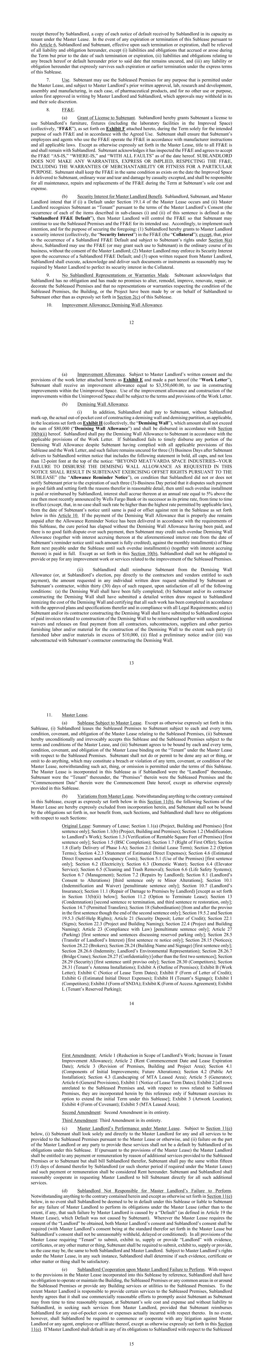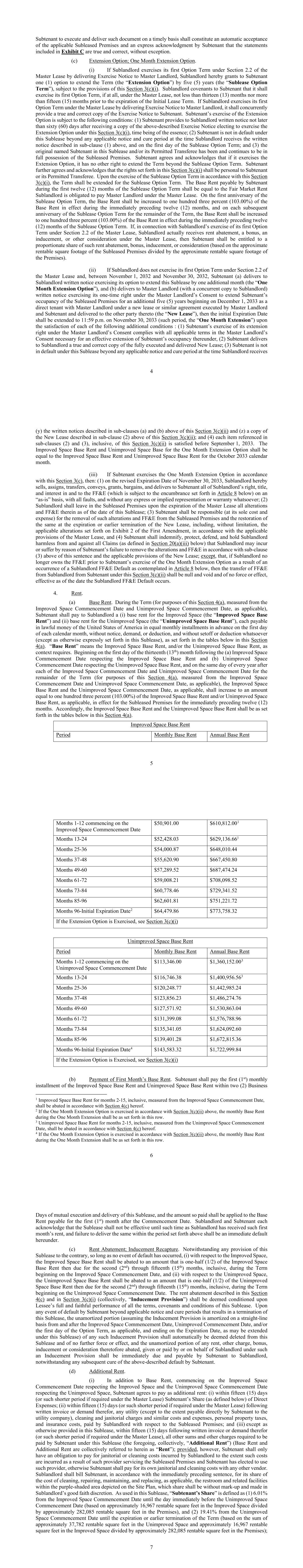 4 Subtenant to execute and deliver such document on a timely basis shall constitute an automatic acceptance of the applicable Subleased Premises and an express acknowledgment by Subtenant that the statements included in Exhibit C are true and correct, without exception. (c) Extension Option; One Month Extension Option. (i) If Sublandlord exercises its first Option Term under Section 2.2 of the Master Lease by delivering Exercise Notice to Master Landlord, Sublandlord hereby grants to Subtenant one (1) option to extend the Term (the “Extension Option”) by five (5) years (the “Sublease Option Term”), subject to the provisions of this Section 3(c)(i). Sublandlord covenants to Subtenant that it shall exercise its first Option Term, if at all, under the Master Lease, not less than thirteen (13) months nor more than fifteen (15) months prior to the expiration of the Initial Lease Term. If Sublandlord exercises its first Option Term under the Master Lease by delivering Exercise Notice to Master Landlord, it shall concurrently provide a true and correct copy of the Exercise Notice to Subtenant. Subtenant’s exercise of the Extension Option is subject to the following conditions: (1) Subtenant provides to Sublandlord written notice not later than sixty (60) days after receiving a copy of the above-described Exercise Notice electing to exercise the Extension Option under this Section 3(c)(i), time being of the essence; (2) Subtenant is not in default under this Sublease beyond any applicable notice and cure period at the time Sublandlord receives the written notice described in sub-clause (1) above, and on the first day of the Sublease Option Term; and (3) the original named Subtenant in this Sublease and/or its Permitted Transferee has been and continues to be in full possession of the Subleased Premises. Subtenant agrees and acknowledges that if it exercises the Extension Option, it has no other right to extend the Term beyond the Sublease Option Term. Subtenant further agrees and acknowledges that the rights set forth in this Section 3(c)(i) shall be personal to Subtenant or its Permitted Transferee. Upon the exercise of the Sublease Option Term in accordance with this Section 3(c)(i), the Term shall be extended for the Sublease Option Term. The Base Rent payable by Subtenant during the first twelve (12) months of the Sublease Option Term shall be equal to the Fair Market Rent Sublandlord is obligated to pay Master Landlord under the Master Lease. On the first anniversary of the Sublease Option Term, the Base Rent shall be increased to one hundred three percent (103.00%) of the Base Rent in effect during the immediately preceding twelve (12) months, and on each subsequent anniversary of the Sublease Option Term for the remainder of the Term, the Base Rent shall be increased to one hundred three percent (103.00%) of the Base Rent in effect during the immediately preceding twelve (12) months of the Sublease Option Term. If, in connection with Sublandlord’s exercise of its first Option Term under Section 2.2 of the Master Lease, Sublandlord actually receives rent abatement, a bonus, an inducement, or other consideration under the Master Lease, then Subtenant shall be entitled to a proportionate share of such rent abatement, bonus, inducement, or consideration (based on the approximate rentable square footage of the Subleased Premises divided by the approximate rentable square footage of the Premises). (ii) If Sublandlord does not exercise its first Option Term under Section 2.2 of the Master Lease and, between November 1, 2032 and November 30, 2032, Subtenant (a) delivers to Sublandlord written notice exercising its option to extend this Sublease by one additional month (the “One Month Extension Option”), and (b) delivers to Master Landlord (with a concurrent copy to Sublandlord) written notice exercising its one-time right under the Master Landlord’s Consent to extend Subtenant’s occupancy of the Subleased Premises for an additional five (5) years beginning on December 1, 2033 as a direct tenant with Master Landlord under a new lease or similar agreement executed by Master Landlord and Subtenant and delivered to the other party thereto (the “New Lease”), then the initial Expiration Date shall be extended to 11:59 p.m. on November 30, 2033 (such period, the “One Month Extension”) upon the satisfaction of each of the following additional conditions : (1) Subtenant’s exercise of its extension right under the Master Landlord’s Consent complies with all applicable terms in the Master Landlord’s Consent necessary for an effective extension of Subtenant’s occupancy thereunder, (2) Subtenant delivers to Sublandlord a true and correct copy of the fully executed and delivered New Lease; (3) Subtenant is not in default under this Sublease beyond any applicable notice and cure period at the time Sublandlord receives 5 (y) the written notices described in sub-clauses (a) and (b) above of this Section 3(c)(ii) and (z) a copy of the New Lease described in sub-clause (2) above of this Section 3(c)(ii); and (4) each item referenced in sub-clauses (2) and (3), inclusive, of this Section 3(c)(ii) is satisfied before September 1, 2033. The Improved Space Base Rent and Unimproved Space Base for the One Month Extension Option shall be equal to the Improved Space Base Rent and Unimproved Space Base Rent for the October 2033 calendar month. (iii) If Subtenant exercises the One Month Extension Option in accordance with this Section 3(c), then: (1) on the revised Expiration Date of November 30, 2033, Sublandlord hereby sells, assigns, transfers, conveys, grants, bargains, and delivers to Subtenant all of Sublandlord’s right, title, and interest in and to the FF&E (which is subject to the encumbrance set forth in Article 8 below) on an “as-is” basis, with all faults, and without any express or implied representation or warranty whatsoever; (2) Sublandlord shall leave in the Sublease