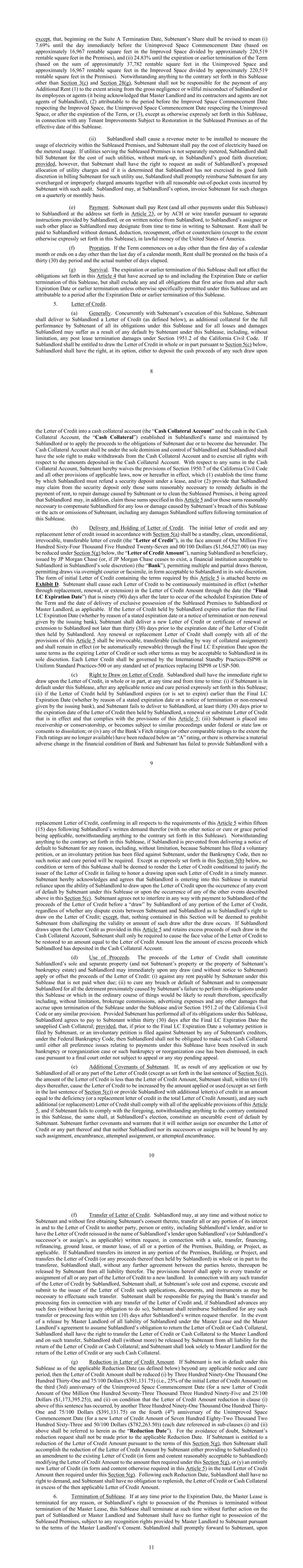 8 except, that, beginning on the Suite A Termination Date, Subtenant’s Share shall be revised to mean (i) 7.69% until the day immediately before the Unimproved Space Commencement Date (based on approximately 16,967 rentable square feet in the Improved Space divided by approximately 220,519 rentable square feet in the Premises), and (ii) 24.83% until the expiration or earlier termination of the Term (based on the sum of approximately 37,782 rentable square feet in the Unimproved Space and approximately 16,967 rentable square feet in the Improved Space divided by approximately 220,519 rentable square feet in the Premises). Notwithstanding anything to the contrary set forth in this Sublease other than Section 3(c) and Section 28(g), Subtenant shall not be responsible for the payment of any Additional Rent (1) to the extent arising from the gross negligence or willful misconduct of Sublandlord or its employees or agents (it being acknowledged that Master Landlord and its contractors and agents are not agents of Sublandlord), (2) attributable to the period before the Improved Space Commencement Date respecting the Improved Space, the Unimproved Space Commencement Date respecting the Unimproved Space, or after the expiration of the Term, or (3), except as otherwise expressly set forth in this Sublease, in connection with any Tenant Improvements Subject to Restoration in the Subleased Premises as of the effective date of this Sublease. (ii) Sublandlord shall cause a revenue meter to be installed to measure the usage of electricity within the Subleased Premises, and Subtenant shall pay the cost of electricity based on the metered usage. If utilities serving the Subleased Premises is not separately metered, Sublandlord shall bill Subtenant for the cost of such utilities, without mark-up, in Sublandlord’s good faith discretion; provided, however, that Subtenant shall have the right to request an audit of Sublandlord’s proposed allocation of utility charges and if it is determined that Sublandlord has not exercised its good faith discretion in billing Subtenant for such utility use, Sublandlord shall promptly reimburse Subtenant for any overcharged or improperly charged amounts together with all reasonable out-of-pocket costs incurred by Subtenant with such audit. Sublandlord may, at Sublandlord’s option, invoice Subtenant for such charges on a quarterly or monthly basis. (e) Payment. Subtenant shall pay Rent (and all other payments under this Sublease) to Sublandlord at the address set forth in Article 23, or by ACH or wire transfer pursuant to separate instructions provided by Sublandlord, or on written notice from Sublandlord, to Sublandlord’s assignee or such other place as Sublandlord may designate from time to time in writing to Subtenant. Rent shall be paid to Sublandlord without demand, deduction, recoupment, offset or counterclaim (except to the extent otherwise expressly set forth in this Sublease), in lawful money of the United States of America. (f) Proration. If the Term commences on a day other than the first day of a calendar month or ends on a day other than the last day of a calendar month, Rent shall be prorated on the basis of a thirty (30) day period and the actual number of days elapsed. (g) Survival. The expiration or earlier termination of this Sublease shall not affect the obligations set forth in this Article 4 that have accrued up to and including the Expiration Date or earlier termination of this Sublease, but shall exclude any and all obligations that first arise from and after such Expiration Date or earlier termination unless otherwise specifically permitted under this Sublease and are attributable to a period after the Expiration Date or earlier termination of this Sublease. 5. Letter of Credit. (a) Generally. Concurrently with Subtenant’s execution of this Sublease, Subtenant shall deliver to Sublandlord a Letter of Credit (as defined below), as additional collateral for the full performance by Subtenant of all its obligations under this Sublease and for all losses and damages Sublandlord may suffer as a result of any default by Subtenant under this Sublease, including, without limitation, any post lease termination damages under Section 1951.2 of the California Civil Code. If Sublandlord shall be entitled to draw the Letter of Credit in whole or in part pursuant to Section 5(c) below, Sublandlord shall have the right, at its option, either to deposit the cash proceeds of any such draw upon 9 the Letter of Credit into a cash collateral account (the “Cash Collateral Account” and the cash in the Cash Collateral Account, the “Cash Collateral”) established in Sublandlord’s name and maintained by Sublandlord or to apply the proceeds to the obligations of Subtenant due or to become due hereunder. The Cash Collateral Account shall be under the sole dominion and control of Sublandlord and Sublandlord shall have the sole right to make withdrawals from the Cash Collateral Account and to exercise all rights with respect to the amounts deposited in the Cash Collateral Account. With respect to any sums in the Cash Collateral Account, Subtenant hereby waives the provisions of Section 1950.7 of the California Civil Code and all other provisions of applicable laws, now or hereafter in effect, which (1) establish the time frame by which Sublandlord must refund a security deposit under a lease, and/or (2) provide that Sublandlord may claim from the security deposit only those sums reasonably necessary to remedy defaults in the payment of rent, to repair damage caused by Subtenant or to clean the Subleased Premises, it being agreed that Sublandlord may, in addition, claim those sums specified in this Article 5 and/or those sums reasonably necessary to compensate Sublandlord for any loss or damage caused by Subtenant’s breach of this Sublease or the acts or omissions of Subtenant, including any damages Sublandlord suffers following termination of this Sublease. (