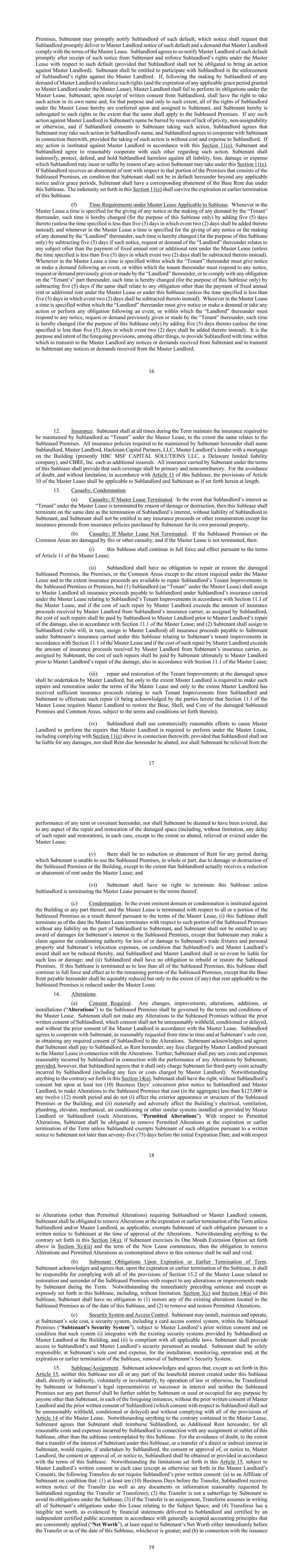 16 Premises, Subtenant may promptly notify Sublandlord of such default, which notice shall request that Sublandlord promptly deliver to Master Landlord notice of such default and a demand that Master Landlord comply with the terms of the Master Lease. Sublandlord agrees to so notify Master Landlord of such default promptly after receipt of such notice from Subtenant and enforce Sublandlord’s rights under the Master Lease with respect to such default (provided that Sublandlord shall not be obligated to bring an action against Master Landlord). Subtenant shall be entitled to participate with Sublandlord in the enforcement of Sublandlord’s rights against the Master Landlord. If, following the making by Sublandlord of any demand of Master Landlord to enforce such rights (and the expiration of any applicable grace period granted to Master Landlord under the Master Lease), Master Landlord shall fail to perform its obligations under the Master Lease, Subtenant, upon receipt of written consent from Sublandlord, shall have the right to take such action in its own name and, for that purpose and only to such extent, all of the rights of Sublandlord under the Master Lease hereby are conferred upon and assigned to Subtenant, and Subtenant hereby is subrogated to such rights to the extent that the same shall apply to the Subleased Premises. If any such action against Master Landlord in Subtenant's name be barred by reason of lack of privity, non-assignability or otherwise, and if Sublandlord consents to Subtenant taking such action, Sublandlord agrees that Subtenant may take such action in Sublandlord's name, and Sublandlord agrees to cooperate with Subtenant in connection therewith, provided the taking of such action is without cost and expense to Sublandlord. If any action is instituted against Master Landlord in accordance with this Section 11(e), Subtenant and Sublandlord agree to reasonably cooperate with each other regarding such action. Subtenant shall indemnify, protect, defend, and hold Sublandlord harmless against all liability, loss, damage or expense which Sublandlord may incur or suffer by reason of any action Subtenant may take under this Section 11(e). If Sublandlord receives an abatement of rent with respect to that portion of the Premises that consists of the Subleased Premises, on condition that Subtenant shall not be in default hereunder beyond any applicable notice and/or grace periods, Subtenant shall have a corresponding abatement of the Base Rent due under this Sublease. The indemnity set forth in this Section 11(e) shall survive the expiration or earlier termination of this Sublease. (f) Time Requirements under Master Lease Applicable to Sublease. Whenever in the Master Lease a time is specified for the giving of any notice or the making of any demand by the “Tenant” thereunder, such time is hereby changed (for the purpose of this Sublease only) by adding five (5) days thereto (unless the time specified is less than five (5) days in which event two (2) days shall be added thereto instead); and whenever in the Master Lease a time is specified for the giving of any notice or the making of any demand by the “Landlord” thereunder, such time is hereby changed (for the purpose of this Sublease only) by subtracting five (5) days if such notice, request or demand of the “Landlord” thereunder relates to any subject other than the payment of fixed annual rent or additional rent under the Master Lease (unless the time specified is less than five (5) days in which event two (2) days shall be subtracted thereto instead). Whenever in the Master Lease a time is specified within which the “Tenant” thereunder must give notice or make a demand following an event, or within which the tenant thereunder must respond to any notice, request or demand previously given or made by the “Landlord” thereunder, or to comply with any obligation on the “Tenant’s” part thereunder, such time is hereby changed (for the purpose of this Sublease only) by subtracting five (5) days if the same shall relate to any obligation other than the payment of fixed annual rent or additional rent under the Master Lease or under this Sublease (unless the time specified is less than five (5) days in which event two (2) days shall be subtracted thereto instead). Wherever in the Master Lease a time is specified within which the “Landlord” thereunder must give notice or make a demand or take any action or perform any obligation following an event, or within which the “Landlord” thereunder must respond to any notice, request or demand previously given or made by the “Tenant” thereunder, such time is hereby changed (for the purpose of this Sublease only) by adding five (5) days thereto (unless the time specified is less than five (5) days in which event two (2) days shall be added thereto instead). It is the purpose and intent of the foregoing provisions, among other things, to provide Sublandlord with time within which to transmit to the Master Landlord any notices or demands received from Subtenant and to transmit to Subtenant any notices or demands received from the Master Landlord. 17 12. Insurance. Subtenant shall at all times during the Term maintain the insurance required to be maintained by Sublandlord as “Tenant” under the Master Lease, to the extent the same relates to the Subleased Premises. All insurance policies required to be maintained by Subtenant hereunder shall name Sublandlord, Master Landlord, Hackman Capital Partners, LLC, Master Landlord’s lender with a mortgage on the Building (presently HBC MSF CAPITAL SOLUTIONS LLC, a Delaware limited liability company), and CBRE, Inc. each as additional insureds. All insurance carried by Subtenant under the terms of this Sublease shall provide that such coverage shall be primary and noncontributory. For the avoidance of doubt, and without limitation, in accordance with Article 11 of this Sublease, the provisions of Article 10 o