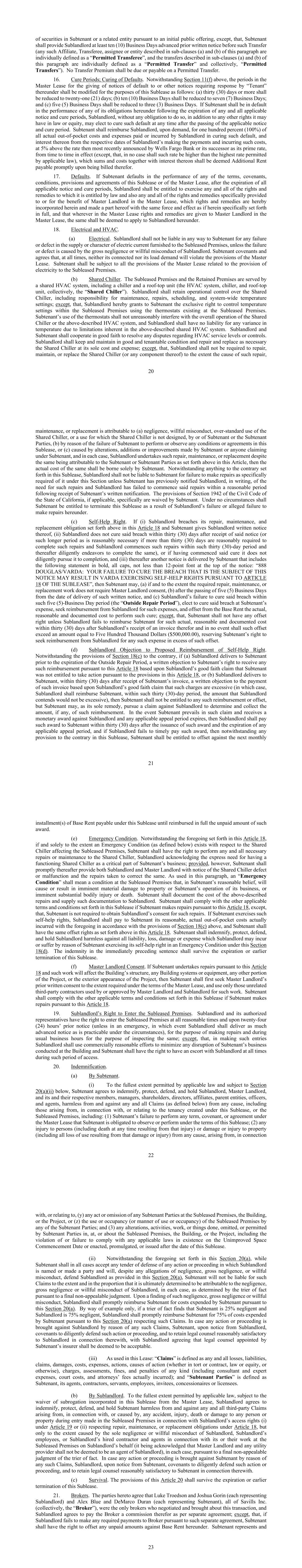 20 of securities in Subtenant or a related entity pursuant to an initial public offering, except, that, Subtenant shall provide Sublandlord at least ten (10) Business Days advanced prior written notice before such Transfer (any such Affiliate, Transferee, assignee or entity described in sub-clauses (a) and (b) of this paragraph are individually defined as a “Permitted Transferee”, and the transfers described in sub-clauses (a) and (b) of this paragraph are individually defined as a “Permitted Transfer” and collectively, “Permitted Transfers”). No Transfer Premium shall be due or payable on a Permitted Transfer. 16. Cure Periods; Curing of Defaults. Notwithstanding Section 11(f) above, the periods in the Master Lease for the giving of notices of default to or other notices requiring response by “Tenant” thereunder shall be modified for the purposes of this Sublease as follows: (a) thirty (30) days or more shall be reduced to twenty-one (21) days; (b) ten (10) Business Days shall be reduced to seven (7) Business Days; and (c) five (5) Business Days shall be reduced to three (3) Business Days. If Subtenant shall be in default in the performance of any of its obligations hereunder following the expiration of any and all applicable notice and cure periods, Sublandlord, without any obligation to do so, in addition to any other rights it may have in law or equity, may elect to cure such default at any time after the passing of the applicable notice and cure period. Subtenant shall reimburse Sublandlord, upon demand, for one hundred percent (100%) of all actual out-of-pocket costs and expenses paid or incurred by Sublandlord in curing such default, and interest thereon from the respective dates of Sublandlord’s making the payments and incurring such costs, at 5% above the rate then most recently announced by Wells Fargo Bank or its successor as its prime rate, from time to time in effect (except, that, in no case shall such rate be higher than the highest rate permitted by applicable law), which sums and costs together with interest thereon shall be deemed Additional Rent payable promptly upon being billed therefor. 17. Defaults. If Subtenant defaults in the performance of any of the terms, covenants, conditions, provisions and agreements of this Sublease or of the Master Lease, after the expiration of all applicable notice and cure periods, Sublandlord shall be entitled to exercise any and all of the rights and remedies to which it is entitled by law and also any and all of the rights and remedies specifically provided to or for the benefit of Master Landlord in the Master Lease, which rights and remedies are hereby incorporated herein and made a part hereof with the same force and effect as if herein specifically set forth in full, and that wherever in the Master Lease rights and remedies are given to Master Landlord in the Master Lease, the same shall be deemed to apply to Sublandlord hereunder. 18. Electrical and HVAC. (a) Electrical. Sublandlord shall not be liable in any way to Subtenant for any failure or defect in the supply or character of electric current furnished to the Subleased Premises, unless the failure or defect is caused by the gross negligence or willful misconduct of Sublandlord. Subtenant covenants and agrees that, at all times, neither its connected nor its load demand will violate the provisions of the Master Lease. Subtenant shall be subject to all the provisions of the Master Lease related to the provision of electricity to the Subleased Premises. (b) Shared Chiller. The Subleased Premises and the Retained Premises are served by a shared HVAC system, including a chiller and a roof-top unit (the HVAC system, chiller, and roof-top unit, collectively, the “Shared Chiller”). Sublandlord shall retain operational control over the Shared Chiller, including responsibility for maintenance, repairs, scheduling, and system-wide temperature settings; except, that, Sublandlord hereby grants to Subtenant the exclusive right to control temperature settings within the Subleased Premises using the thermostats existing at the Subleased Premises. Subtenant’s use of the thermostats shall not unreasonably interfere with the overall operation of the Shared Chiller or the above-described HVAC system, and Sublandlord shall have no liability for any variance in temperature due to limitations inherent in the above-described shared HVAC system. Sublandlord and Subtenant shall cooperate in good faith to resolve any disputes regarding HVAC service levels or controls. Sublandlord shall keep and maintain in good and tenantable condition and repair and replace as necessary the Shared Chiller at its sole cost and expense; except, that, Sublandlord shall not be required to repair, maintain, or replace the Shared Chiller (or any component thereof) to the extent the cause of such repair, 21 maintenance, or replacement is attributable to (a) negligence, willful misconduct, over-standard use of the Shared Chiller, or a use for which the Shared Chiller is not designed, by or of Subtenant or the Subtenant Parties, (b) by reason of the failure of Subtenant to perform or observe any conditions or agreements in this Sublease, or (c) caused by alterations, additions or improvements made by Subtenant or anyone claiming under Subtenant, and in each case, Sublandlord undertakes such repair, maintenance, or replacement despite the same being attributable to the Subtenant or Subtenant Parties as set forth above in this Article, then the actual cost of the same shall be borne solely by Subtenant. Notwithstanding anything to the contrary set forth in this Sublease, Sublandlord shall not be liable to Subtenant for failure to make repairs as specifically required of it under this Section unless Subtenant has previously notified Sublandlord, in writing, of the need for such repairs and Sublandlord has failed to commence said repairs within a reasonable period following receipt of Subtenant’s writt