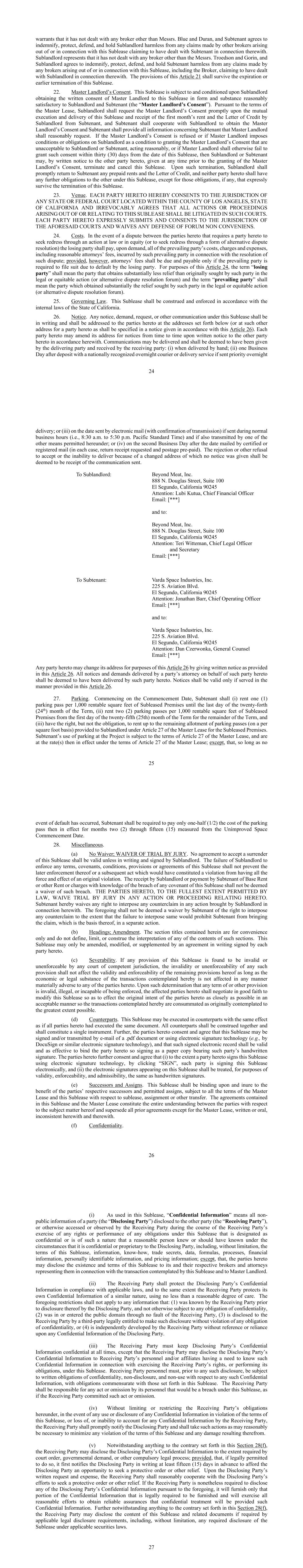 24 warrants that it has not dealt with any broker other than Messrs. Blue and Duran, and Subtenant agrees to indemnify, protect, defend, and hold Sublandlord harmless from any claims made by other brokers arising out of or in connection with this Sublease claiming to have dealt with Subtenant in connection therewith. Sublandlord represents that it has not dealt with any broker other than the Messrs. Troedson and Gorin, and Sublandlord agrees to indemnify, protect, defend, and hold Subtenant harmless from any claims made by any brokers arising out of or in connection with this Sublease, including the Broker, claiming to have dealt with Sublandlord in connection therewith. The provisions of this Article 21 shall survive the expiration or earlier termination of this Sublease. 22. Master Landlord’s Consent. This Sublease is subject to and conditioned upon Sublandlord obtaining the written consent of Master Landlord to this Sublease in form and substance reasonably satisfactory to Sublandlord and Subtenant (the “Master Landlord’s Consent”). Pursuant to the terms of the Master Lease, Sublandlord shall request the Master Landlord’s Consent promptly upon the mutual execution and delivery of this Sublease and receipt of the first month’s rent and the Letter of Credit by Sublandlord from Subtenant, and Subtenant shall cooperate with Sublandlord to obtain the Master Landlord’s Consent and Subtenant shall provide all information concerning Subtenant that Master Landlord shall reasonably request. If the Master Landlord’s Consent is refused or if Master Landlord imposes conditions or obligations on Sublandlord as a condition to granting the Master Landlord’s Consent that are unacceptable to Sublandlord or Subtenant, acting reasonably, or if Master Landlord shall otherwise fail to grant such consent within thirty (30) days from the date of this Sublease, then Sublandlord or Subtenant may, by written notice to the other party hereto, given at any time prior to the granting of the Master Landlord’s Consent, terminate and cancel this Sublease. Upon such termination, Sublandlord shall promptly return to Subtenant any prepaid rents and the Letter of Credit, and neither party hereto shall have any further obligations to the other under this Sublease, except for those obligations, if any, that expressly survive the termination of this Sublease. 23. Venue. EACH PARTY HERETO HEREBY CONSENTS TO THE JURISDICTION OF ANY STATE OR FEDERAL COURT LOCATED WITHIN THE COUNTY OF LOS ANGELES, STATE OF CALIFORNIA AND IRREVOCABLY AGREES THAT ALL ACTIONS OR PROCEEDINGS ARISING OUT OF OR RELATING TO THIS SUBLEASE SHALL BE LITIGATED IN SUCH COURTS. EACH PARTY HERETO EXPRESSLY SUBMITS AND CONSENTS TO THE JURISDICTION OF THE AFORESAID COURTS AND WAIVES ANY DEFENSE OF FORUM NON CONVENIENS. 24. Costs. In the event of a dispute between the parties hereto that requires a party hereto to seek redress through an action at law or in equity (or to seek redress through a form of alternative dispute resolution) the losing party shall pay, upon demand, all of the prevailing party’s costs, charges and expenses, including reasonable attorneys’ fees, incurred by such prevailing party in connection with the resolution of such dispute; provided, however, attorneys’ fees shall be due and payable only if the prevailing party is required to file suit due to default by the losing party. For purposes of this Article 24, the term “losing party” shall mean the party that obtains substantially less relief than originally sought by such party in the legal or equitable action (or alternative dispute resolution forum) and the term “prevailing party” shall mean the party which obtained substantially the relief sought by such party in the legal or equitable action (or alternative dispute resolution forum). 25. Governing Law. This Sublease shall be construed and enforced in accordance with the internal laws of the State of California. 26. Notice. Any notice, demand, request, or other communication under this Sublease shall be in writing and shall be addressed to the parties hereto at the addresses set forth below (or at such other address for a party hereto as shall be specified in a notice given in accordance with this Article 26). Each party hereto may amend its address for notices from time to time upon written notice to the other party hereto in accordance herewith. Communications may be delivered and shall be deemed to have been given by the delivering party and received by the receiving party: (i) when delivered by hand; (ii) one Business Day after deposit with a nationally recognized overnight courier or delivery service if sent priority overnight 25 delivery; or (iii) on the date sent by electronic mail (with confirmation of transmission) if sent during normal business hours (i.e., 8:30 a.m. to 5:30 p.m. Pacific Standard Time) and if also transmitted by one of the other means permitted hereunder; or (iv) on the second Business Day after the date mailed by certified or registered mail (in each case, return receipt requested and postage pre-paid). The rejection or other refusal to accept or the inability to deliver because of a changed address of which no notice was given shall be deemed to be receipt of the communication sent. To Sublandlord: Beyond Meat, Inc. 888 N. Douglas Street, Suite 100 El Segundo, California 90245 Attention: Lubi Kutua, Chief Financial Officer Email: [***] and to: Beyond Meat, Inc. 888 N. Douglas Street, Suite 100 El Segundo, California 90245 Attention: Teri Witteman, Chief Legal Officer and Secretary Email: [***] To Subtenant: Varda Space Industries, Inc. 225 S. Aviation Blvd. El Segundo, California 90245 Attention: Jonathan Barr, Chief Operating Officer Email: [***] and to: Varda Space Industries, Inc. 225 S. Aviation Blvd. El Segundo, California 90245 Attention: Dan Czerwonka, General Counsel Email: [***] Any party hereto may change its address for purposes of this Article 26 by giving writte