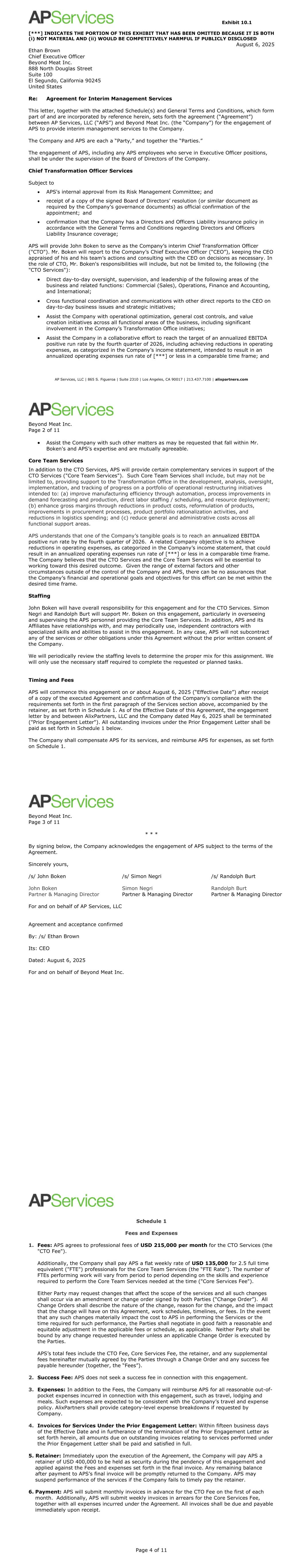 Exhibit 10.1 [***] INDICATES THE PORTION OF THIS EXHIBIT THAT HAS BEEN OMITTED BECAUSE IT IS BOTH (i) NOT MATERIAL AND (ii) WOULD BE COMPETITIVELY HARMFUL IF PUBLICLY DISCLOSED AP Services, LLC | 865 S. Figueroa | Suite 2310 | Los Angeles, CA 90017 | 213.437.7100 | alixpartners.com August 6, 2025 Ethan Brown Chief Executive Officer Beyond Meat Inc. 888 North Douglas Street Suite 100 El Segundo, California 90245 United States Re: Agreement for Interim Management Services This letter, together with the attached Schedule(s) and General Terms and Conditions, which form part of and are incorporated by reference herein, sets forth the agreement (“Agreement”) between AP Services, LLC (“APS”) and Beyond Meat Inc. (the “Company”) for the engagement of APS to provide interim management services to the Company. The Company and APS are each a “Party,” and together the “Parties.” The engagement of APS, including any APS employees who serve in Executive Officer positions, shall be under the supervision of the Board of Directors of the Company. Chief Transformation Officer Services Subject to  APS's internal approval from its Risk Management Committee; and  receipt of a copy of the signed Board of Directors’ resolution (or similar document as required by the Company's governance documents) as official confirmation of the appointment;  and  confirmation that the Company has a Directors and Officers Liability insurance policy in accordance with the General Terms and Conditions regarding Directors and Officers Liability Insurance coverage; APS will provide John Boken to serve as the Company’s interim Chief Transformation Officer ("CTO"). Mr. Boken will report to the Company’s Chief Executive Officer (“CEO”), keeping the CEO appraised of his and his team’s actions and consulting with the CEO on decisions as necessary. In the role of CTO, Mr. Boken's responsibilities will include, but not be limited to, the following (the "CTO Services"):  Direct day-to-day oversight, supervision, and leadership of the following areas of the business and related functions: Commercial (Sales), Operations, Finance and Accounting, and International;  Cross functional coordination and communications with other direct reports to the CEO on day-to-day business issues and strategic initiatives;  Assist the Company with operational optimization, general cost controls, and value creation initiatives across all functional areas of the business, including significant involvement in the Company’s Transformation Office initiatives;  Assist the Company in a collaborative effort to reach the target of an annualized EBITDA positive run rate by the fourth quarter of 2026, including achieving reductions in operating expenses, as categorized in the Company’s income statement, intended to result in an annualized operating expenses run rate of [***] or less in a comparable time frame; and Beyond Meat Inc. Page 2 of 11  Assist the Company with such other matters as may be requested that fall within Mr. Boken's and APS’s expertise and are mutually agreeable. Core Team Services In addition to the CTO Services, APS will provide certain complementary services in support of the CTO Services ("Core Team Services"). Such Core Team Services shall include, but may not be limited to, providing support to the Transformation Office in the development, analysis, oversight, implementation, and tracking of progress on a portfolio of operational restructuring initiatives intended to: (a) improve manufacturing efficiency through automation, process improvements in demand forecasting and production, direct labor staffing / scheduling, and resource deployment; (b) enhance gross margins through reductions in product costs, reformulation of products, improvements in procurement processes, product portfolio rationalization activities, and reductions in logistics spending; and (c) reduce general and administrative costs across all functional support areas. APS understands that one of the Company’s tangible goals is to reach an annualized EBITDA positive run rate by the fourth quarter of 2026. A related Company objective is to achieve reductions in operating expenses, as categorized in the Company’s income statement, that could result in an annualized operating expenses run rate of [***] or less in a comparable time frame. The Company believes that the CTO Services and the Core Team Services will be essential to working toward this desired outcome. Given the range of external factors and other circumstances outside of the control of the Company and APS, there can be no assurances that the Company’s financial and operational goals and objectives for this effort can be met within the desired time frame. Staffing John Boken will have overall responsibility for this engagement and for the CTO Services. Simon Negri and Randolph Burt will support Mr. Boken on this engagement, particularly in overseeing and supervising the APS personnel providing the Core Team Services. In addition, APS and its Affiliates have relationships with, and may periodically use, independent contractors with specialized skills and abilities to assist in this engagement. In any case, APS will not subcontract any of the services or other obligations under this Agreement without the prior written consent of the Company. We will periodically review the staffing levels to determine the proper mix for this assignment. We will only use the necessary staff required to complete the requested or planned tasks. Timing and Fees APS will commence this engagement on or about August 6, 2025 (“Effective Date”) after receipt of a copy of the executed Agreement and confirmation of the Company’s compliance with the requirements set forth in the first paragraph of the Services section above, accompanied by the retainer, as set forth in Schedule 1. As of the Effective Date of this Agreement, the engagement letter by and between AlixPartners, LLC 